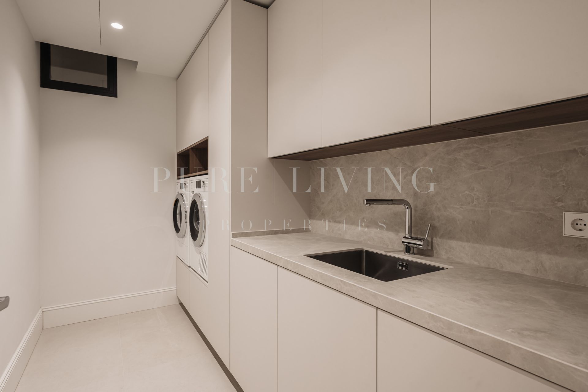 En tres niveles, esta villa alberga cinco dormitorios, cada uno adornado con una paleta de serenos tonos neutros y estética atemporal. La suite principal, que ocupa la primera planta, es un santuario de lujoso confort, adornado con un opulento mobiliario, un intrincado diseño interior y una carpintería impecable. El resto de dormitorios, estratégicamente situados en la planta baja y en los niveles inferiores, ofrecen cautivadoras vistas del jardín meticulosamente ajardinado.