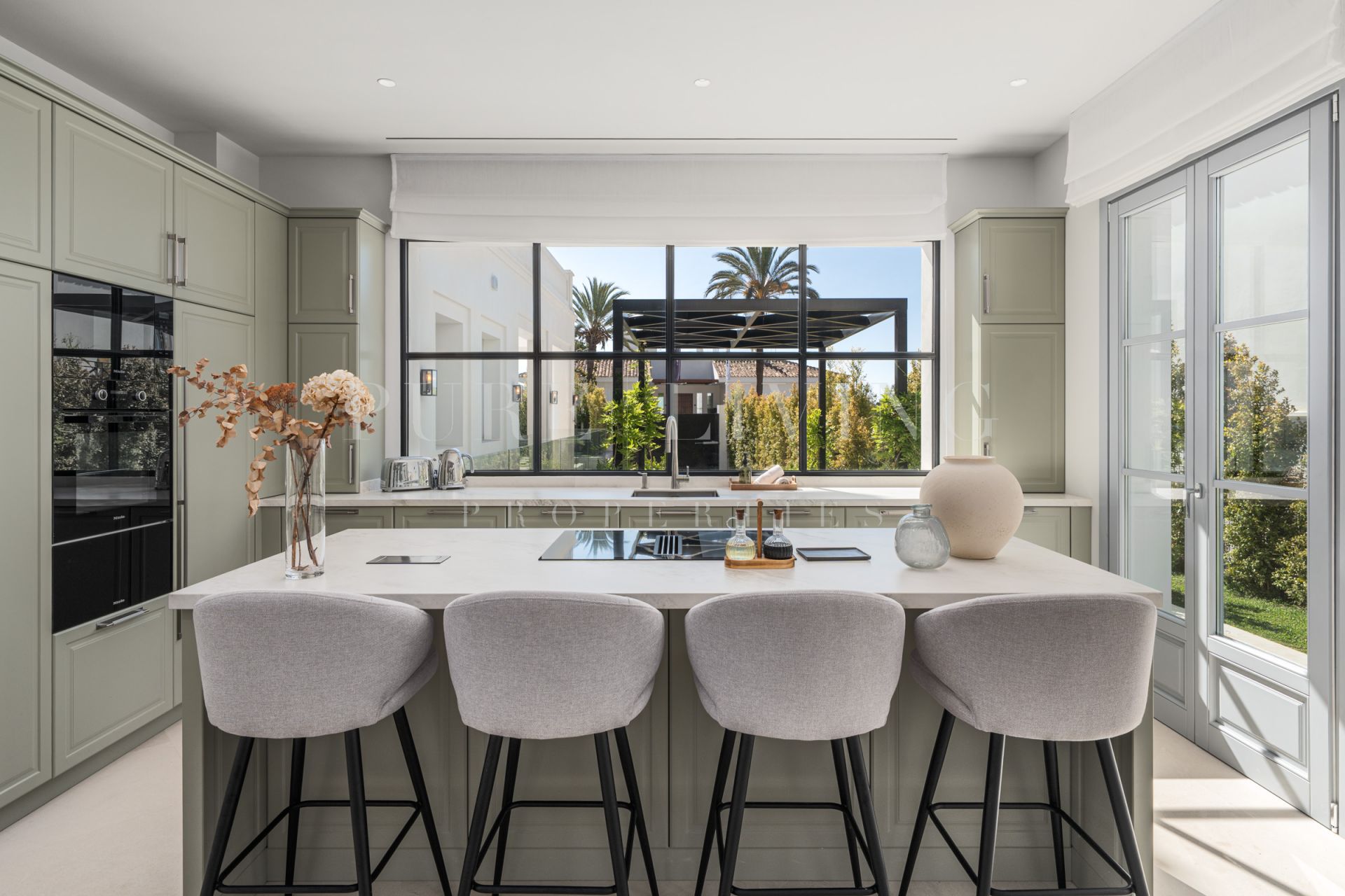 Internamente, la villa cuenta con techos altos y una cocina meticulosamente equipada, con electrodomésticos de alta gama y amplio espacio de almacenamiento. La cocina, que se extiende perfectamente a una zona de estar al aire libre y una barbacoa, ofrece versátiles posibilidades culinarias en un ambiente de lujo refinado.