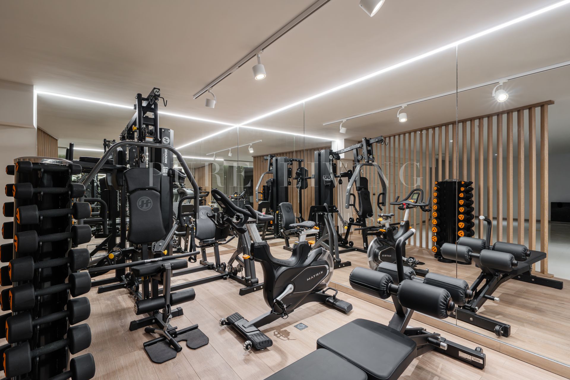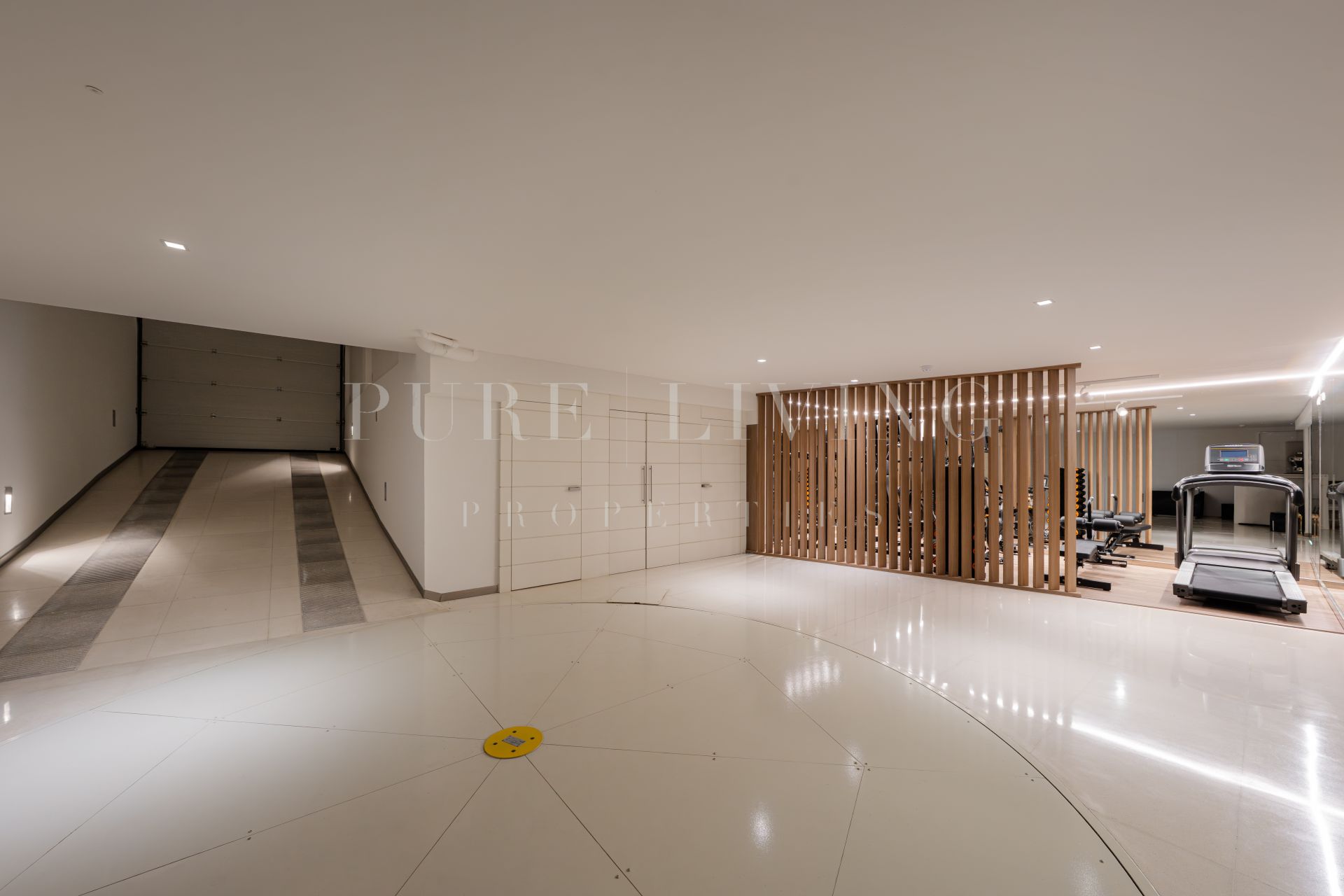 La planta inferior se destina al ocio y bienestar, incluyendo sala de cine, zona de bar, gimnasio y sauna, permitiendo que las zonas principales se mantengan despejadas y serenas.