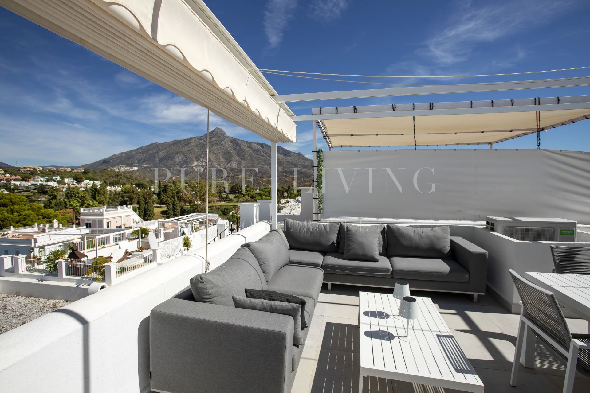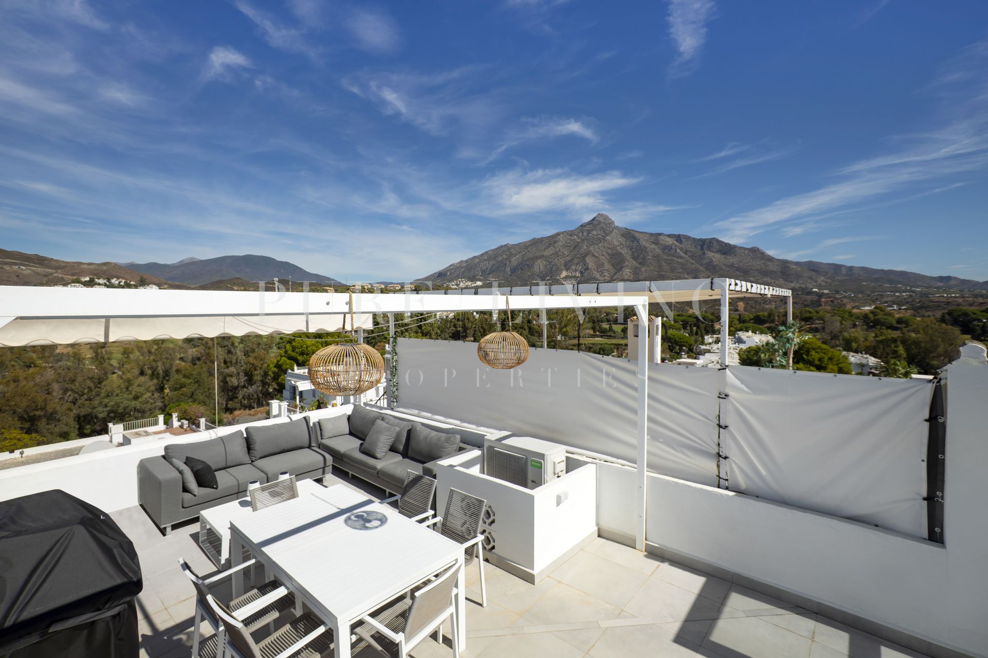 Situé à flanc de montagne, le penthouse jouit d’une vue panoramique sur la mer, les montagnes majestueuses et les terrains de golf luxuriants, créant ainsi un cadre idyllique pour se détendre ou se divertir. Les terrasses spacieuses, couvertes ou non, sont parfaites pour les repas en plein air, pour se détendre au soleil ou pour organiser des réunions entre amis, avec un barbecue intégré.