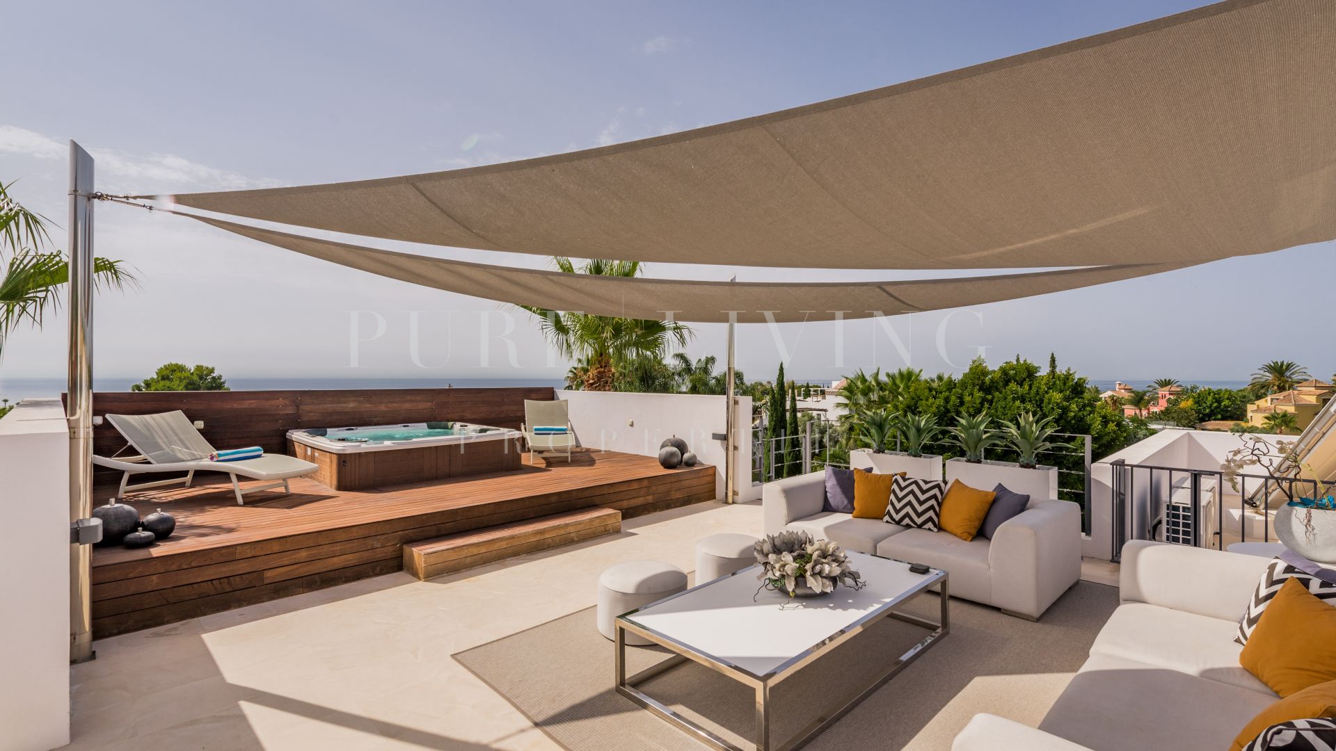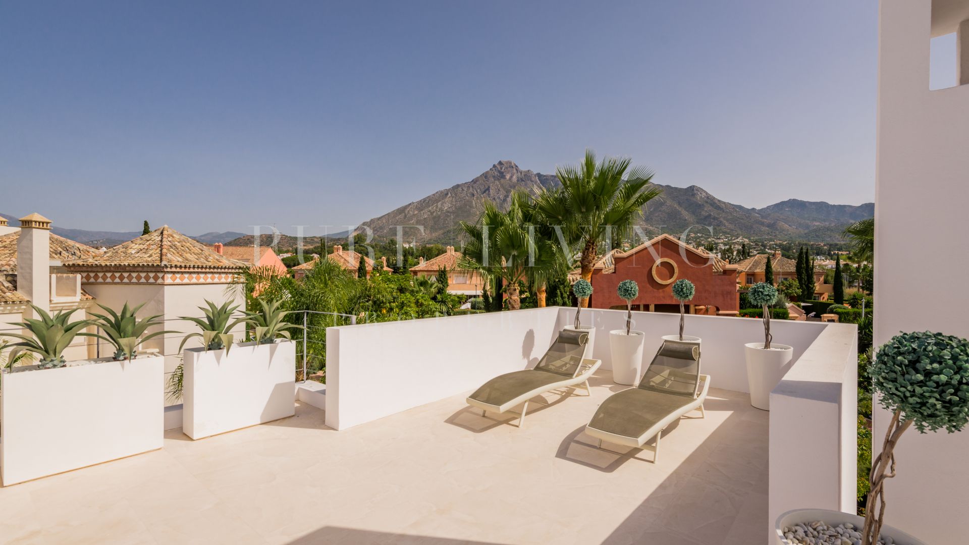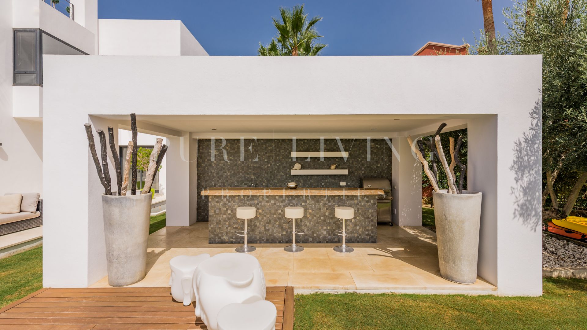 Cette magnifique villa est située dans un complexe résidentiel fermé offrant sécurité 24h/24, à seulement 10 minutes en voiture du port de Puerto Banús et du charmant vieux centre-ville de Marbella.