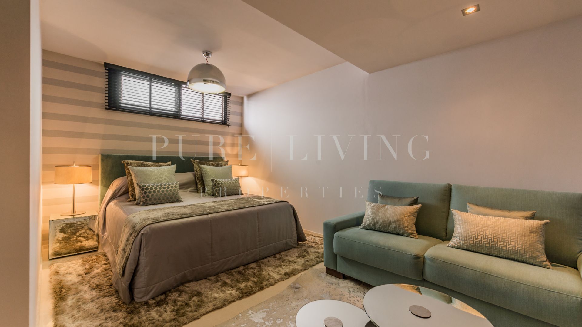 La villa dispose de vastes espaces de vie et de salle à manger qui s’ouvrent sur les terrasses et les jardins paysagers, comprenant une piscine chauffée à l’eau salée et une élégante zone de barbecue. À l’entrée, vous trouverez un hall d’entrée avec des toilettes pour invités. La cuisine moderne, entièrement équipée, mène à un salon décoré avec des meubles de haute qualité. À ce niveau, une grande suite pour invités avec terrasse privée donne accès au jardin.