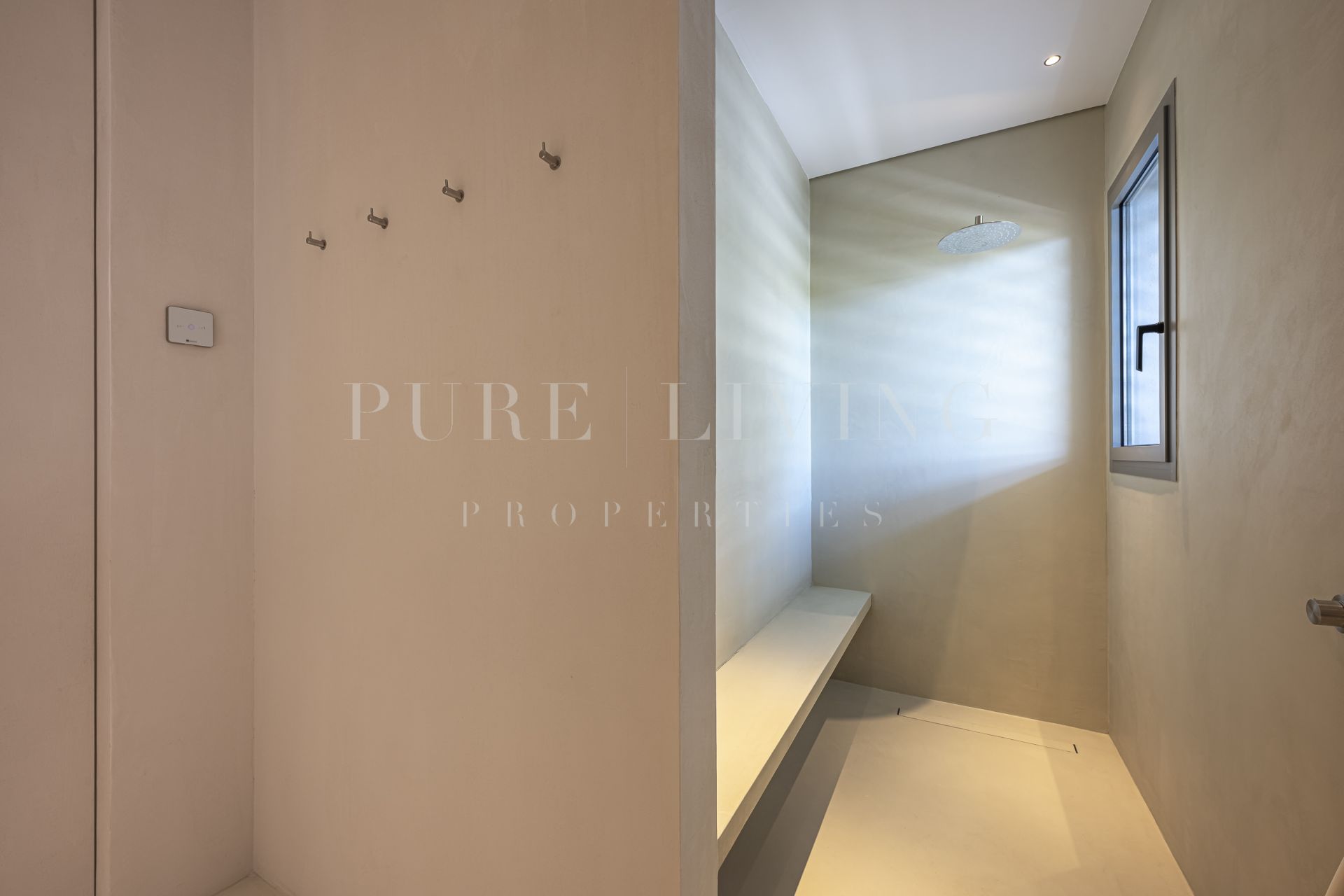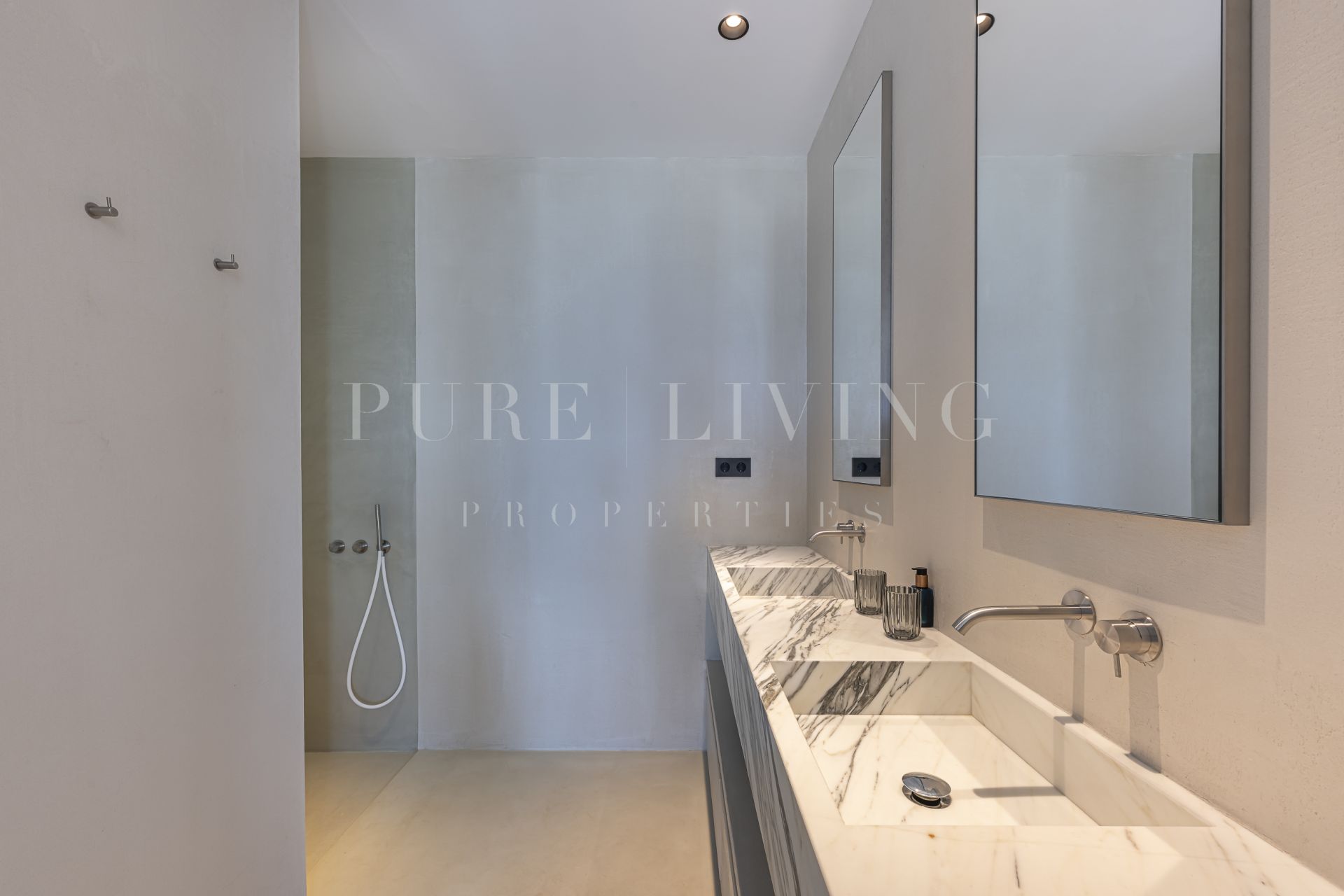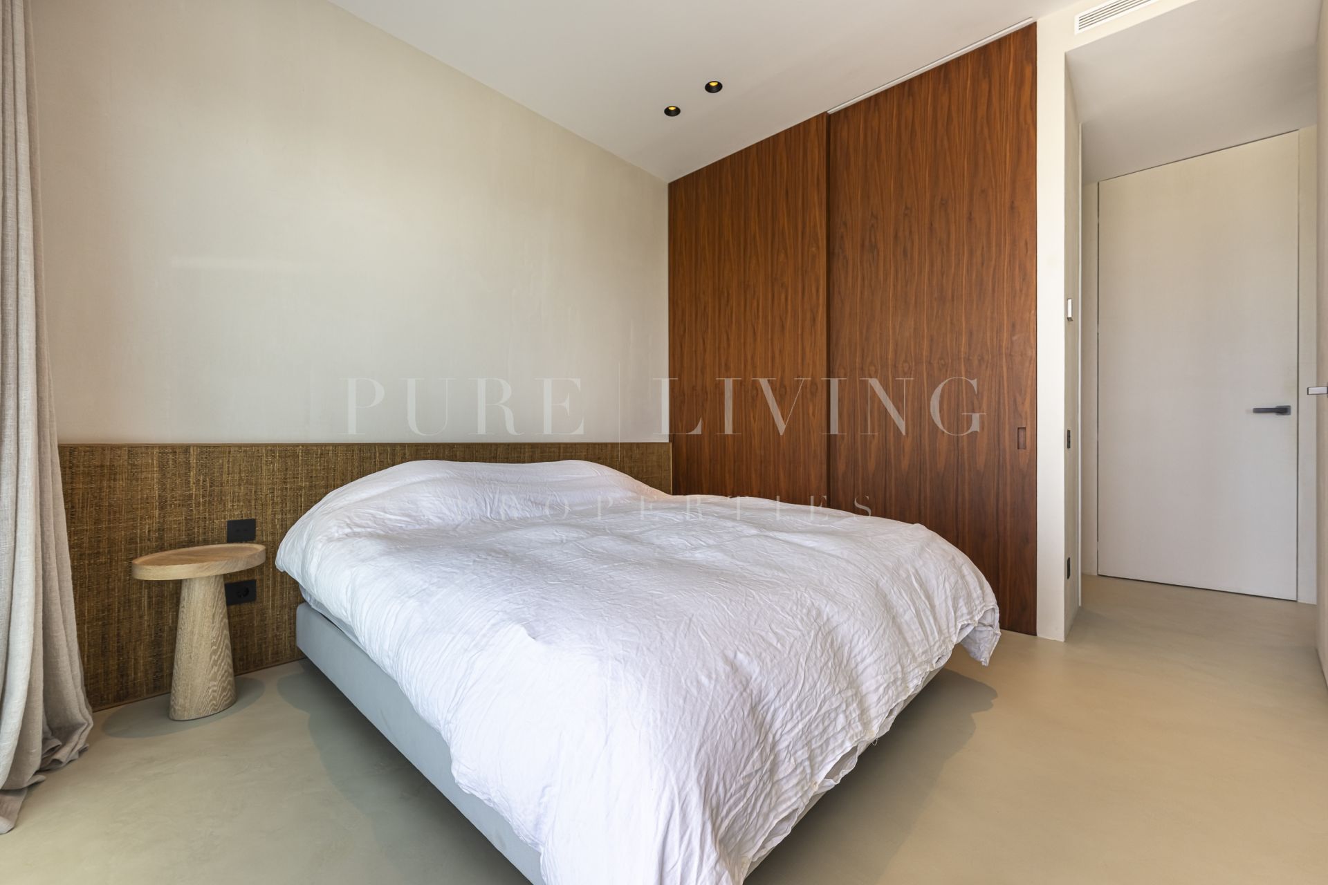 La domotique de pointe permet de contrôler aisément le chauffage, l’éclairage, les volets électriques, le chauffage au sol et la climatisation. L’appartement maintient un confort idéal tout au long de l’année, grâce aux systèmes climatiques Daikin & Airzone et au chauffage au sol à circulation d’eau.