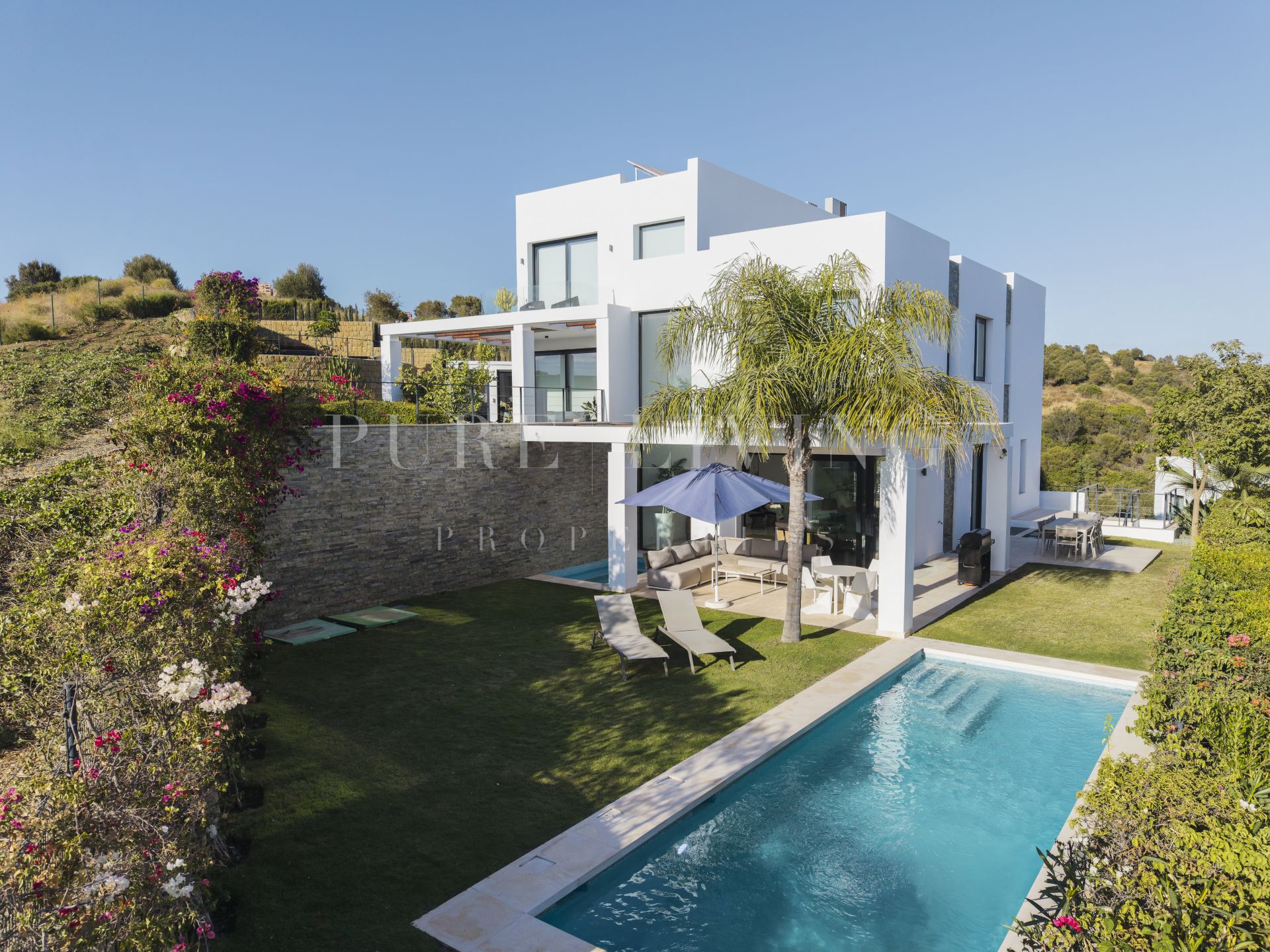 Cette élégante villa est située au sein d’une résidence fermée et exclusive de seulement 14 propriétés, surplombant le golf de Cabopino, à l’est de Marbella. Le domaine offre un cadre paisible et intime, niché sur une colline verdoyante, tout en restant à proximité immédiate de toutes les commodités.
