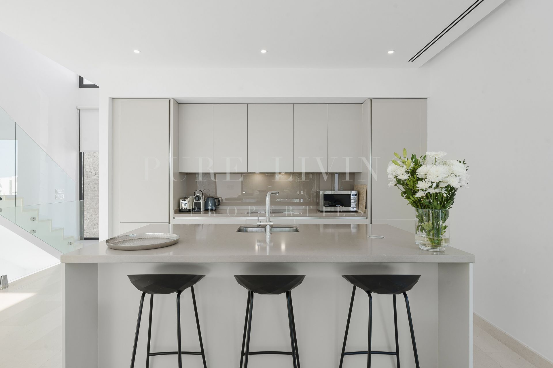 Dès l’entrée, la villa séduit par ses volumes lumineux et son agencement ouvert. Le rez-de-chaussée relie harmonieusement la cuisine moderne aux vastes espaces salon et salle à manger, avec un accès direct à une élégante terrasse, un jardin paysager et une piscine accueillante. Une piscine de type plunge pool, située à proximité de la terrasse, constitue un espace supplémentaire idéal pour se détendre au soleil.