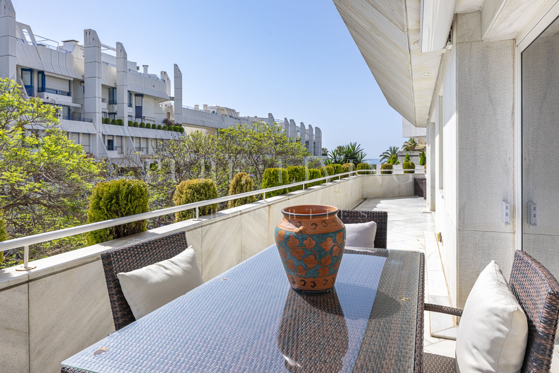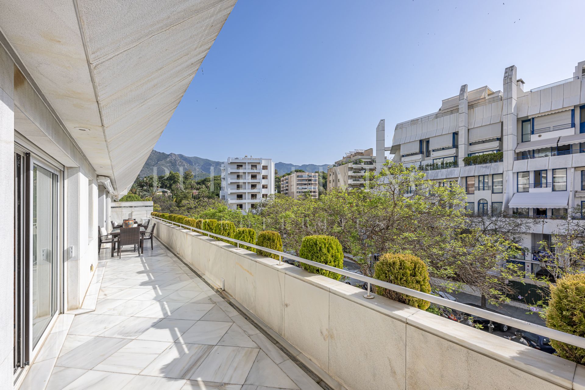 Spacieux et élégant appartement de 4 chambres dans une communauté fermée de Marbella, à quelques pas de la plage, avec terrasse panoramique, vue sur la montagne et la mer et équipements haut de gamme.