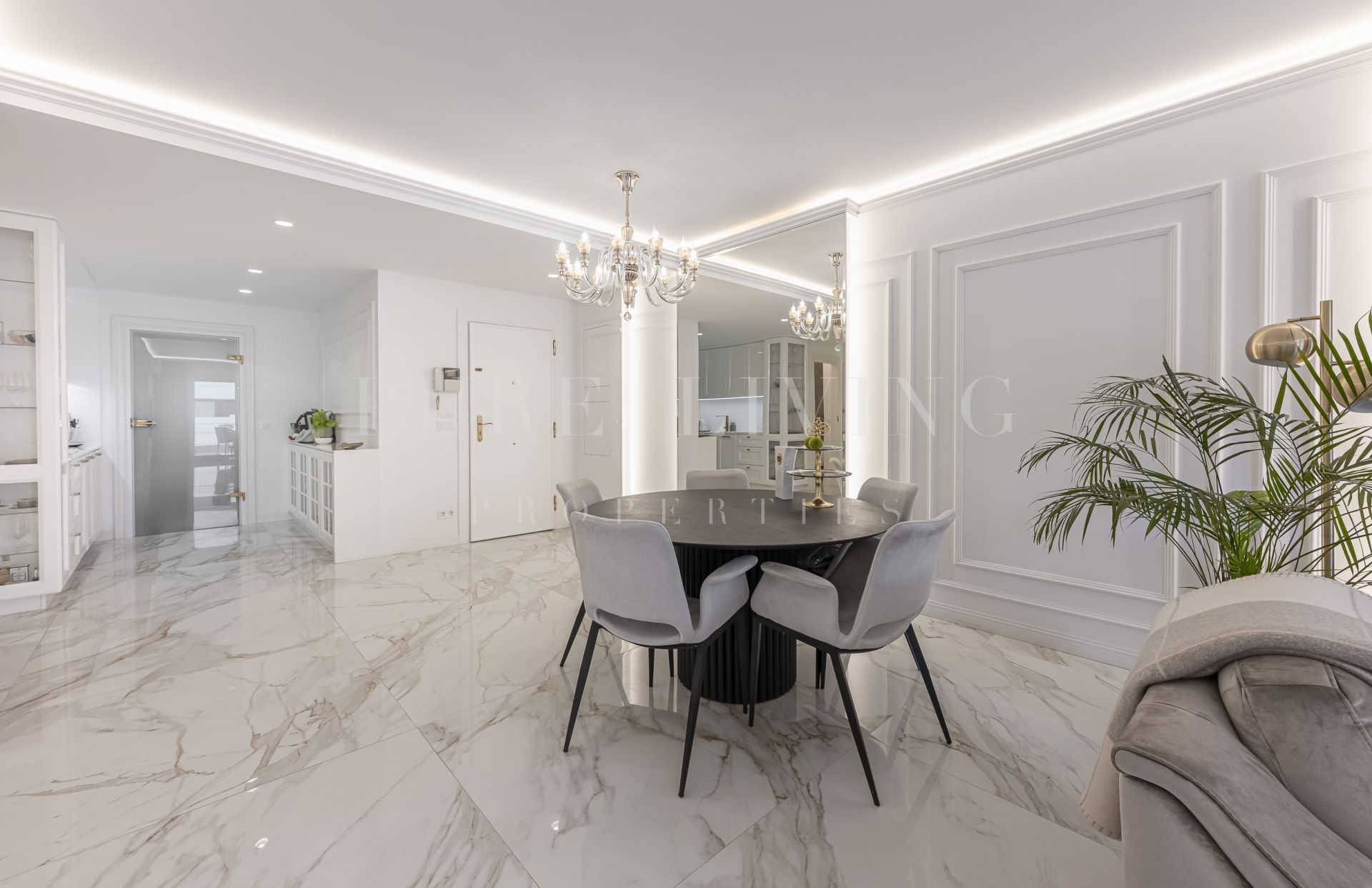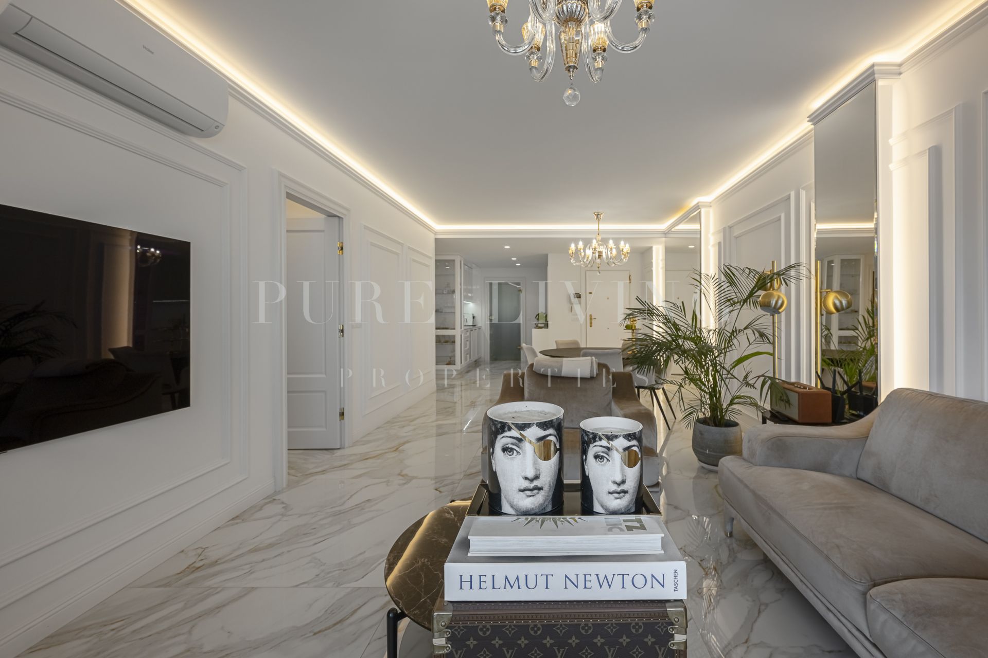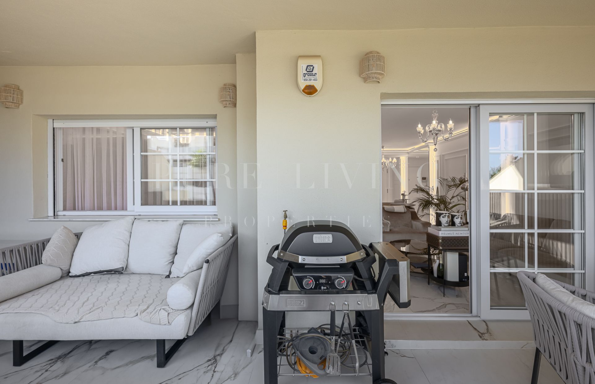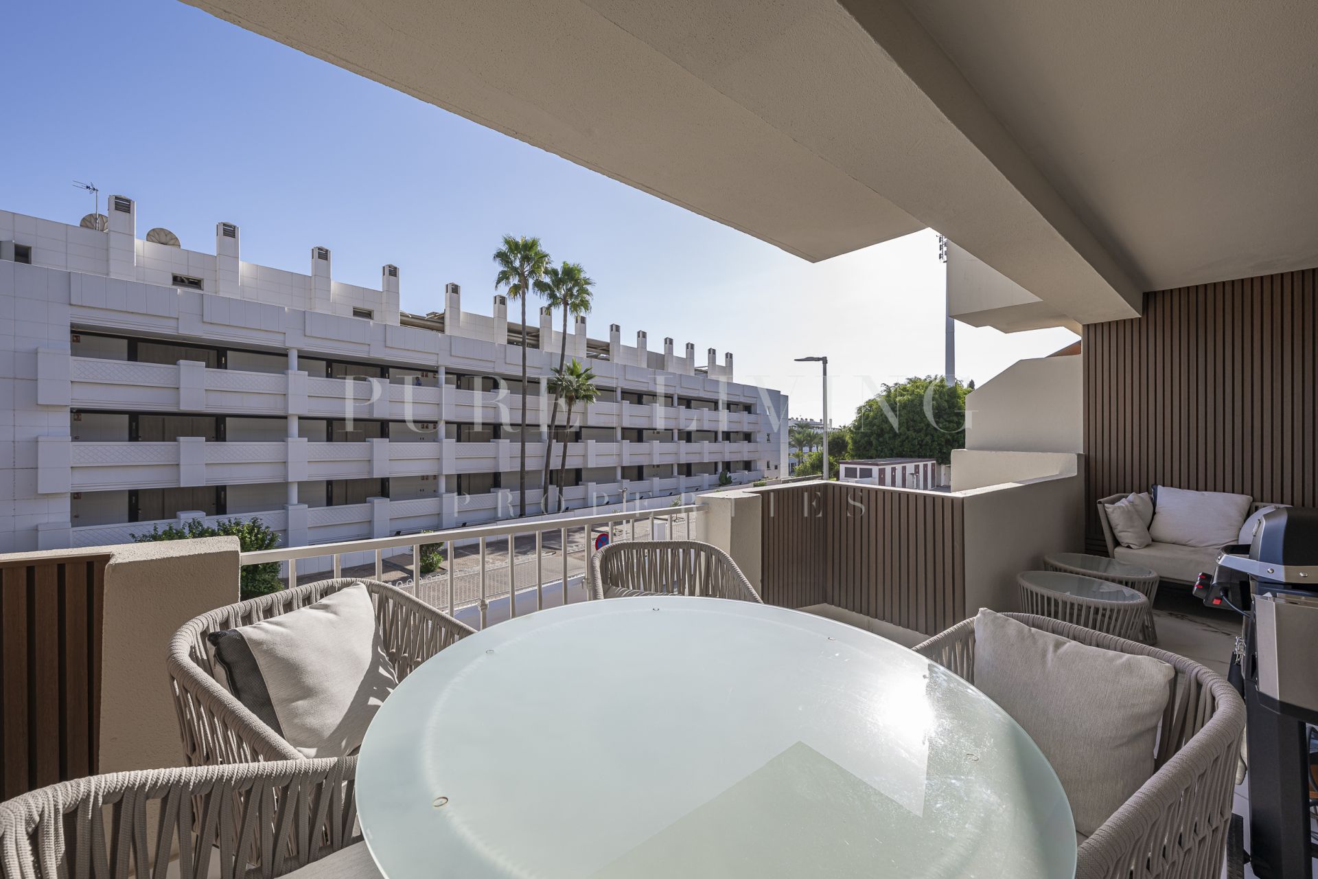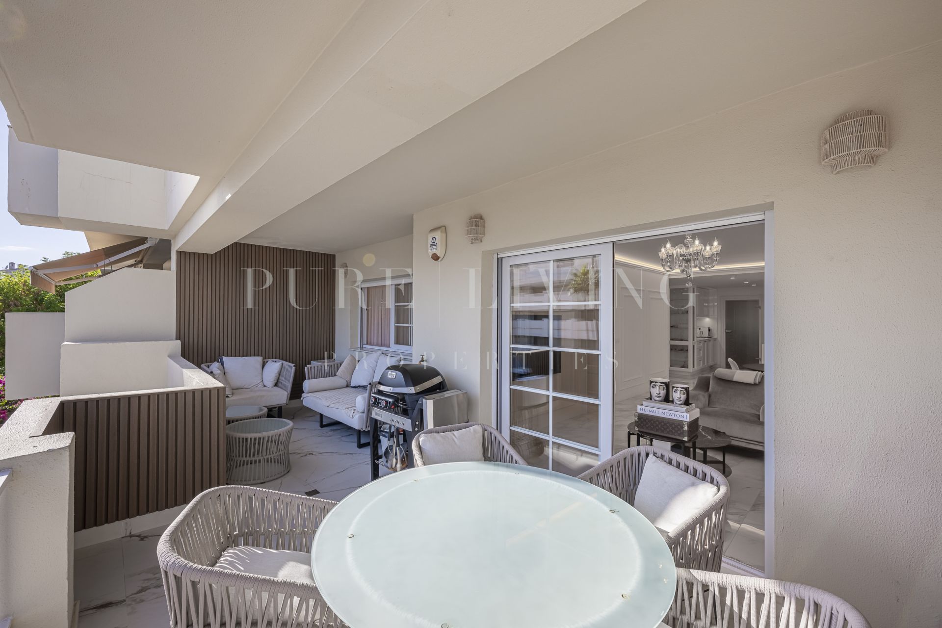 Rénové selon des normes élevées, l’appartement est présenté en excellent état et est entièrement meublé. Il dispose d’une cuisine moderne entièrement équipée avec des appareils de qualité et un espace de rangement généreux. Les espaces de vie spacieux et bien conçus comprennent la climatisation et des fenêtres à double vitrage, assurant à la fois confort et fonctionnalité. La propriété bénéficie également d’une terrasse privée et d’une terrasse couverte, parfaites pour vivre et recevoir en plein air toute l’année.