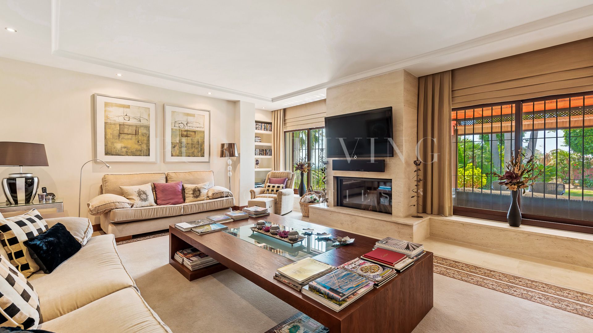 Climatisation, Entièrement meublé, Vue mer, Cuisine entièrement adaptée, Cheminée, Golf à proximité, Terrasse découverte, Cave, Entrepôt, Salle de gym, Alarme, Terrasse couverte, Meubles en option, Double vitrage, Placards, Excellent état, Bon état, Vue sur le jardin.