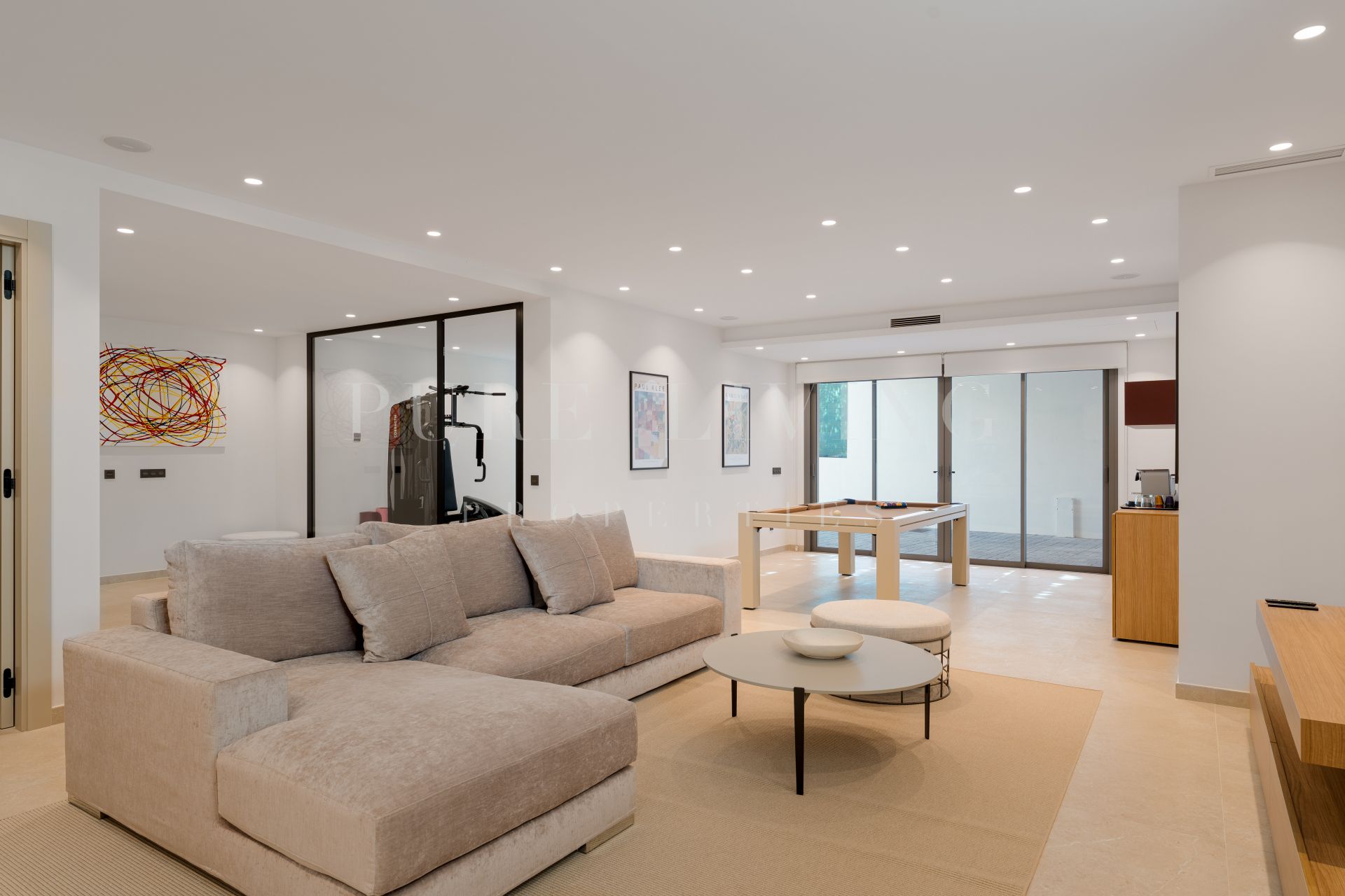Située dans le prestigieux quartier de La Cerquilla à Nueva Andalucía, cette villa élégante de cinq chambres allie design contemporain, luxe moderne et élégance fonctionnelle. Entièrement rénovée en 2025, la propriété a été pensée pour maximiser la lumière, le confort et le style dans chaque espace.