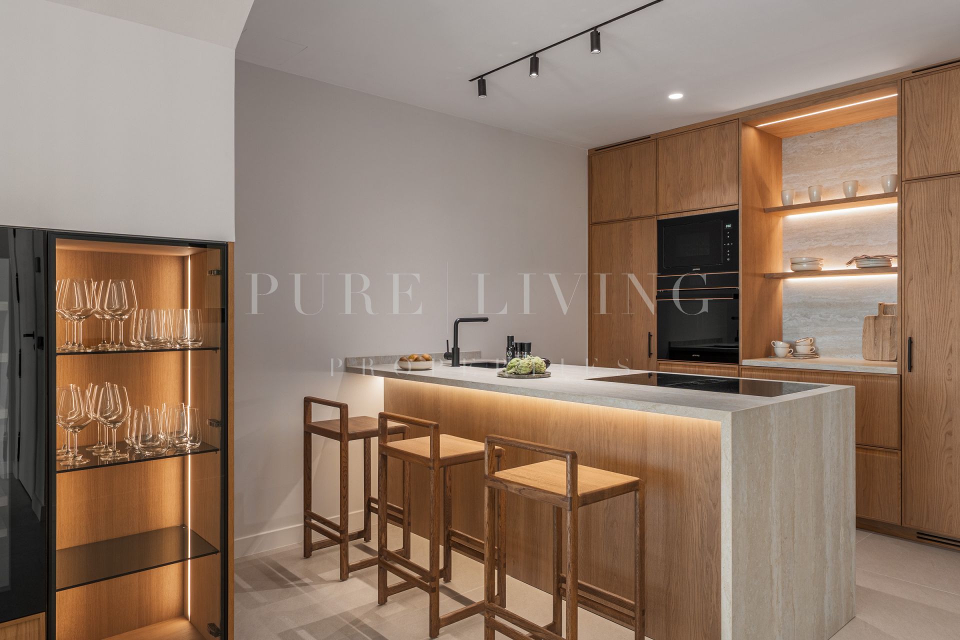 Avec une superficie construite de 212 m², la propriété comprend trois chambres, trois salles de bains (dont deux en suite), des toilettes invités, ainsi qu’un vaste solarium sur le toit de 49 m² avec vue panoramique sur la mer et la montagne de La Concha. La cuisine, conçue par un studio danois, est équipée d’appareils Smeg, d’une cave à vin et d’un bar intégré. Le salon ouvert, centré autour d’une cheminée au bioéthanol de la marque Pureline, s’ouvre sur une terrasse-jardin privée avec barbecue intégré — idéale pour recevoir.