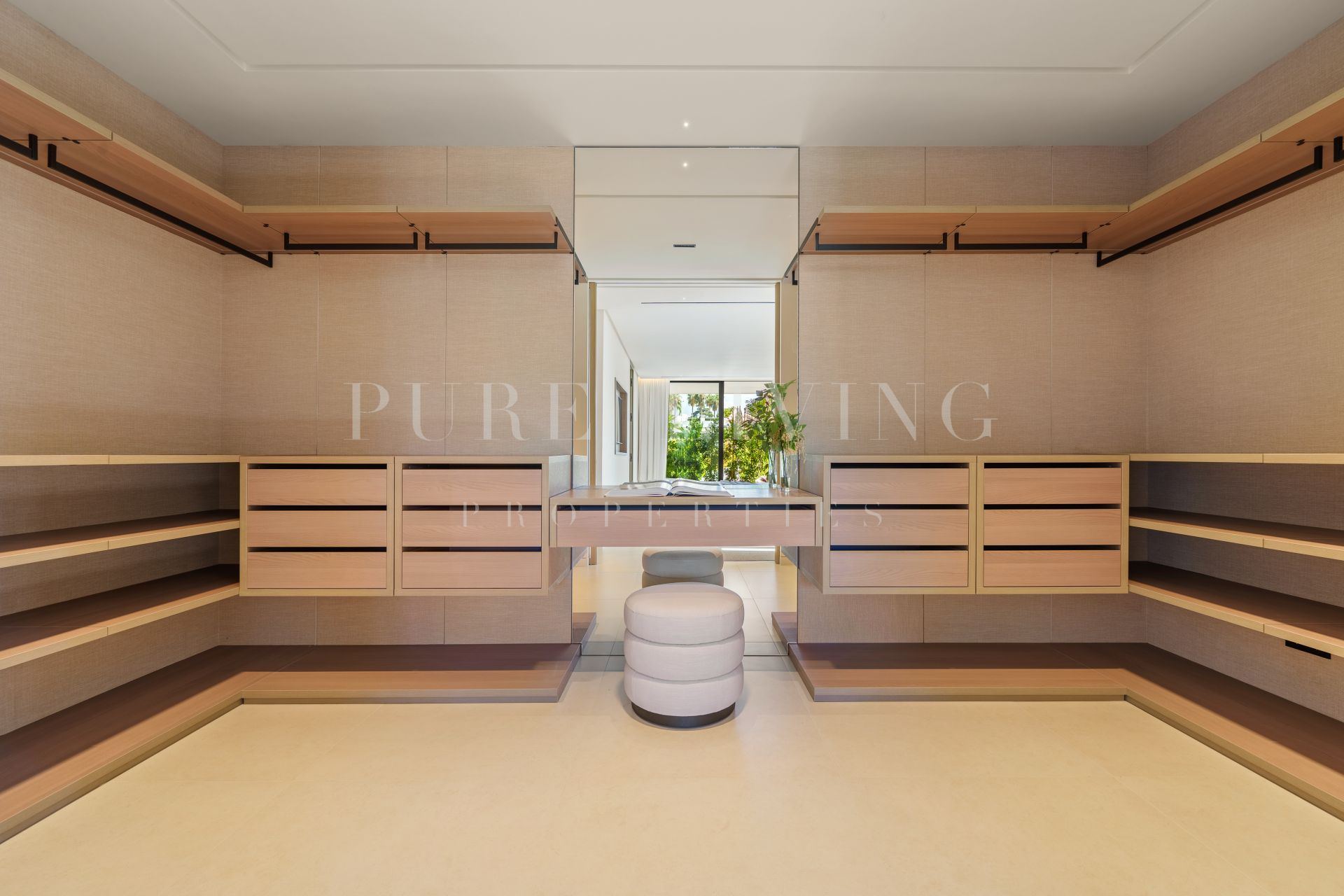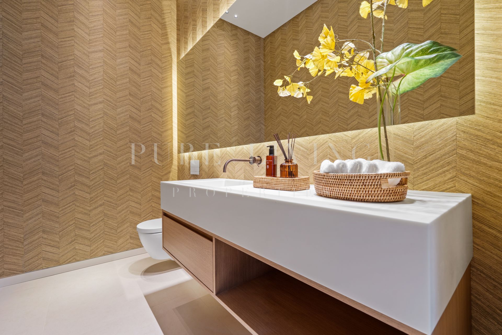 En entrant, vous découvrez un vaste salon et une cuisine qui s’ouvrent sans effort sur de grandes terrasses et le jardin. La cuisine sophistiquée, en bois clair, surplombe le séjour et la salle à manger, créant une circulation fluide idéale pour recevoir. Ce niveau comprend également une chambre d’invités avec salle de bain attenante et accès à sa terrasse privée. Au premier étage, trois chambres vous attendent. Deux suites d’invités ont accès à la terrasse du premier étage. La suite principale est un véritable havre de tranquillité, avec un design serein, un dressing et une salle de bain luxueuse équipée d’une douche pluie et d’une baignoire indépendante.