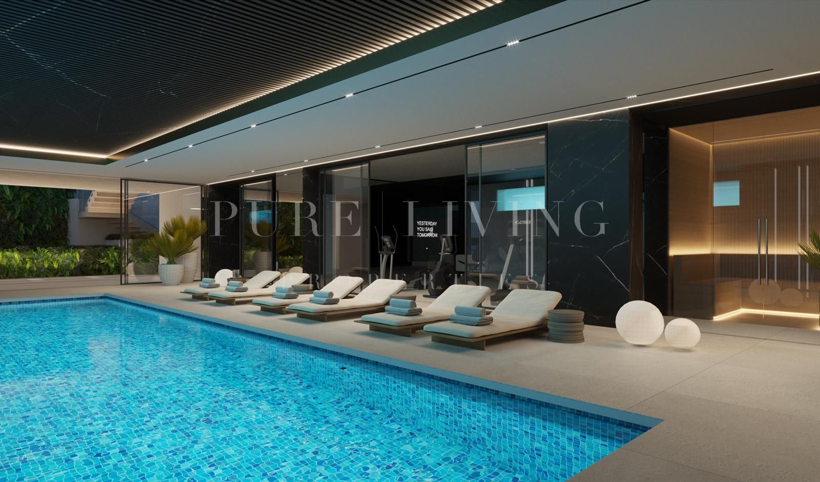 Le niveau inférieur comprend une chambre pour le personnel/les invités en suite, une salle de cinéma, une salle de divertissement, une salle de sport, un SPA, un sauna, un hammam, une salle de massage, une piscine intérieure, une buanderie, un garage pour deux voitures, un vestiaire pour les invités et un ascenseur reliant les trois niveaux. La villa bénéficie de grandes terrasses extérieures couvertes et non couvertes, d’une piscine à débordement, d’un jardin soigné et d’un abri pour trois voitures supplémentaires.