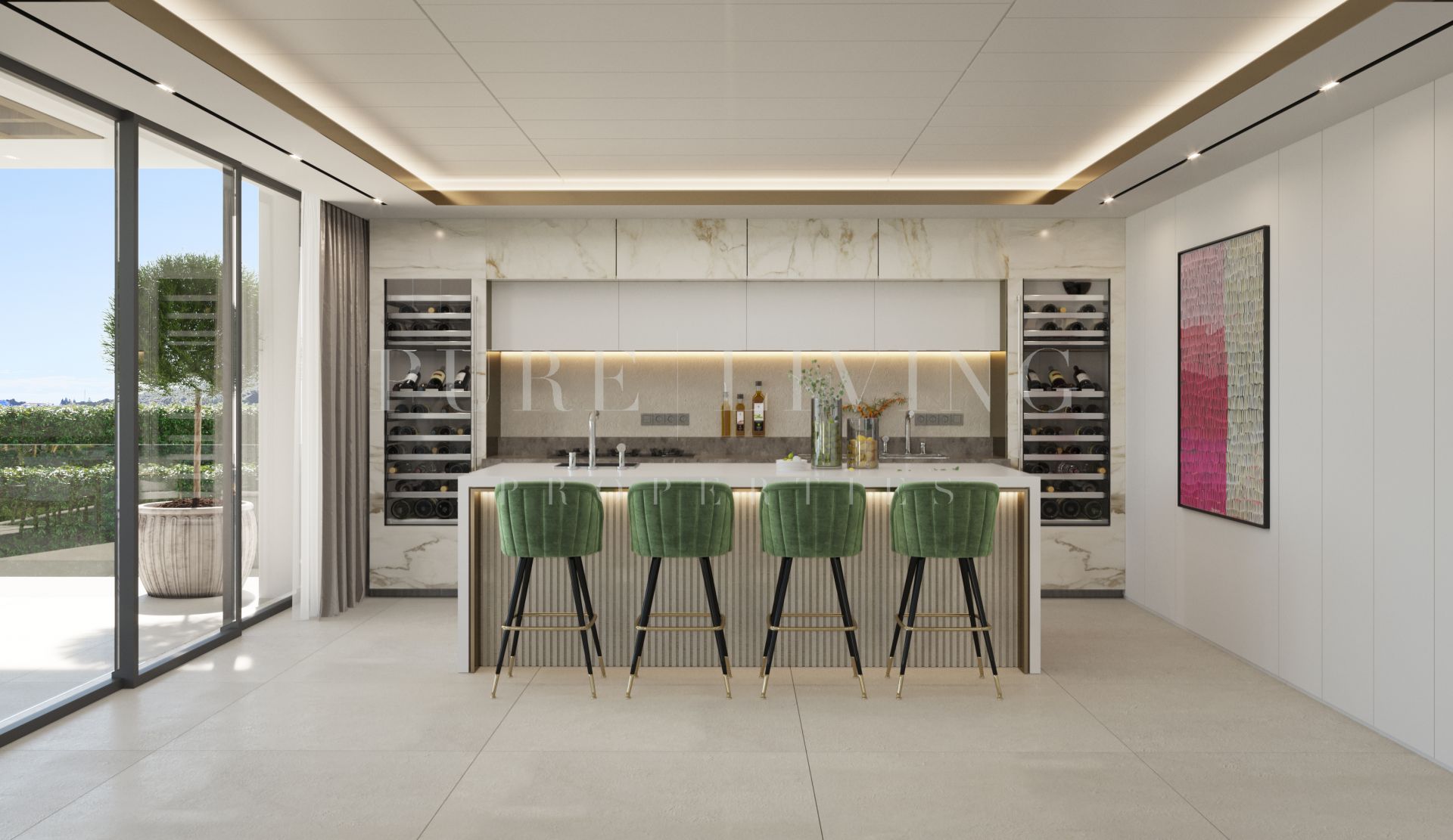 Le niveau d’entrée se compose d’un salon ouvert avec cheminée, d’une élégante salle à manger, d’une cuisine entièrement équipée, d’un garde-manger, d’un bureau, d’une chambre d’amis en suite et d’un vestiaire pour les invités. Le niveau supérieur se compose d’une chambre principale en suite, d’un dressing et de deux autres chambres en suite, toutes dotées de terrasses privées avec vue imprenable sur le golf.