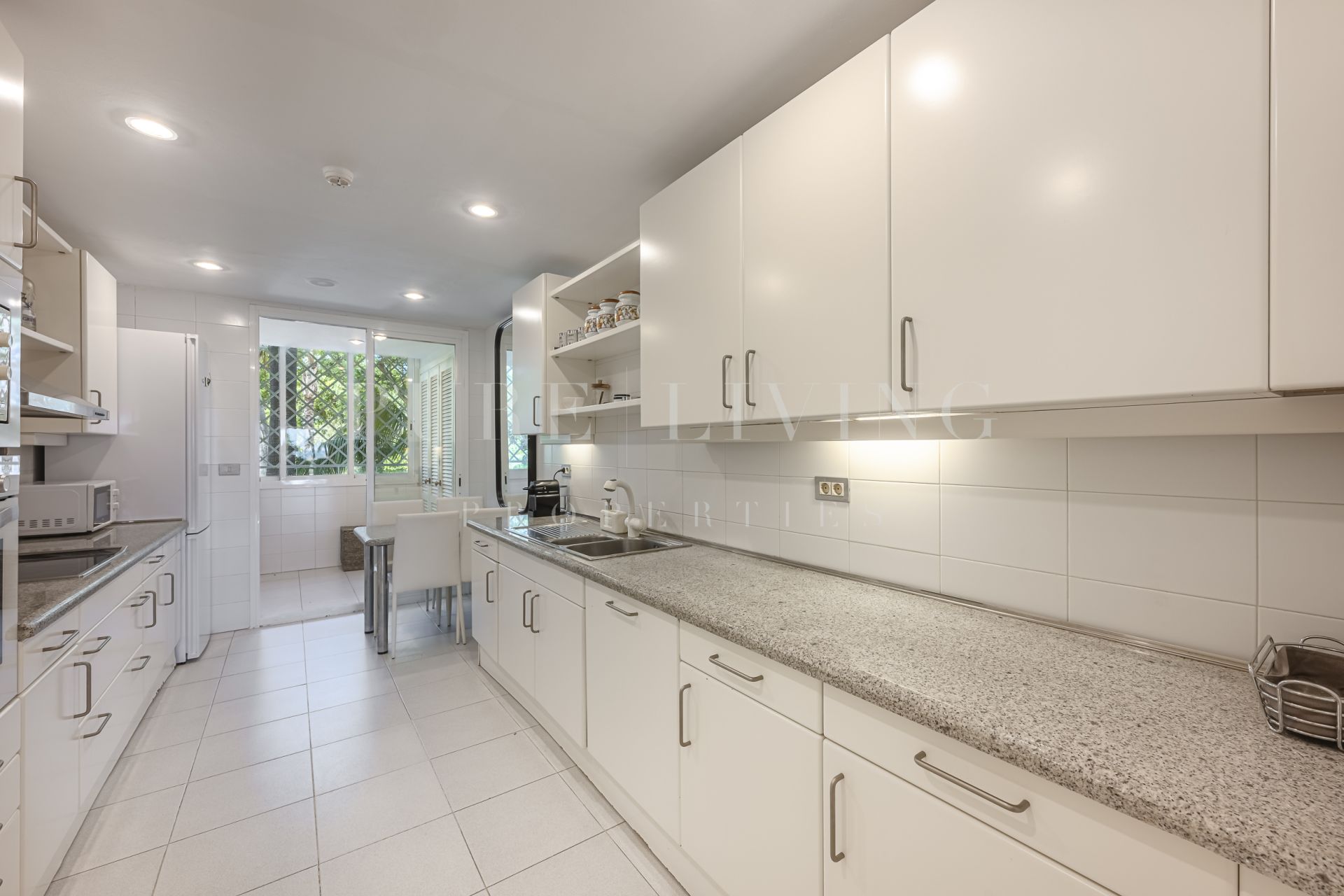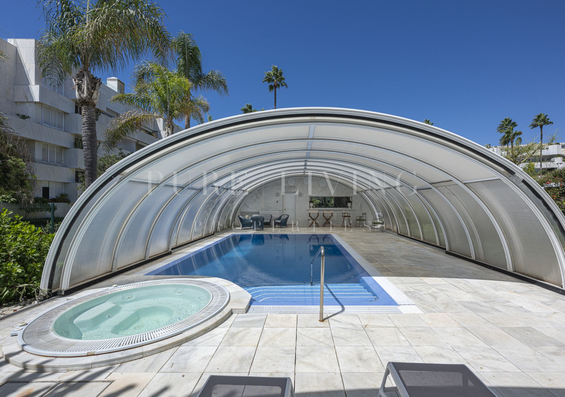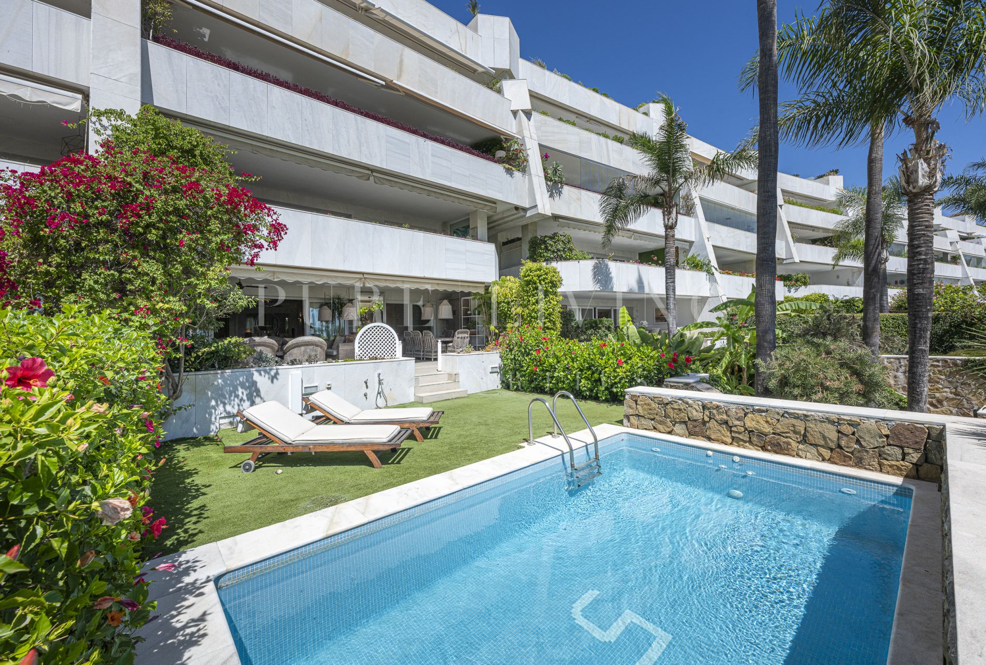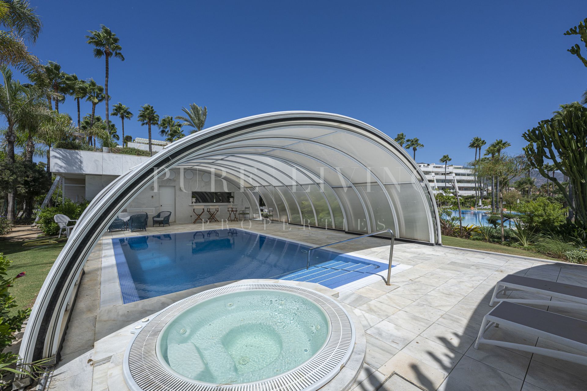 Découvrez votre jardin et votre piscine privés, parfaits pour se détendre ou recevoir, tandis que les terrasses couvertes et découvertes offrent des espaces de vie extérieurs polyvalents. L’appartement offre d’excellentes finitions, avec des sols en marbre, des portes vitrées, des placards intégrés et une cuisine entièrement équipée avec buanderie attenante.