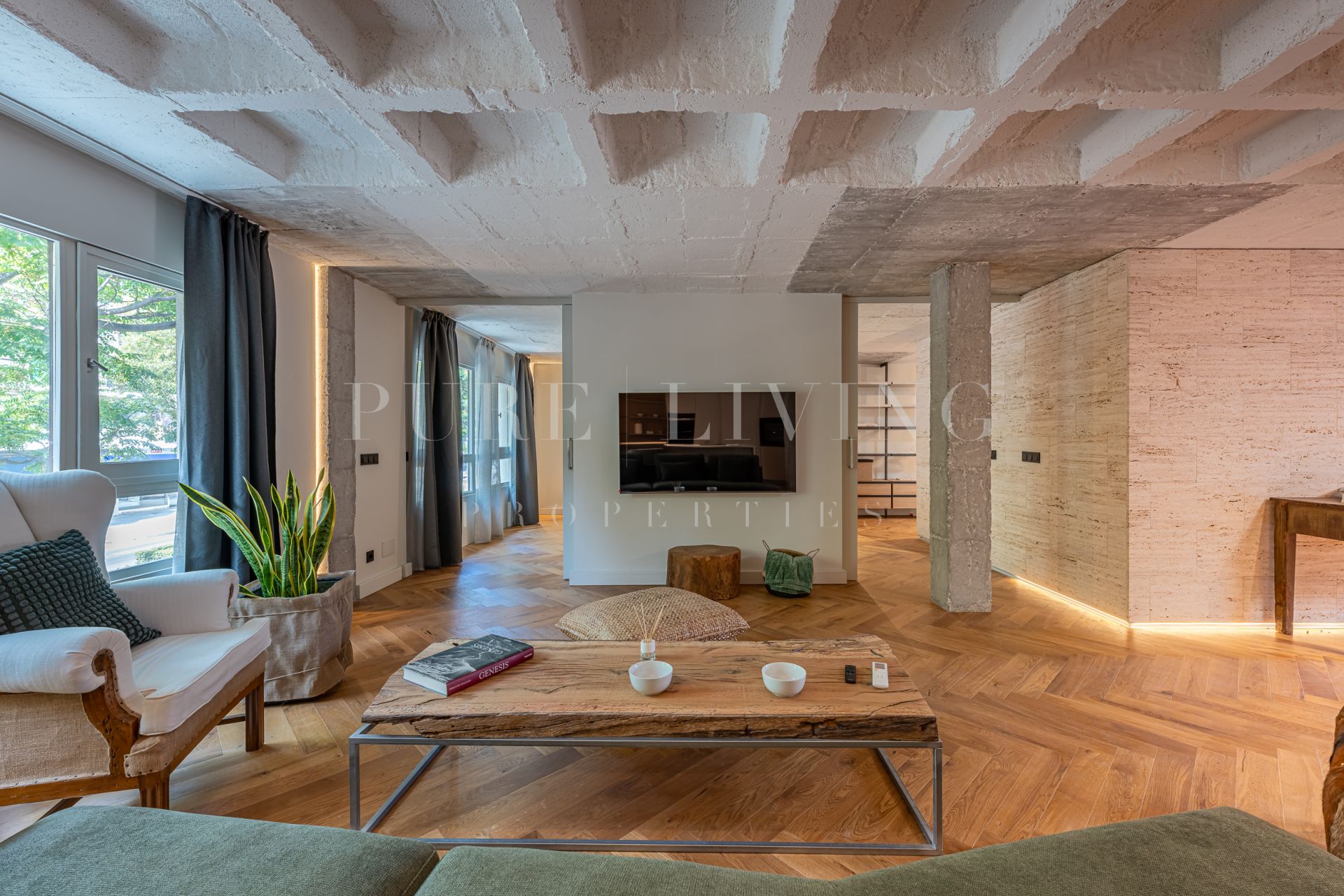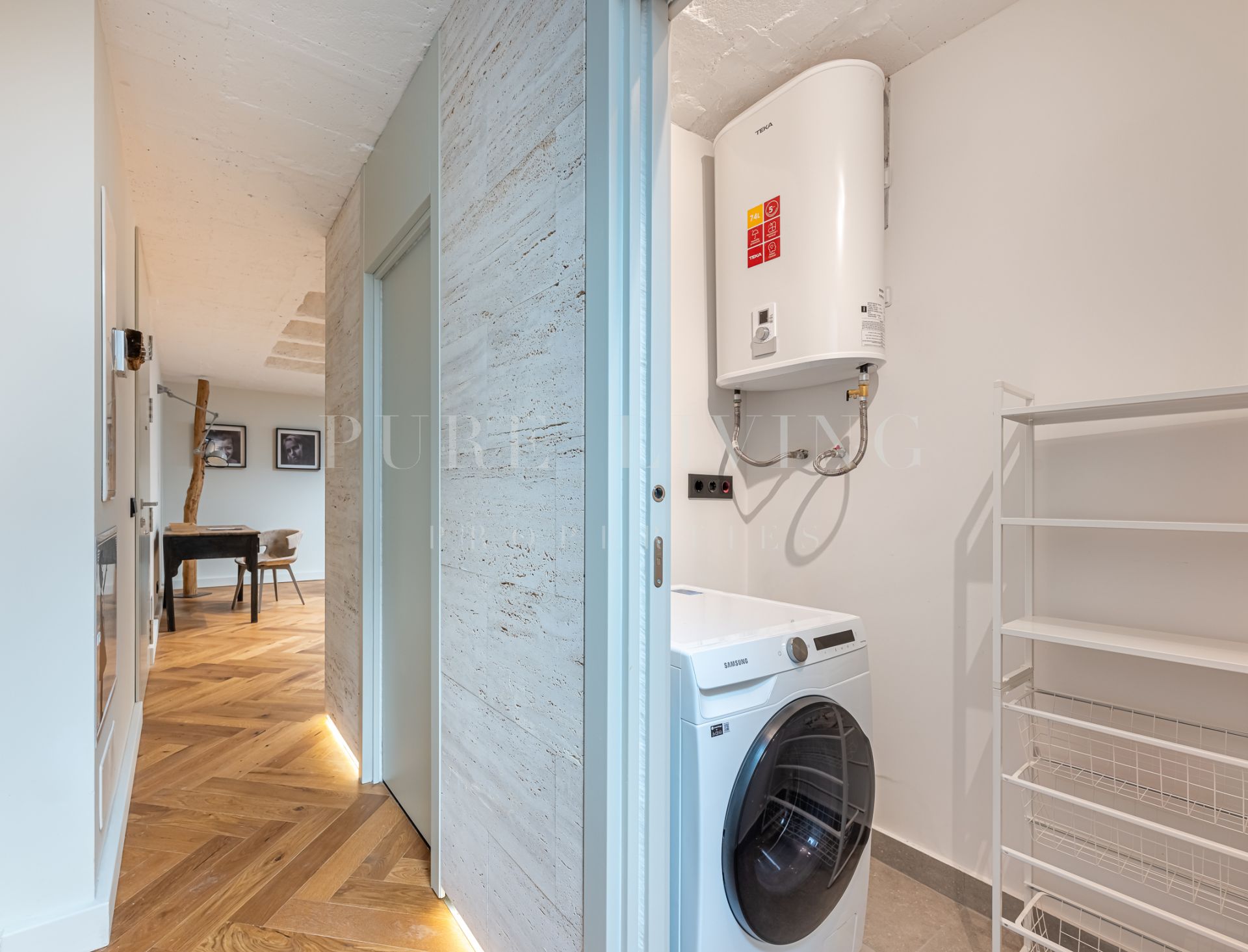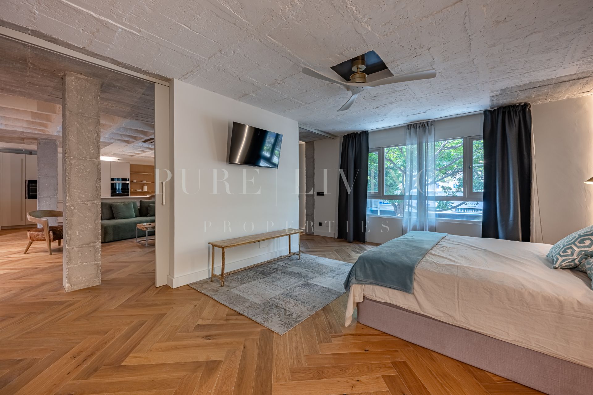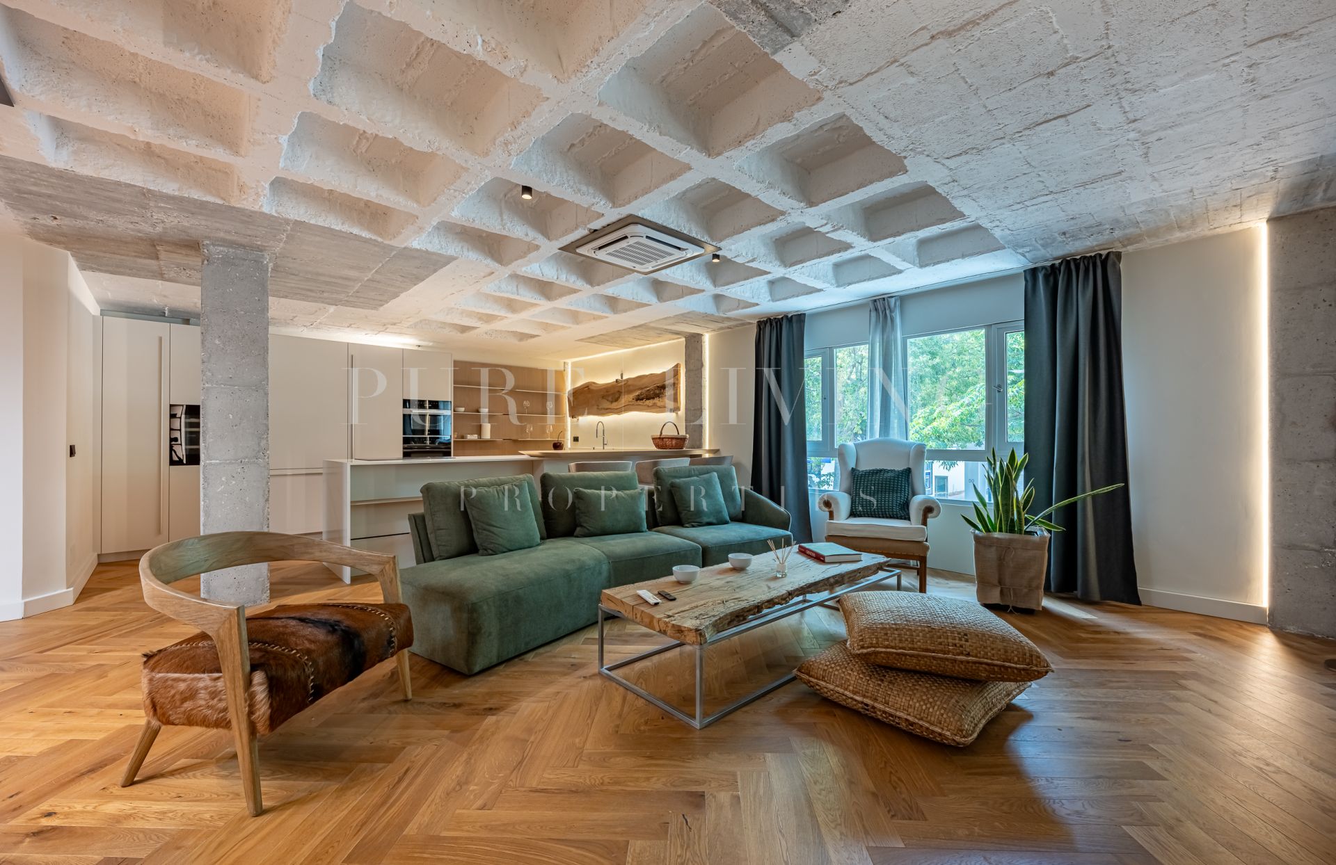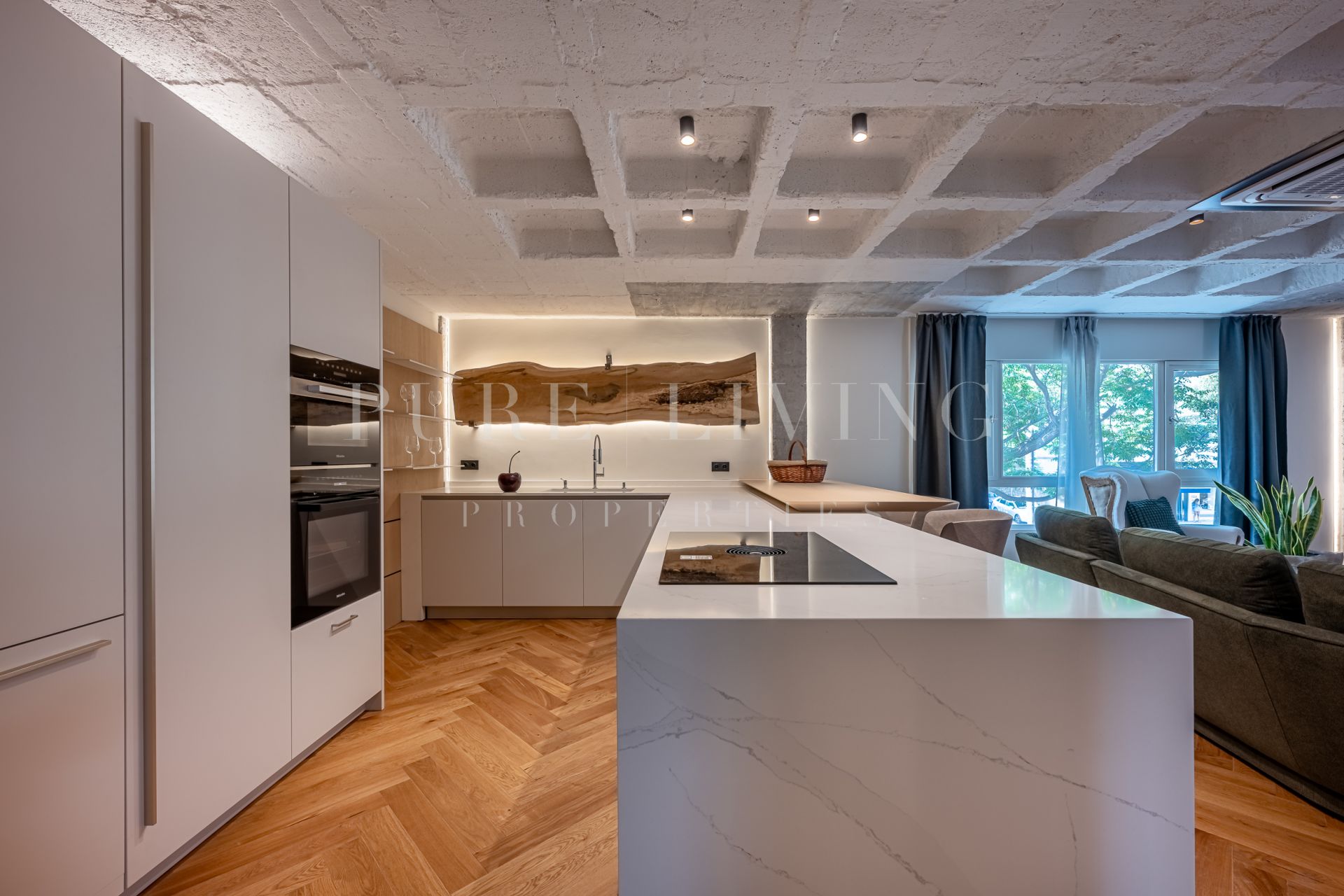 Récemment rénové avec un style contemporain impeccable, ce loft se distingue par son exclusivité et son design méticuleux. Avec une entrée privée et indépendante, ce refuge urbain offre une atmosphère de totale intimité. En entrant, vous êtes accueilli par un salon spacieux qui s’intègre parfaitement à une cuisine haut de gamme. Au centre, une île de cuisine design s’impose comme le point focal, équipée de détails exquis, y compris une cave à vin conçue pour les palais les plus exigeants.