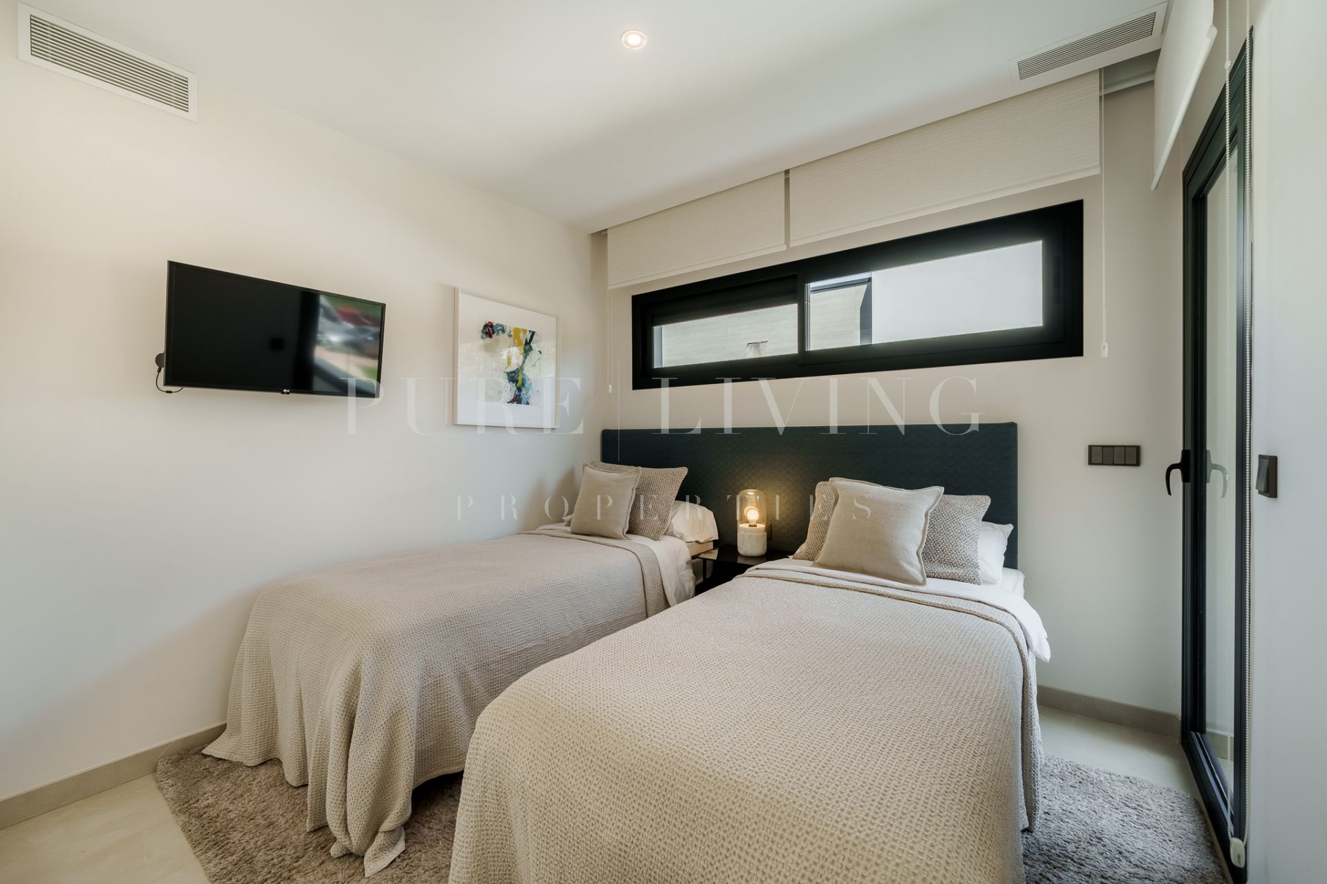 À l’étage inférieur, un salon TV confortable offre une atmosphère plus intime, parfaite pour les soirées cinéma ou les moments de calme en famille. Le solarium sur le toit ajoute un espace extérieur supplémentaire avec jacuzzi, idéal pour profiter du soleil, recevoir des invités ou admirer le climat agréable de Marbella tout au long de l’année.