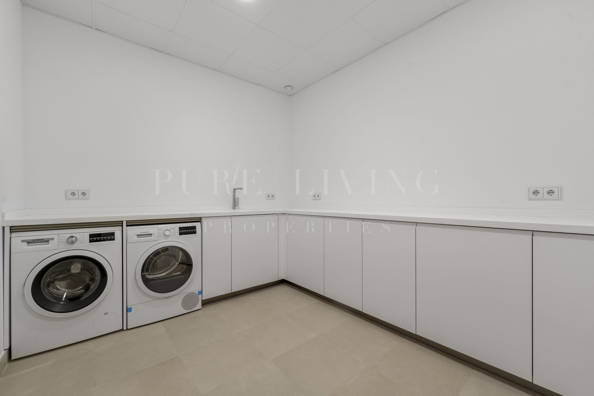 En entrant dans la villa, on est immédiatement captivé par sa grandeur et sa grâce. Un design impeccable vous entoure tandis que vous admirez le vaste espace de vie aux hauts plafonds, éclairé par la lumière naturelle qui pénètre à flots. Le plan ouvert astucieux relie le salon, la salle à manger et la cuisine moderne et élégante, créant un flux harmonieux parfait pour recevoir ou profiter de soirées calmes et tranquilles. La cuisine est un havre de paix pour tout chef en herbe, entièrement équipée d’appareils électroménagers de pointe, de plans de travail impeccables et d’un grand espace.