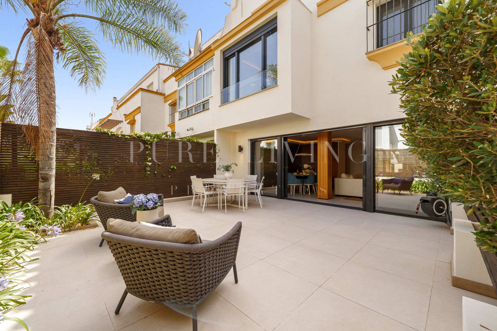 Maison de ville rénovée de quatre chambres à quelques pas de la promenade et de la plage sur le Golden Mile de Marbella.