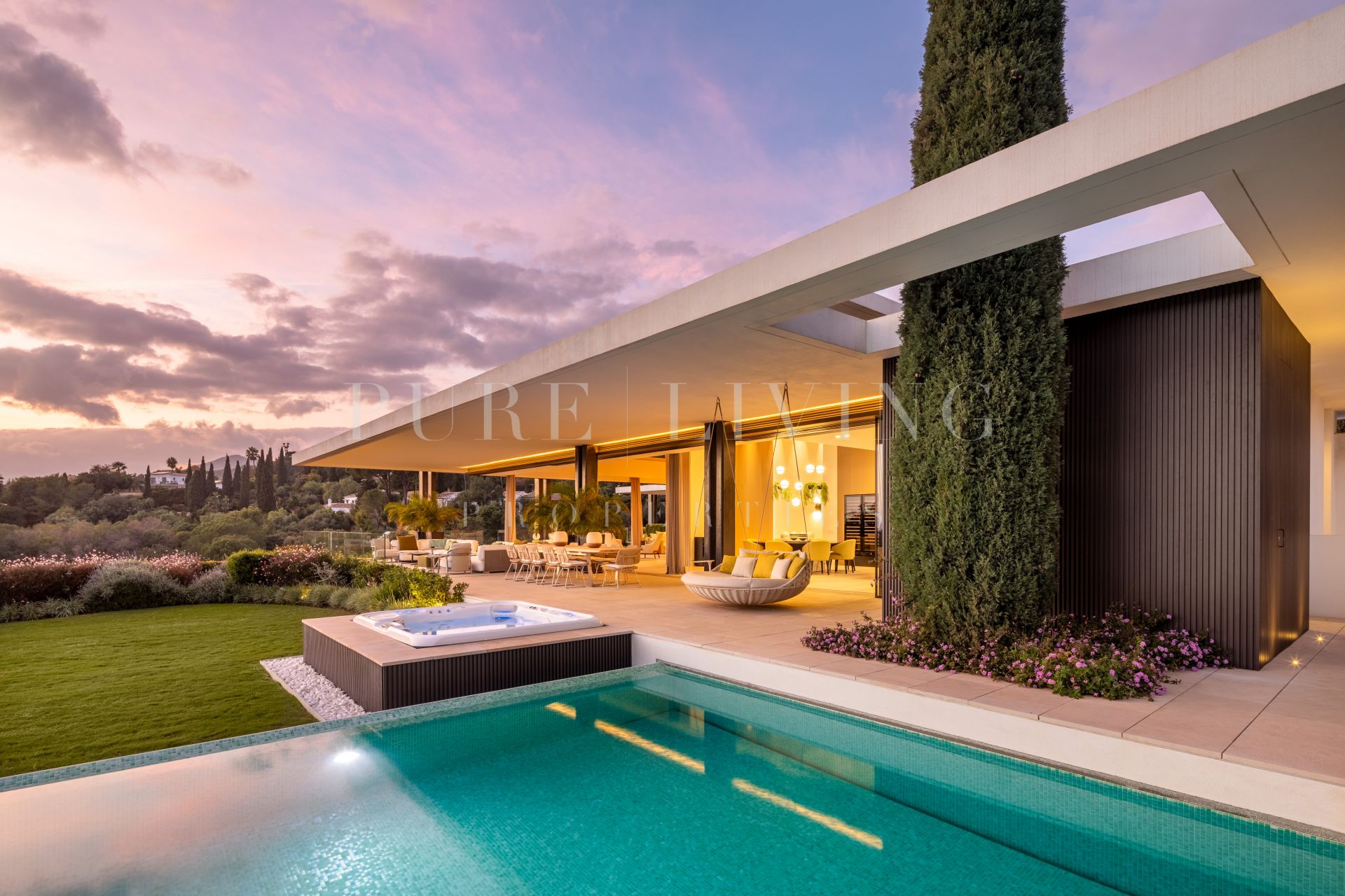 Un chef-d’œuvre d’architecture contemporaine du célèbre architecte Tobal, niché dans une urbanisation protégée au sein du La Quinta Golf & Country Club. Cette villa offre une intimité inégalée et une vue imprenable sur le littoral méditerranéen, perchée sur un vaste terrain de plus de 1 700 m². Le jardin méticuleusement aménagé, avec une piscine privée et un jacuzzi, a été conçu avec soin pour créer une retraite sereine et exclusive. Les espaces de vie extérieurs se fondent harmonieusement avec la piscine, offrant un équilibre idéal entre l’isolement et la lumière du soleil.