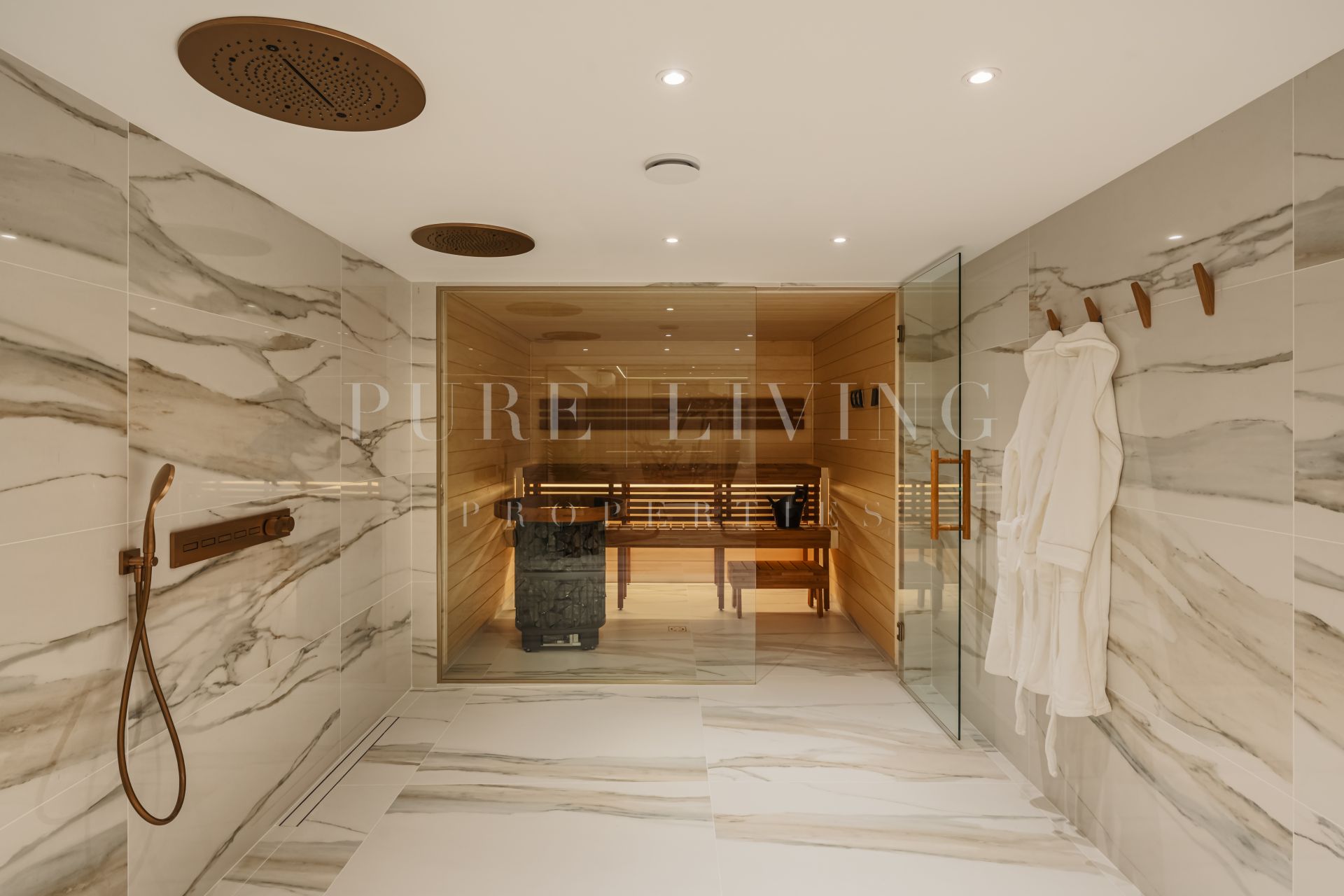 Binnen weerspiegelen de interieurs van de villa een verfijnde en tijdloze esthetiek. Het neutrale kleurenpalet versterkt de rustige, gastvrije sfeer, terwijl de keuken opvalt als zowel stijlvol als zeer functioneel, gecentreerd rond een opvallend eiland dat dient als ruimte voor zowel koken als informeel dineren.