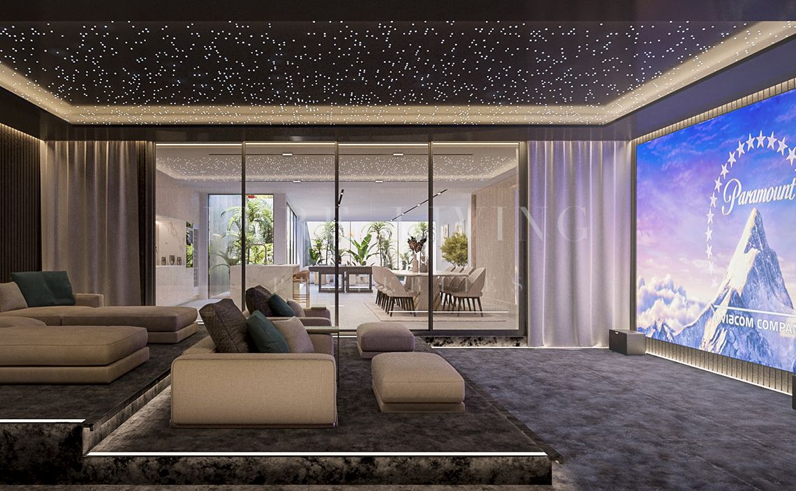 De benedenverdieping bestaat uit een entertainmentruimte, bioscoop, spa, sauna, Turks bad, fitnessruimte, wasruimte, wijnkelder, bar, gastentoilet en een garage voor drie auto’s.