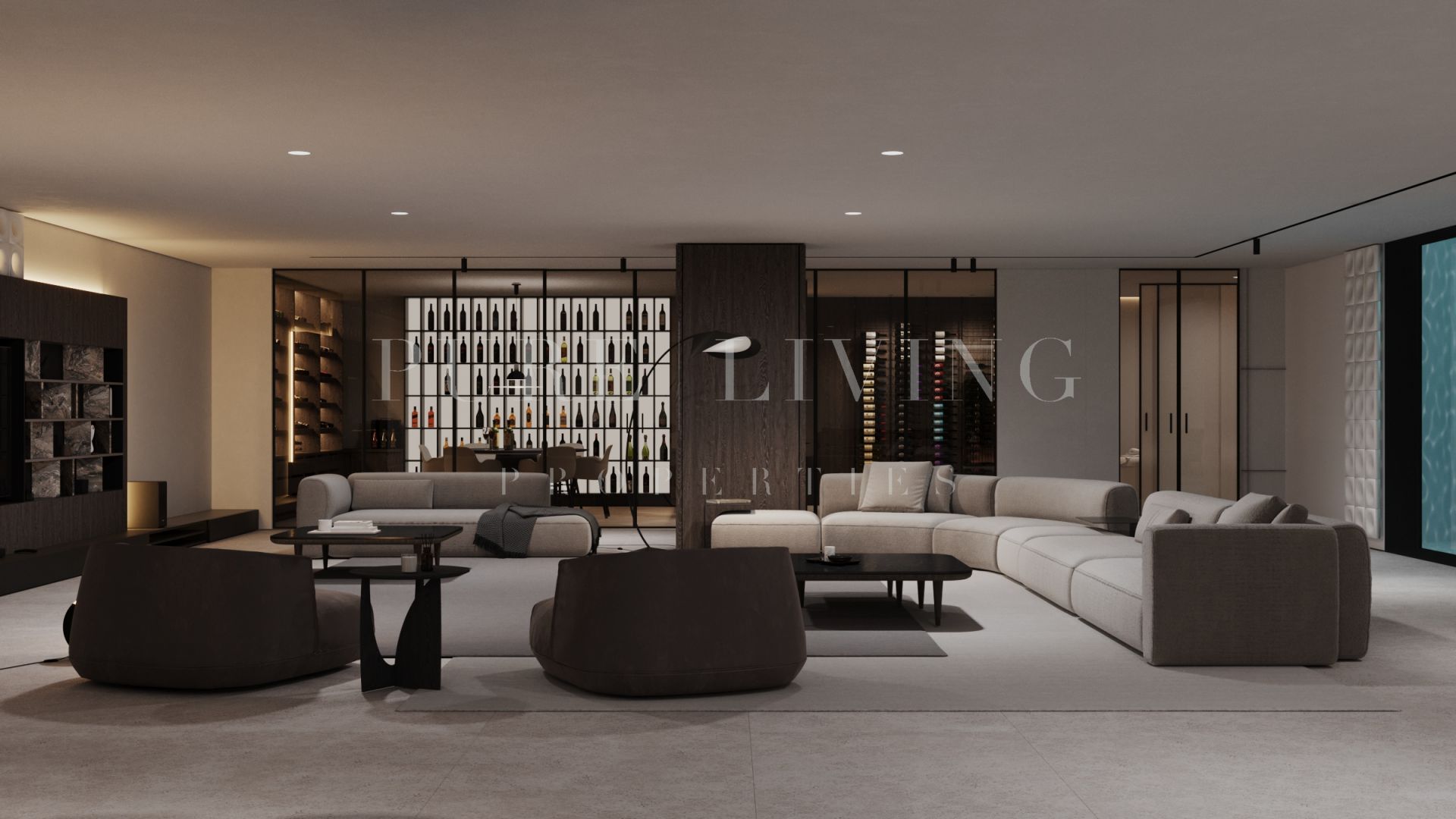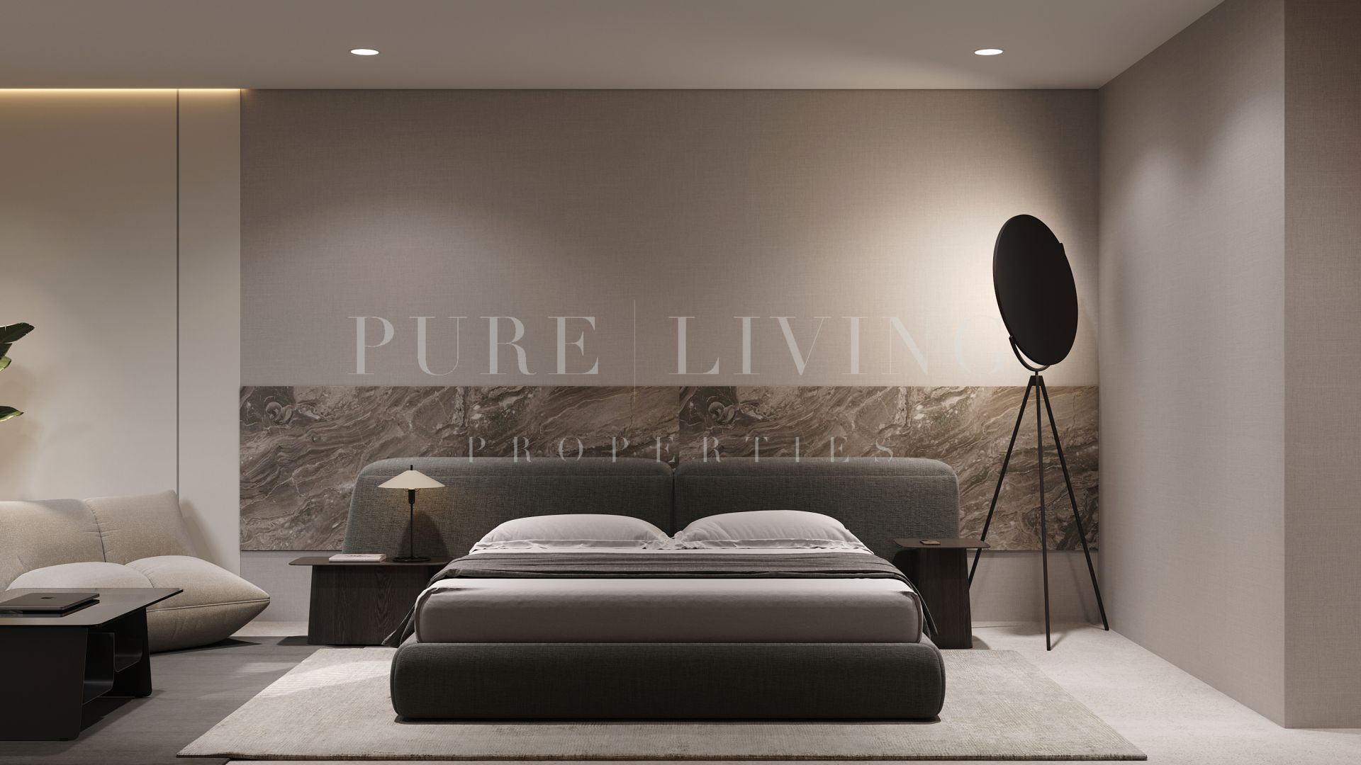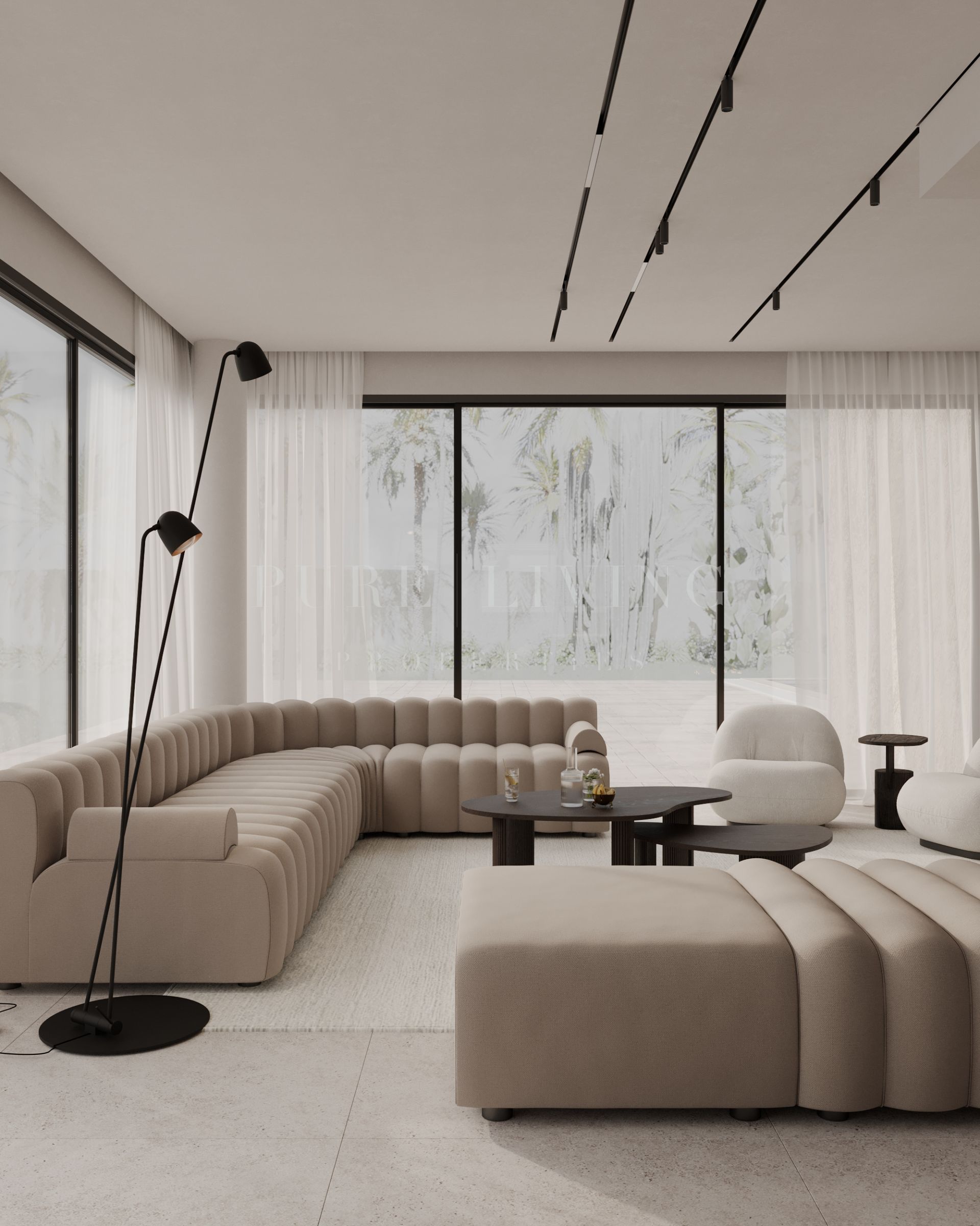 De villa beschikt over acht slaapkamers met en-suite badkamers, allemaal voorzien van ingebouwde kasten. De hoofdsuite beschikt over een inloopkast. Het interieurontwerp in neutrale tinten, het gebruik van natuurlijke materialen en de ramen van vloer tot plafond zorgen voor lichte en open leefruimtes. De open keuken, eetkamer en woonkamer bieden een functionele indeling, met grote schuifdeuren die toegang geven tot de terrassen, de privétuin en het zwembad.