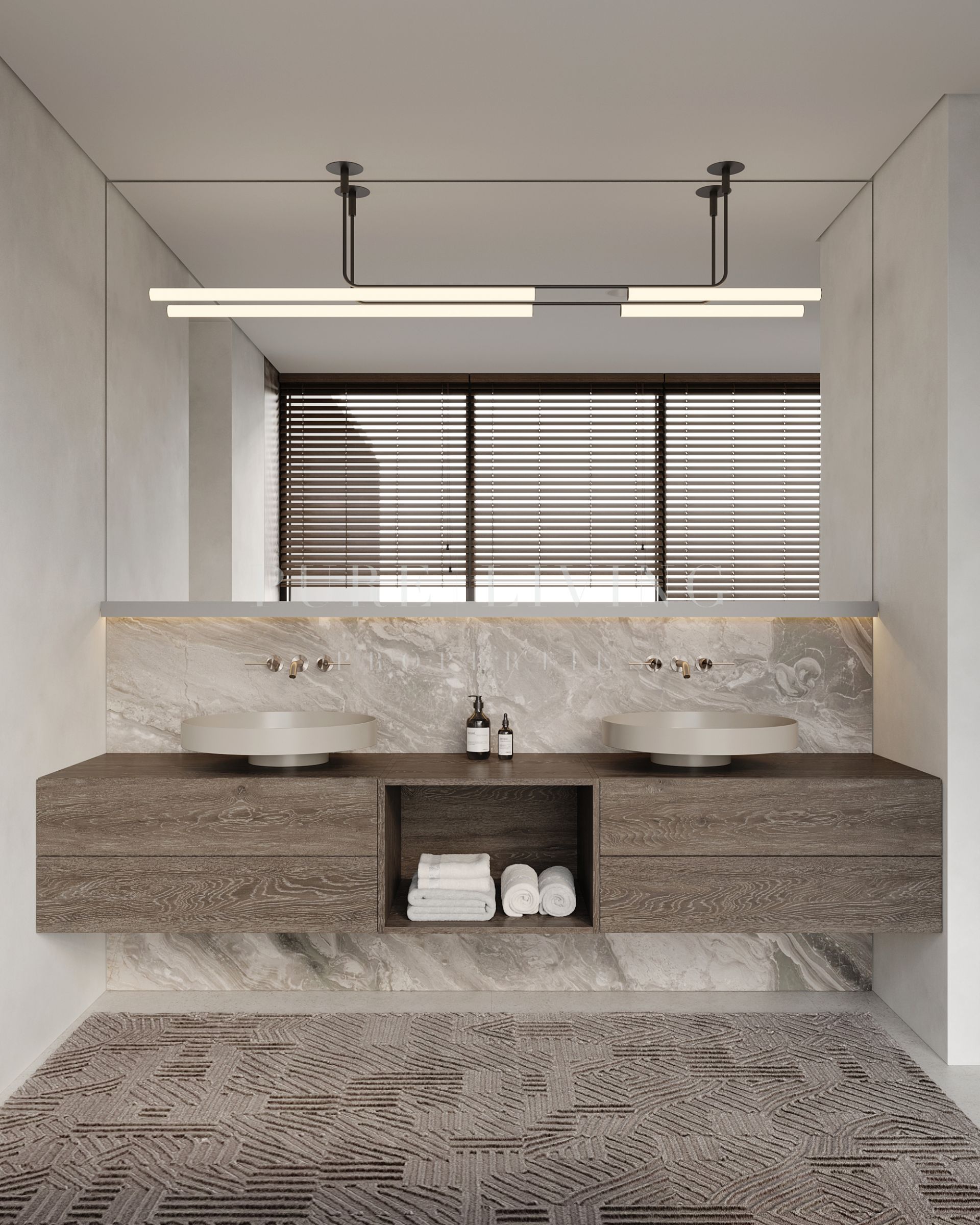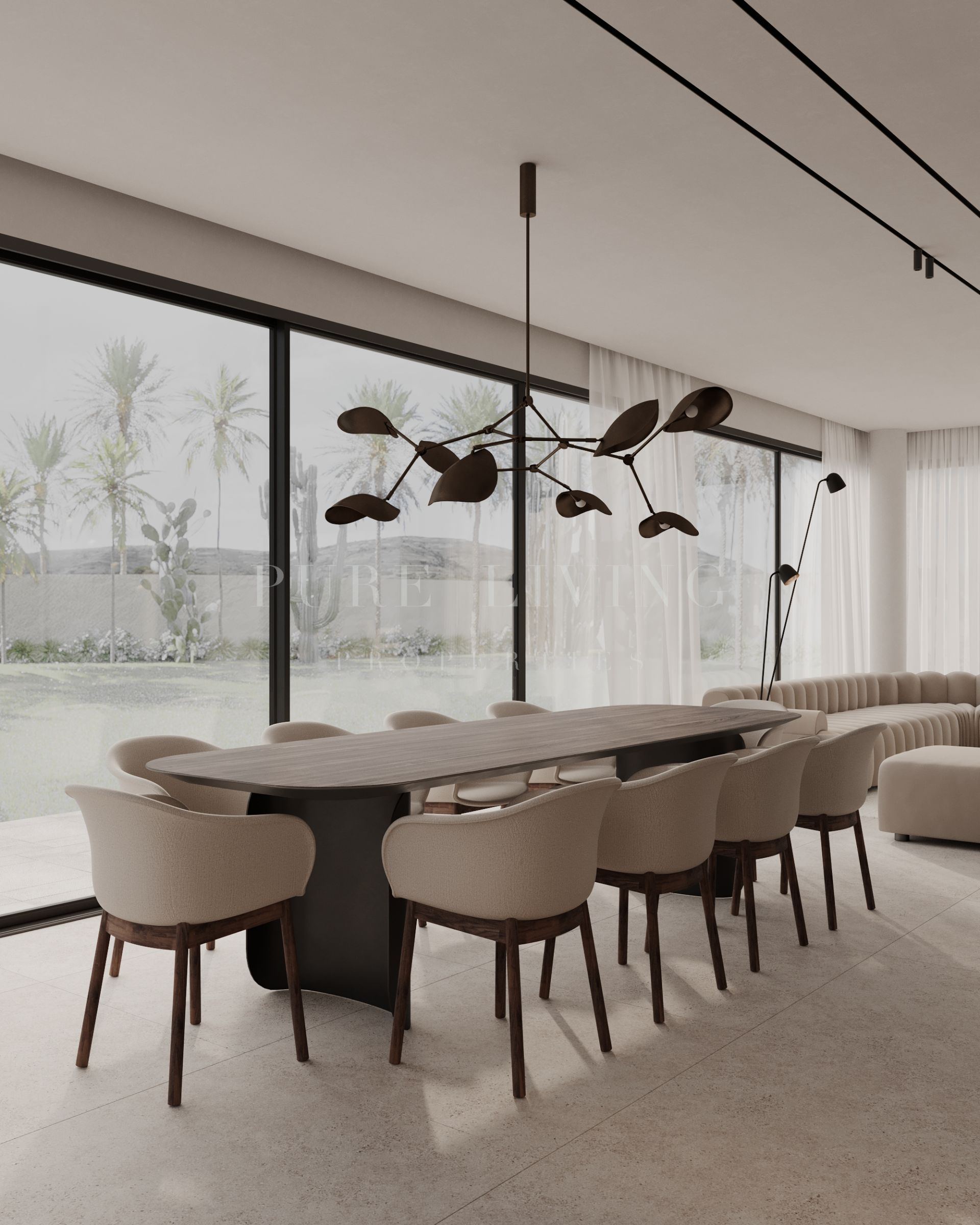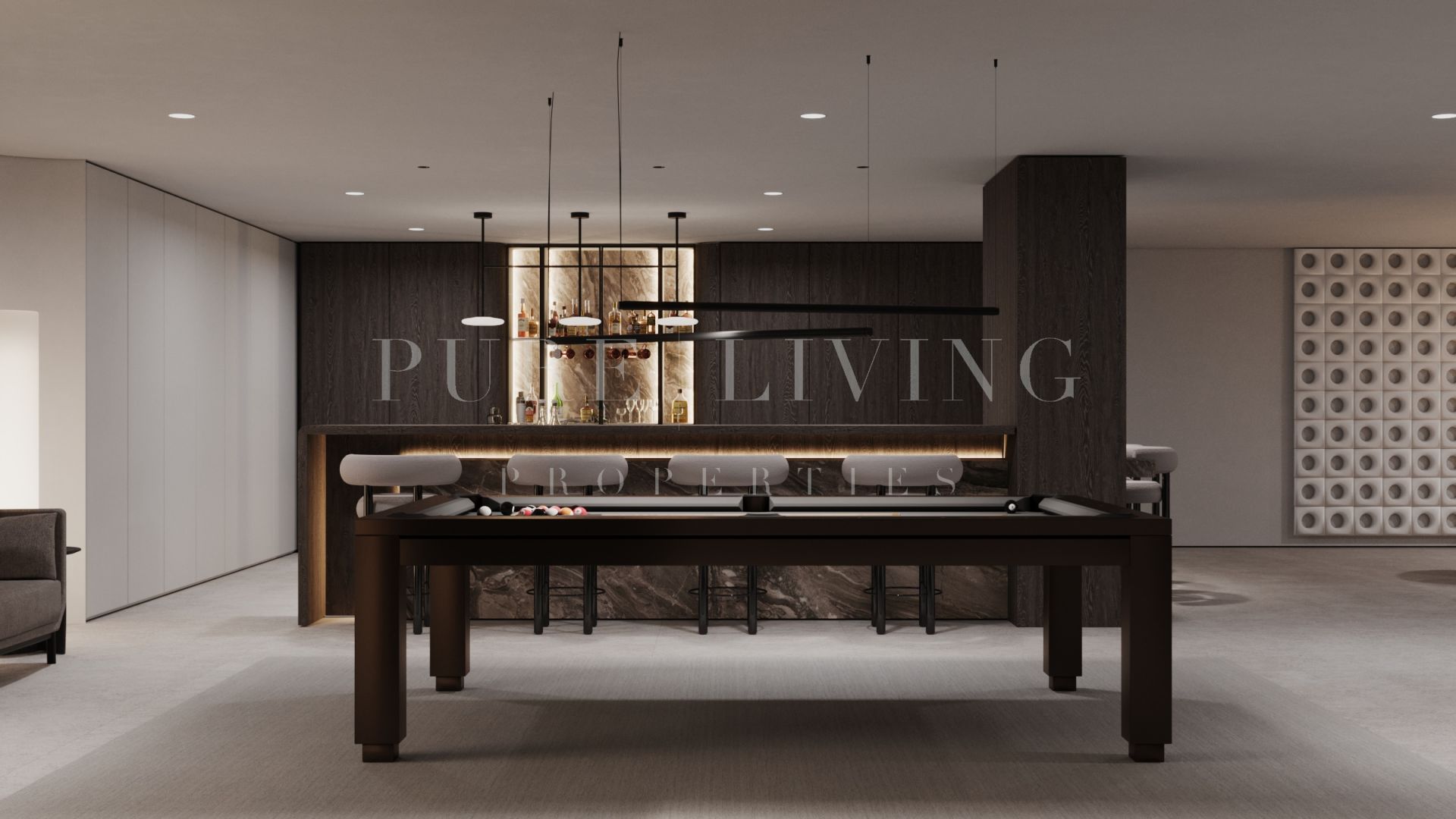 De villa beschikt over acht slaapkamers met en-suite badkamers, allemaal voorzien van ingebouwde kasten. De hoofdsuite beschikt over een inloopkast. Het interieurontwerp in neutrale tinten, het gebruik van natuurlijke materialen en de ramen van vloer tot plafond zorgen voor lichte en open leefruimtes. De open keuken, eetkamer en woonkamer bieden een functionele indeling, met grote schuifdeuren die toegang geven tot de terrassen, de privétuin en het zwembad.