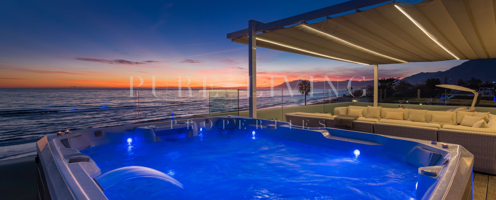 De eerste verdieping bestaat uit drie ruime slaapkamers, allemaal met directe toegang tot het indrukwekkende dakterras met prachtig uitzicht op de Middellandse Zee, met een jacuzzi, een buitenbar en een zithoek.