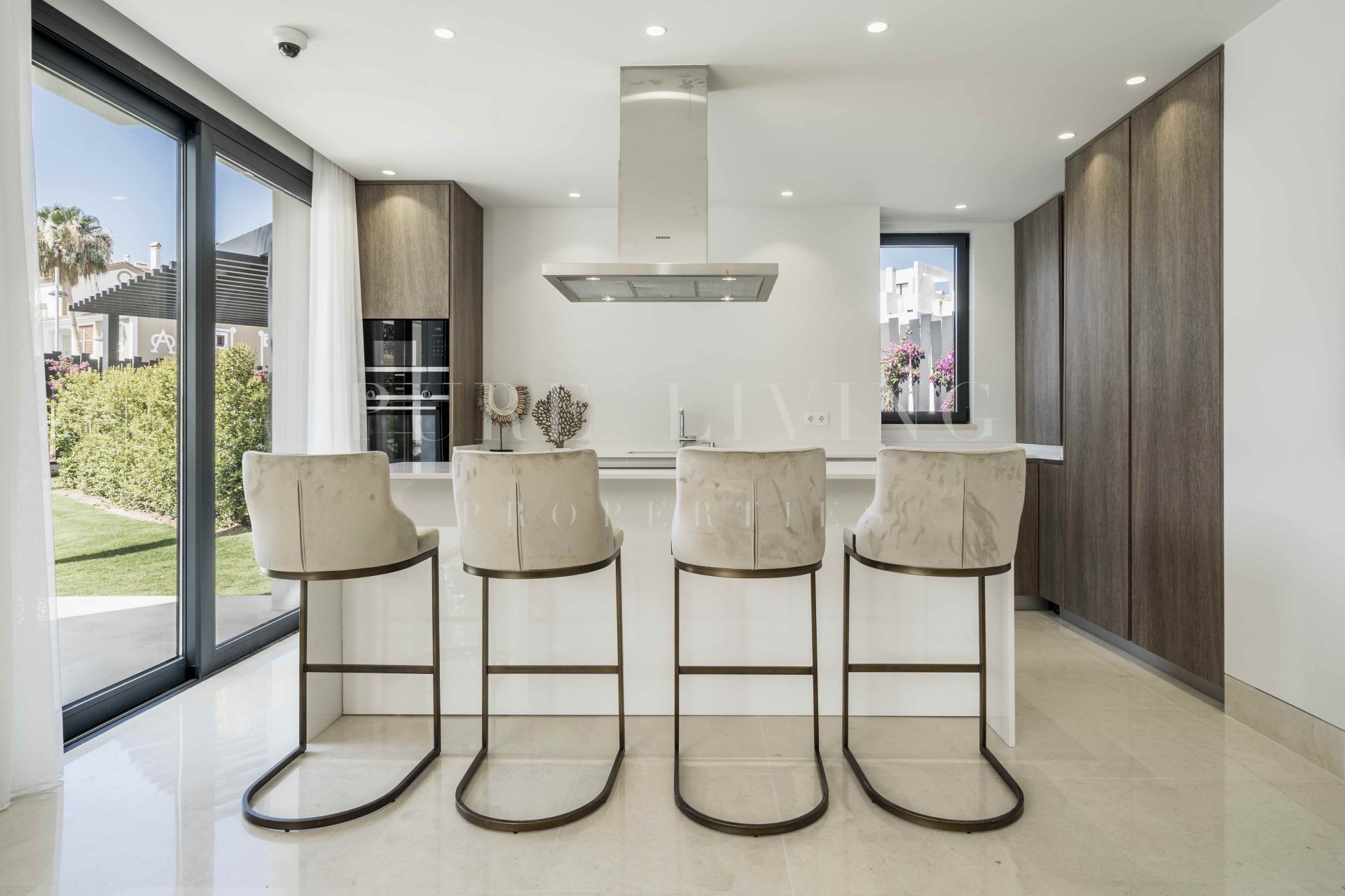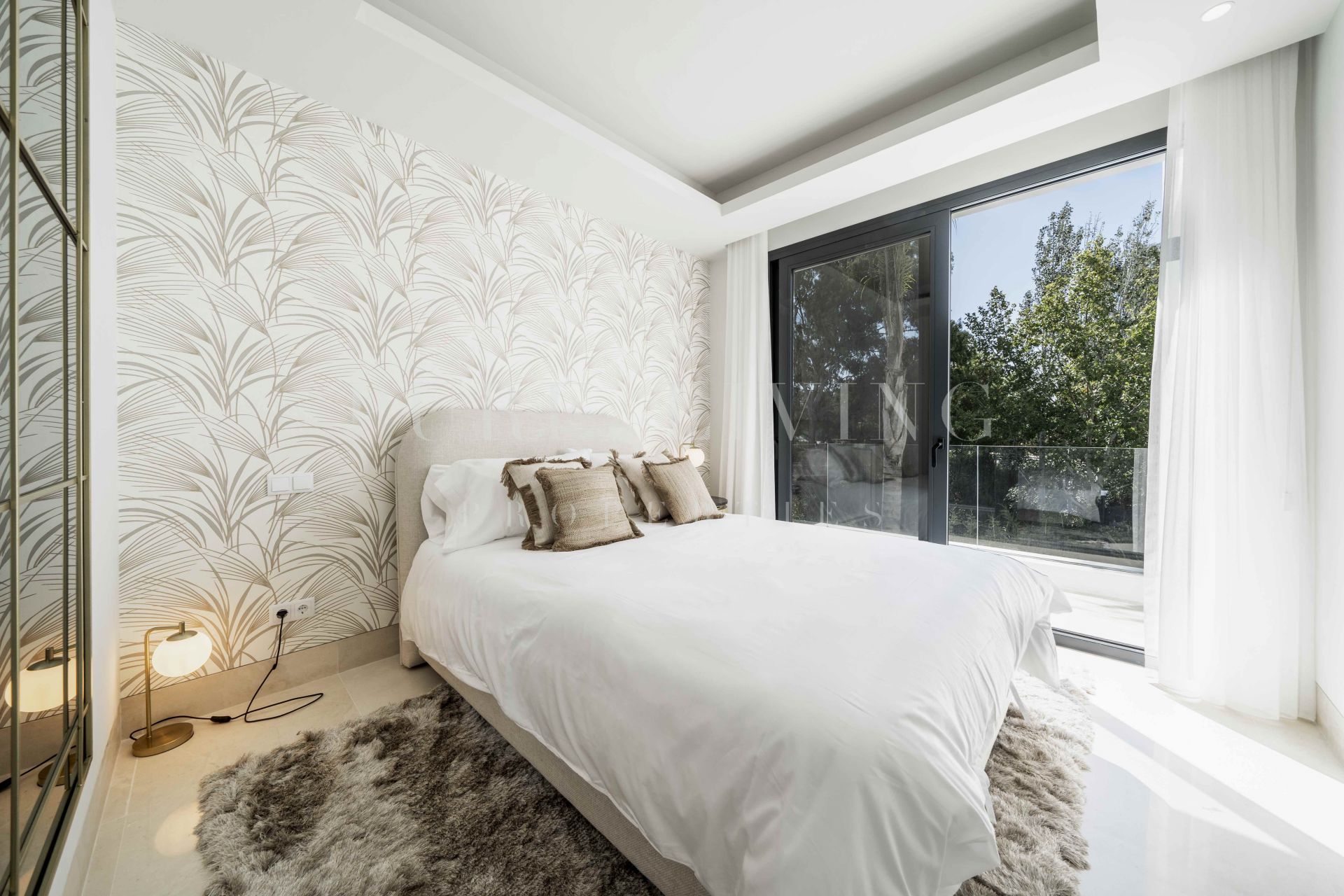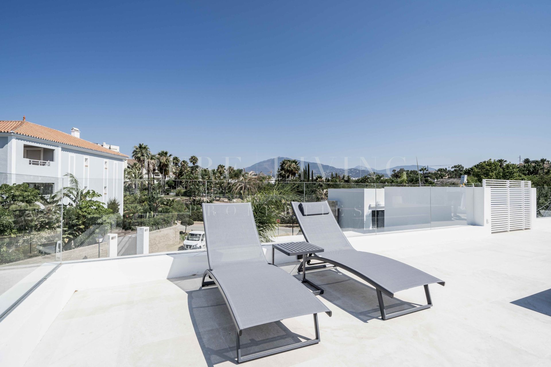 Op de eerste verdieping zijn er drie slaapkamers met eigen badkamer, waaronder een master suite met een kleedruimte en toegang tot een privéterras. Elke slaapkamer is zorgvuldig ontworpen voor comfort en ontspanning, met hoogwaardige afwerking en ultramoderne domotica, waaronder een ingebouwd geluidssysteem. De benedenverdieping heeft een gastensuite, een wasruimte en een entertainmentruimte met een thuisbioscoop en bar. Het solarium op het dak biedt een stijlvolle houten jacuzzi, gedeeltelijk uitzicht op de bergen en voldoende ruimte om te zonnebaden, te entertainen en buiten te dineren.