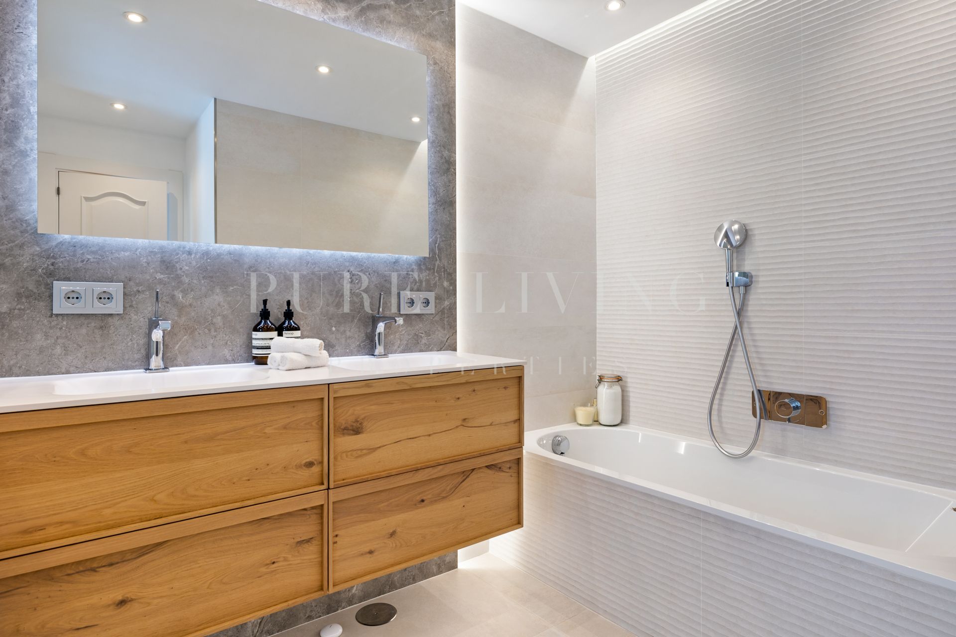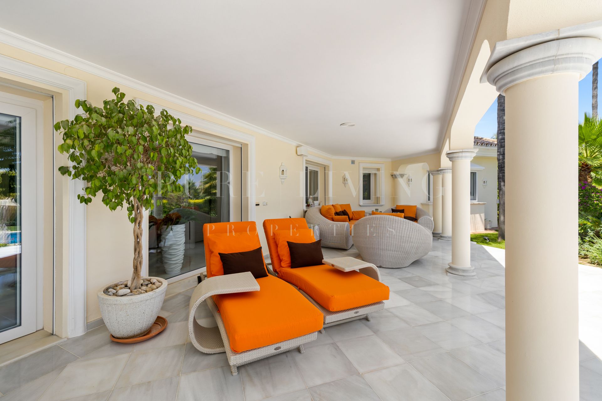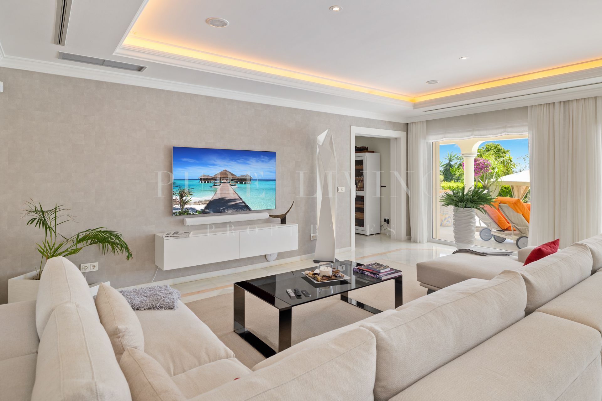 Het hoofdniveau bestaat uit een hal, ruime woonkamer met open haard en hoge plafonds, eetkamer, een open volledig ingerichte keuken met Siemens en Neff apparatuur, vier gastenslaapkamers en-suite, een kantoor, wasruimte en een gastentoilet. Directe toegang tot de overdekte en open terrassen vanuit de woonkamer, naar de volgroeide tuin, het verwarmde privézwembad en de barbecueplaats.