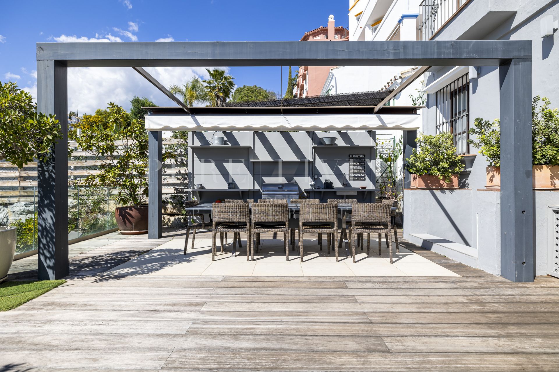 De naadloze overgang tussen binnen en buiten is een van de grote troeven van deze woning. De overdekte en open terrassen sluiten aan op een lounge- en barbecuegedeelte, ideaal om te genieten van het mediterrane klimaat. De privé-tuin en het zwembad creëren de perfecte setting voor ontspanning en gezellig samenzijn.