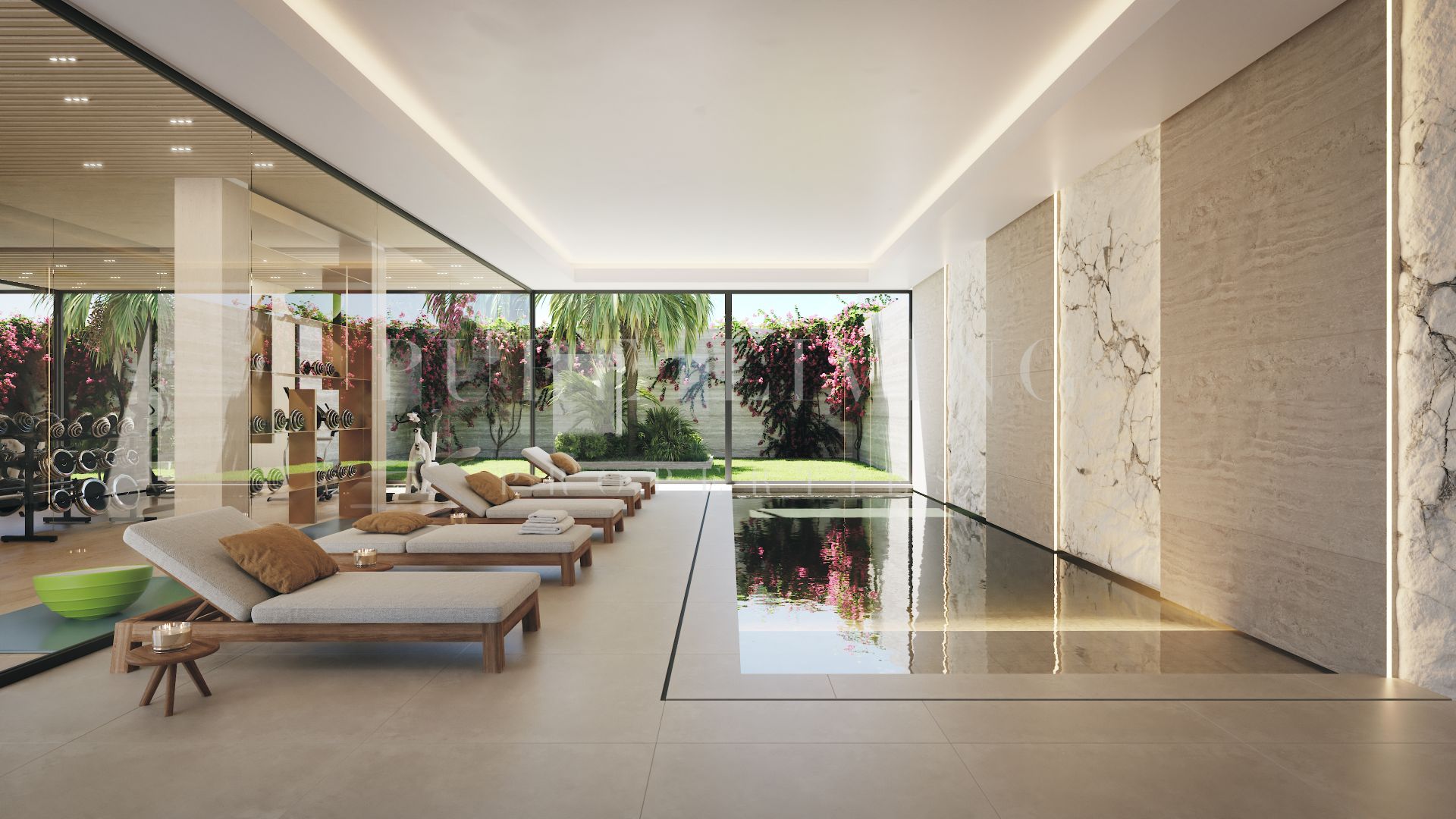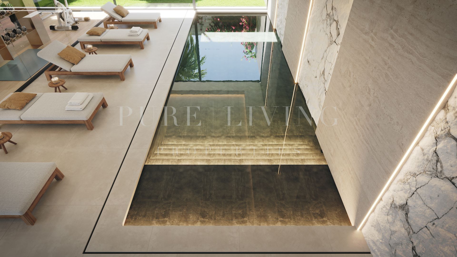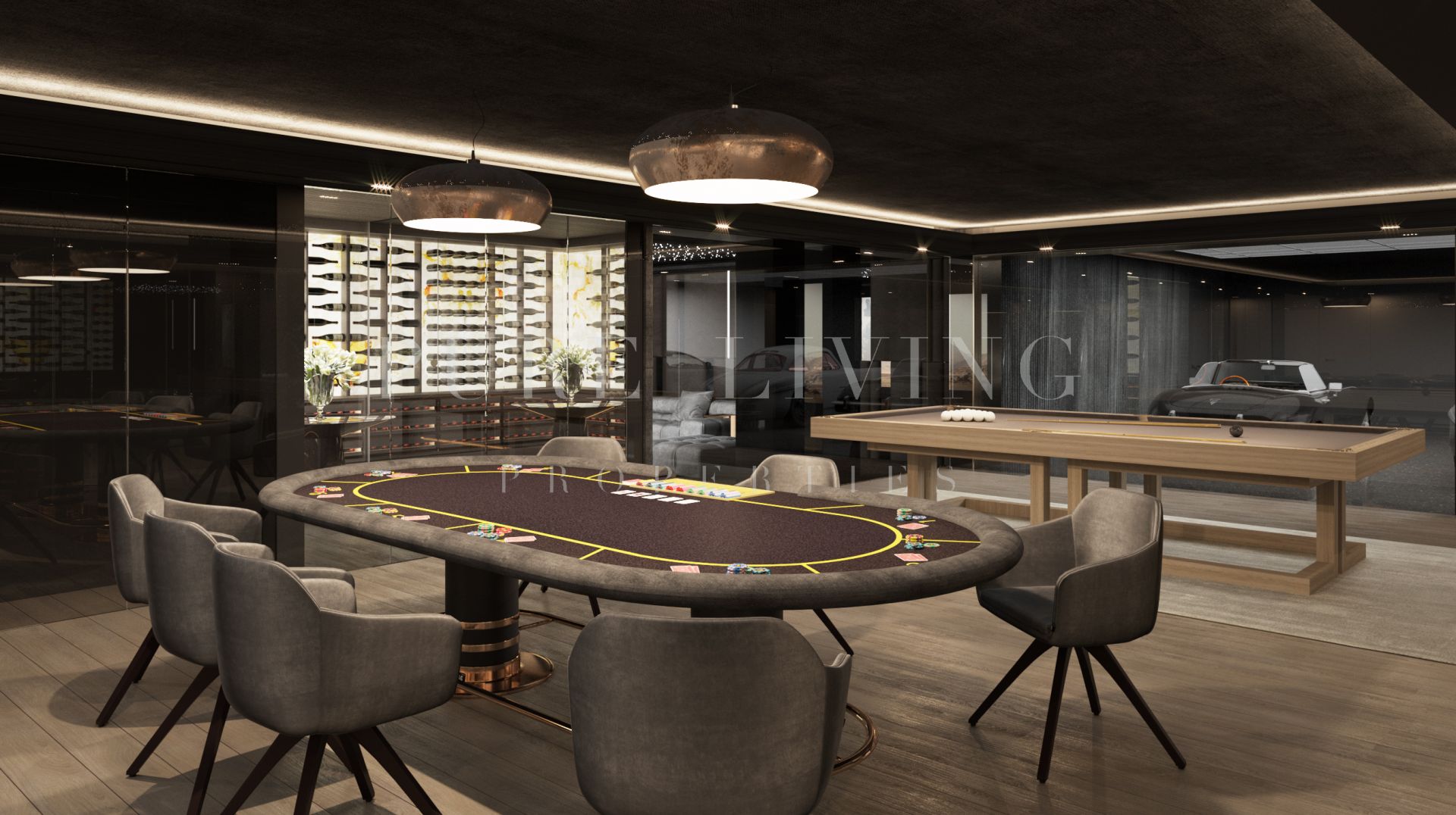 De benedenverdieping bestaat uit een verbazingwekkende spa met een verwarmd binnenzwembad, een koud zwembad, een sauna, een hamam, een massageruimte, een volledig uitgeruste fitnessruimte, een wijnkelder, een bioscoopzaal, een speelkamer met snooker- en pokertafels en een privégarage voor drie auto’s.