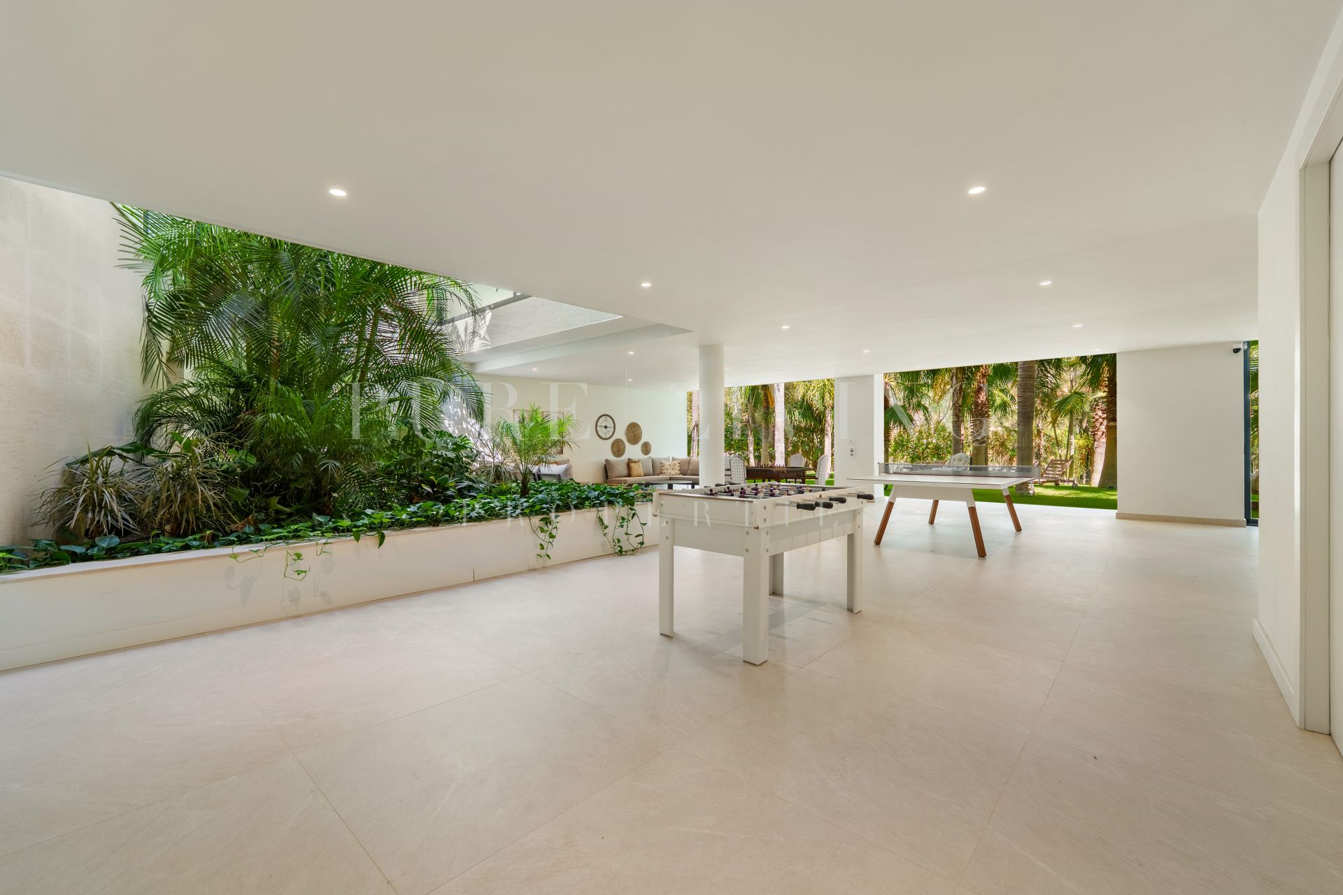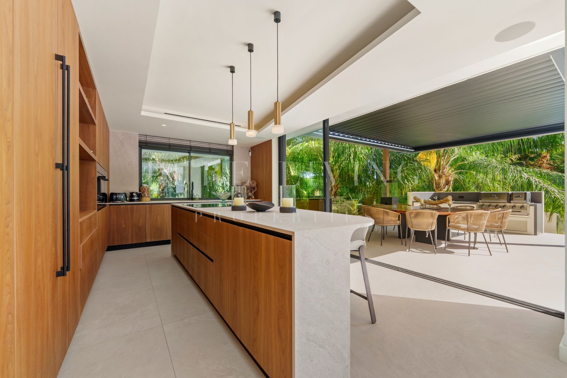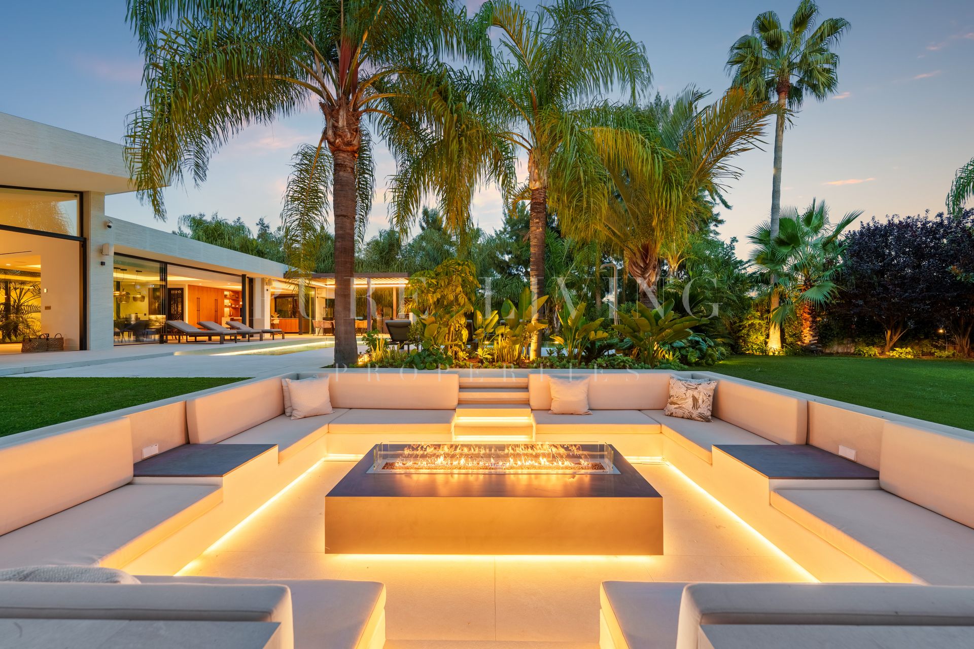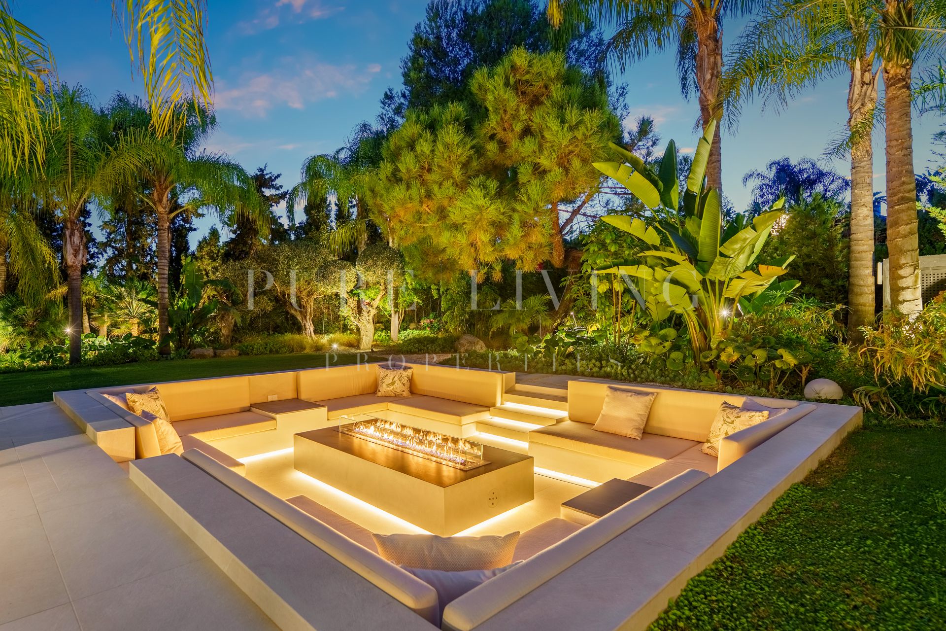 De buitenruimtes zijn fraai vormgegeven met aangelegde tuinen, volgroeide palmbomen en diverse plekken om te ontspannen. Het zwembad, met stapstenen en omringd door ligbedden, vormt het middelpunt van het buitenterrein. Een overdekt terras voor buiten dineren en een verzonken zithoek met vuurplaats en geïntegreerde verlichting zorgen voor uitnodigende sferen, zowel overdag als ’s avonds, met behoud van veel privacy.