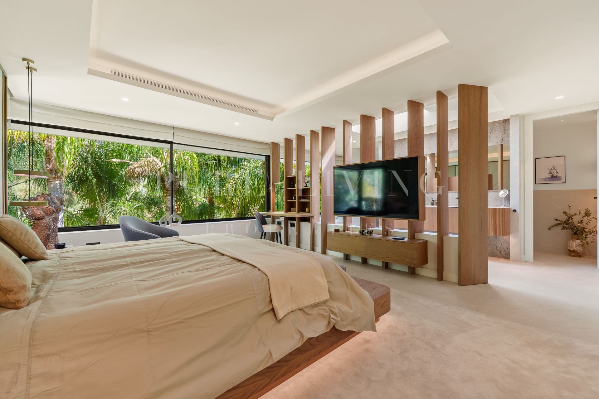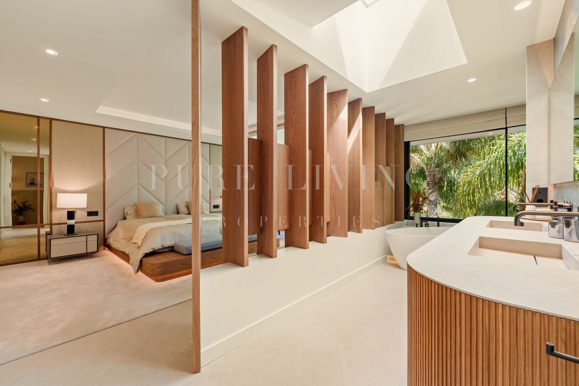 De woning beschikt over stijlvolle gastenslaapkamers en een ruime hoofdsuite, alle ontworpen om optimaal gebruik te maken van natuurlijk licht en directe toegang tot het groen buiten. De hoofdslaapkamer heeft een royale ensuite badkamer met een vrijstaand bad en dubbele wastafel, gescheiden door houten elementen die privacy bieden zonder het open karakter te verliezen. De slaapkamers zijn afgewerkt met moderne details en grote ramen die de verbinding met de tuin versterken.