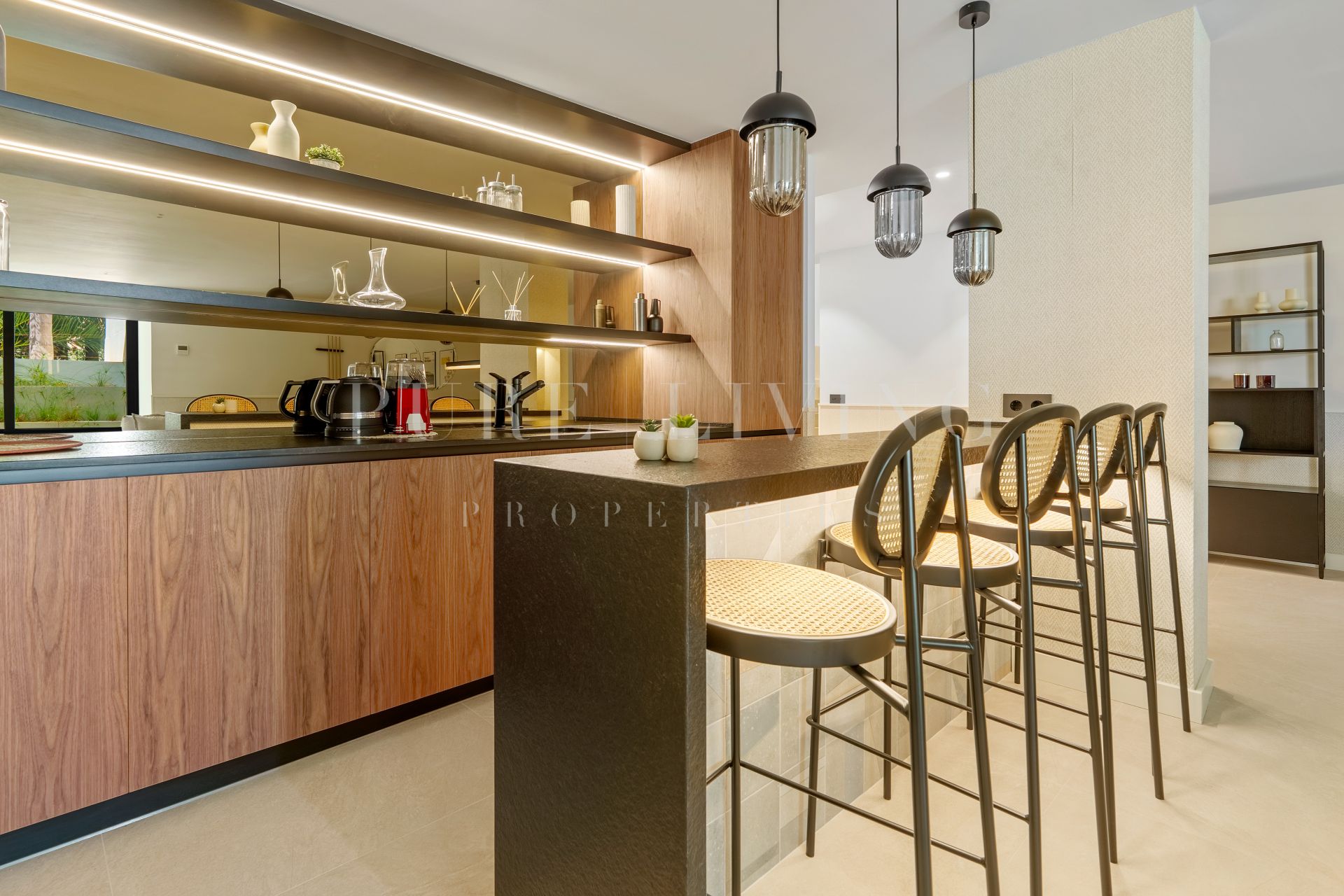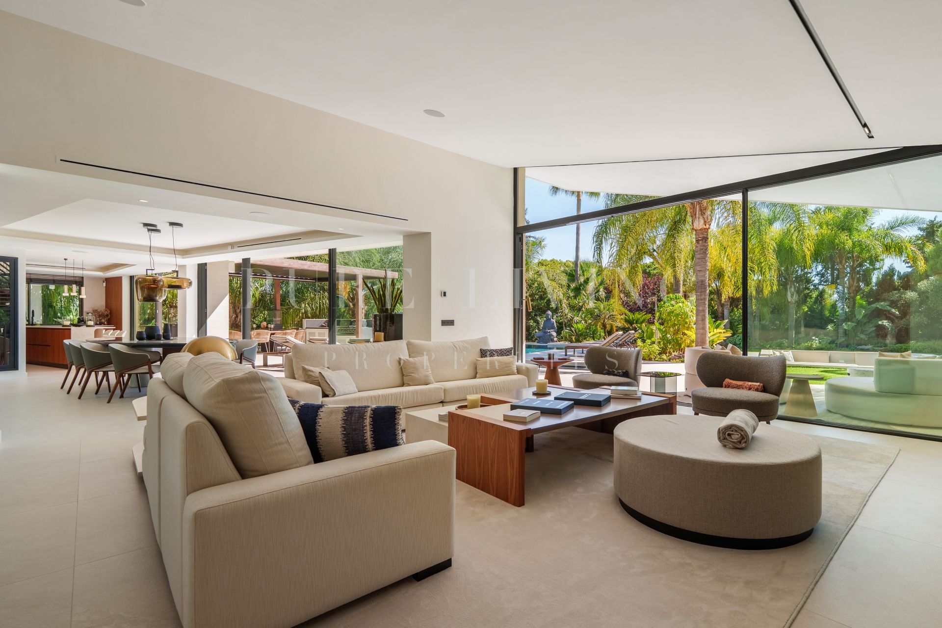 Deze moderne villa in Las Chapas, Marbella Oost, is voornamelijk ontworpen op één woonlaag, aangevuld met een lagere etage die volledig is ingericht voor ontspanning en entertainment. Het ontwerp draait om open leefruimtes, waarbij grote schuiframen het interieur naadloos verbinden met de buitentuinen en terrassen. De hoofdruimte combineert woonkamer, eetgedeelte en keuken in één harmonieus geheel, gekenmerkt door strakke lijnen, warme houten accenten en zicht op de aangelegde tuin en het zwembad.
