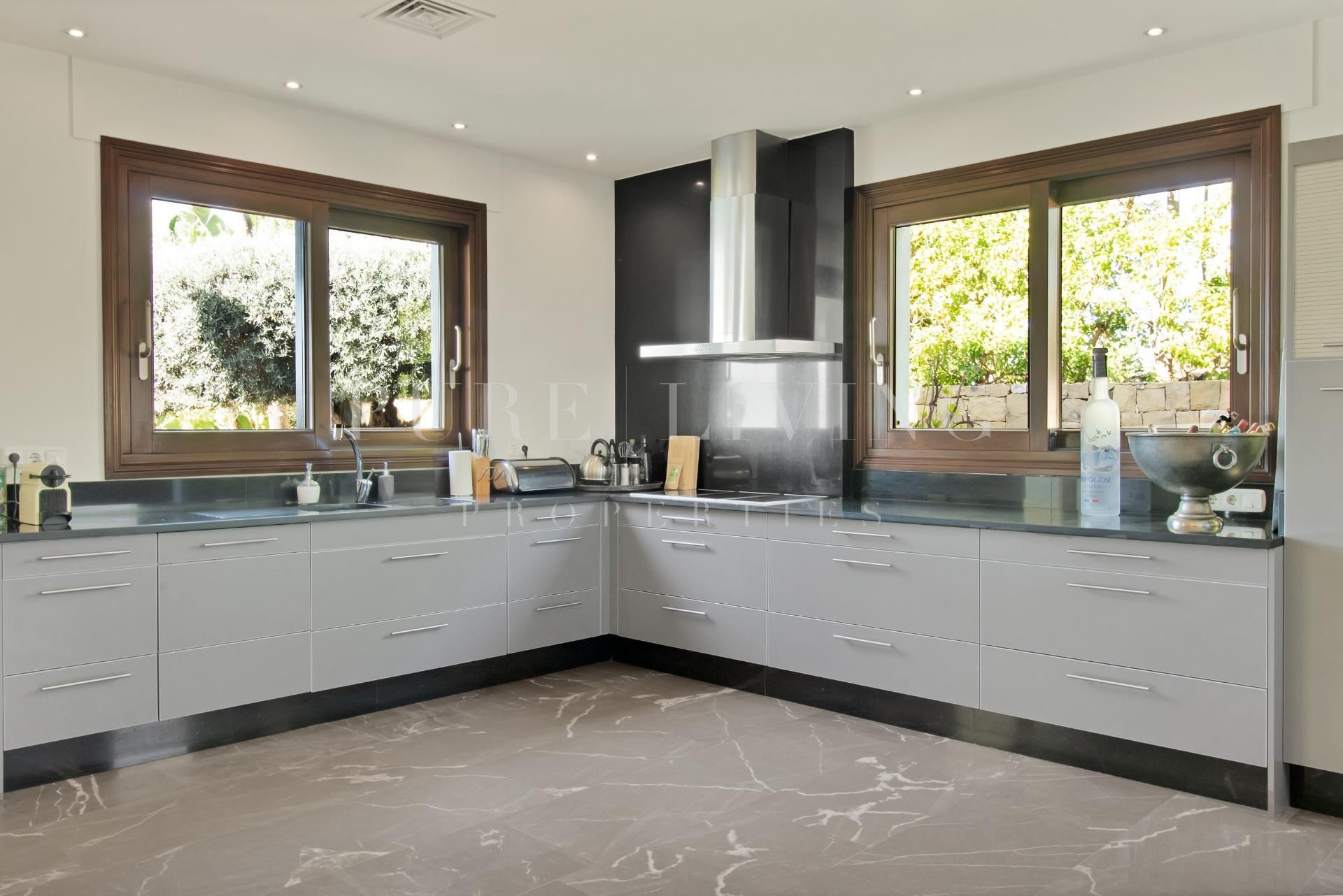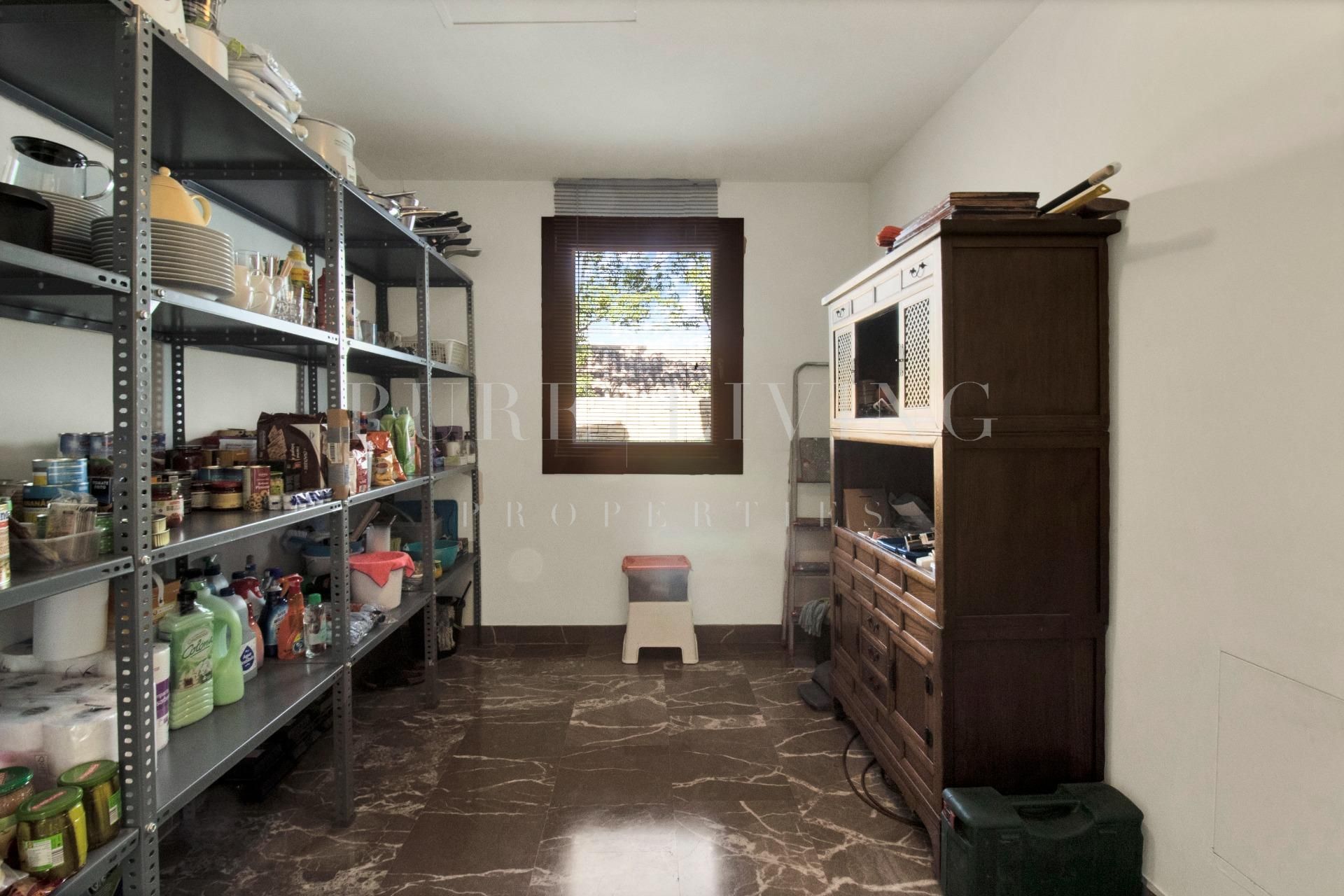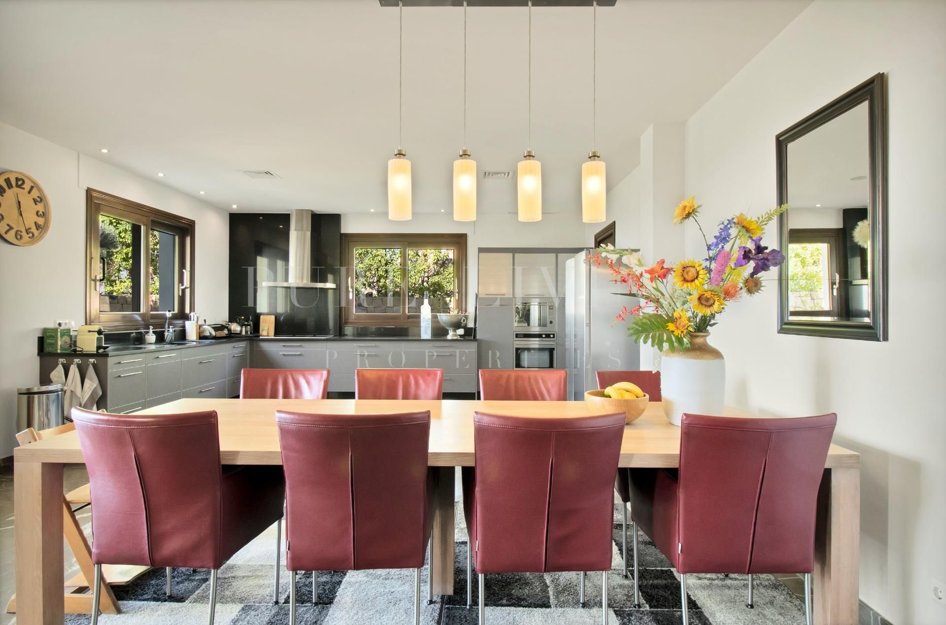 De begane grond bestaat uit een elegante imposante ‘grand’ entreehal, een L-vormige grote woonkamer met zithoek en open haard, een groot overdekt en open terras voor buiten dineren ‘Al Fresco’, een grote state of the art open keuken (Kupperbusch) met eet-/ontbijtruimte, een tv-kamer, nu in gebruik als speelkamer voor de kinderen, een klein kantoor met toegang tot internet, twee grote gastenslaapkamers, beide met directe toegang tot terrassen en het delen van een badkamer met bad en aparte douche, een garderobe, een berging en een garage voor drie auto’s met automatische poorten.