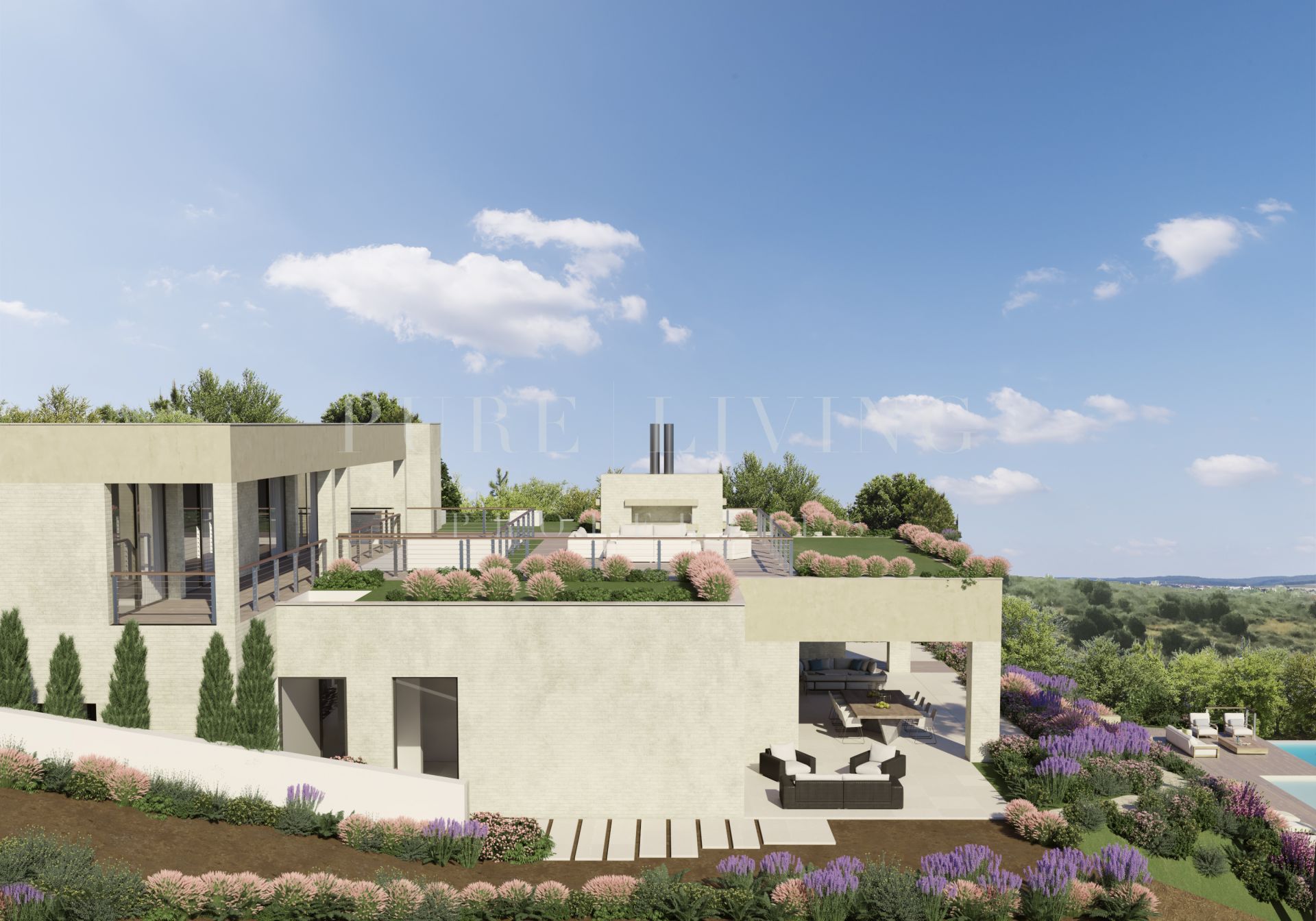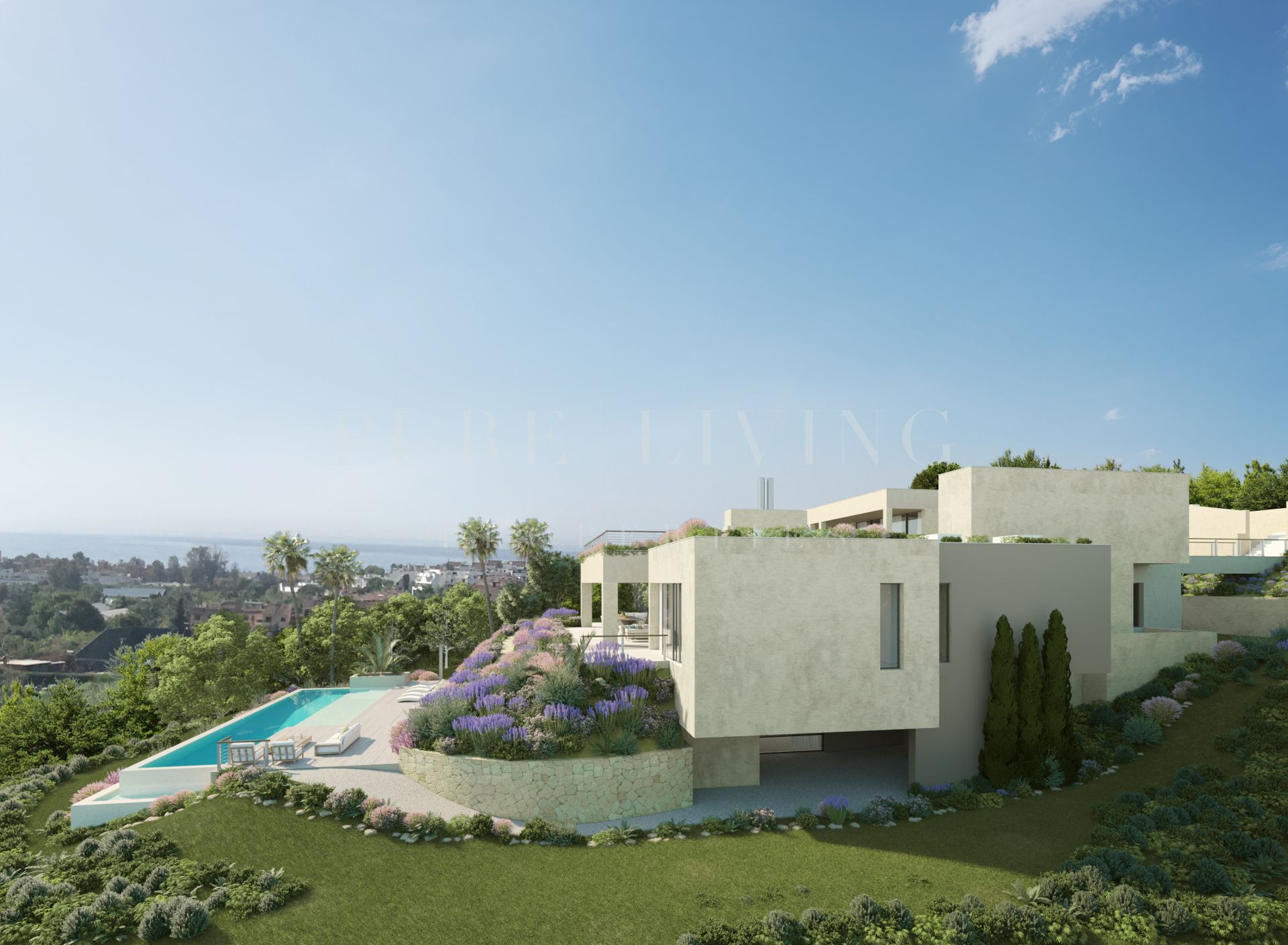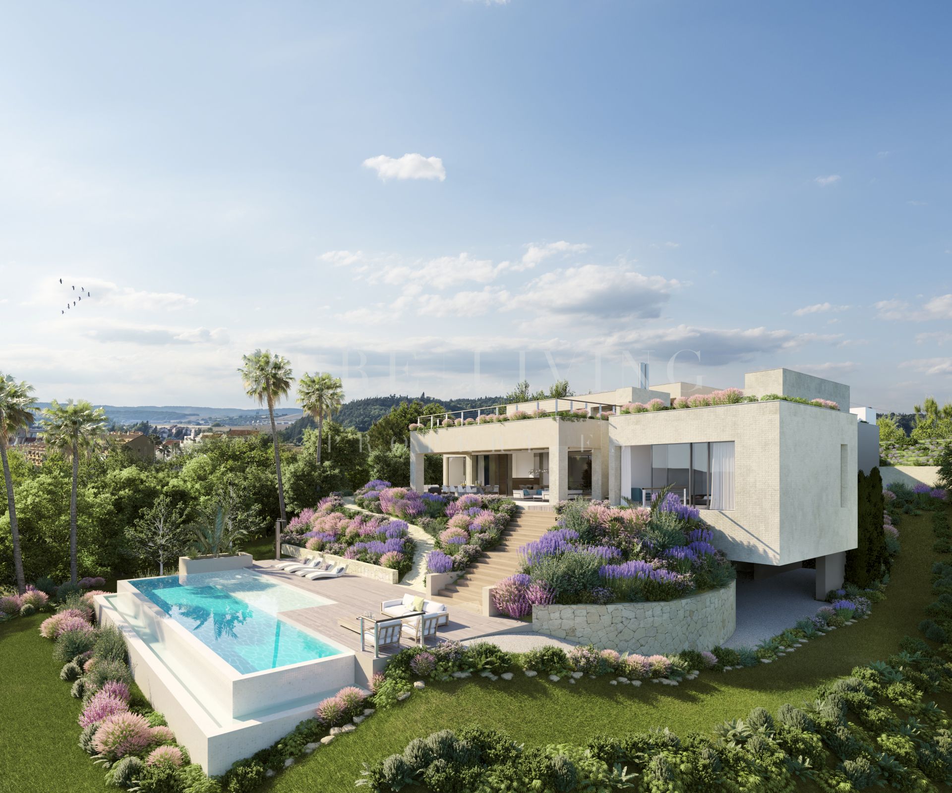 Deze uitzonderlijke en karakteristieke villa, momenteel in aanbouw, combineert naadloos de authenticiteit van handmatig bewerkte gevelstenen die doen denken aan onze oudste constructies met de hedendaagse touch van sierbeton. De villa heeft een adembenemend uitzicht op zee en ligt aan de voorkant van een golfbaan, in een gevestigde locatie, naast een van de meest iconische hotels aan de Costa del Sol.