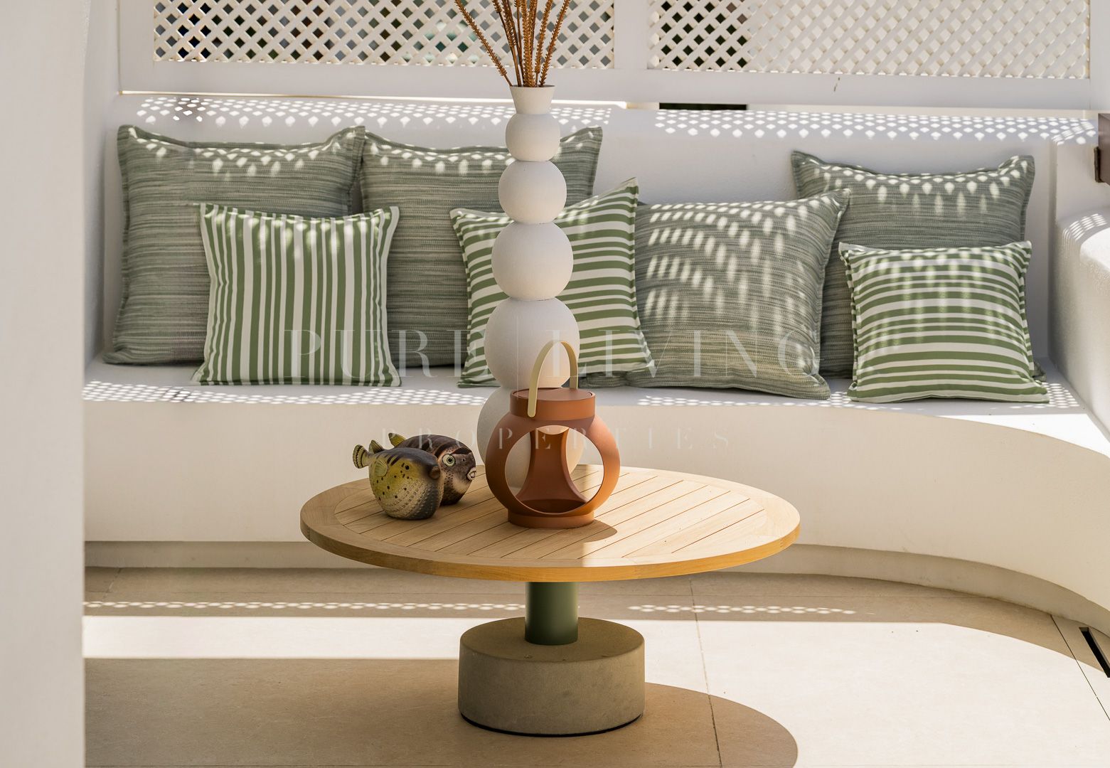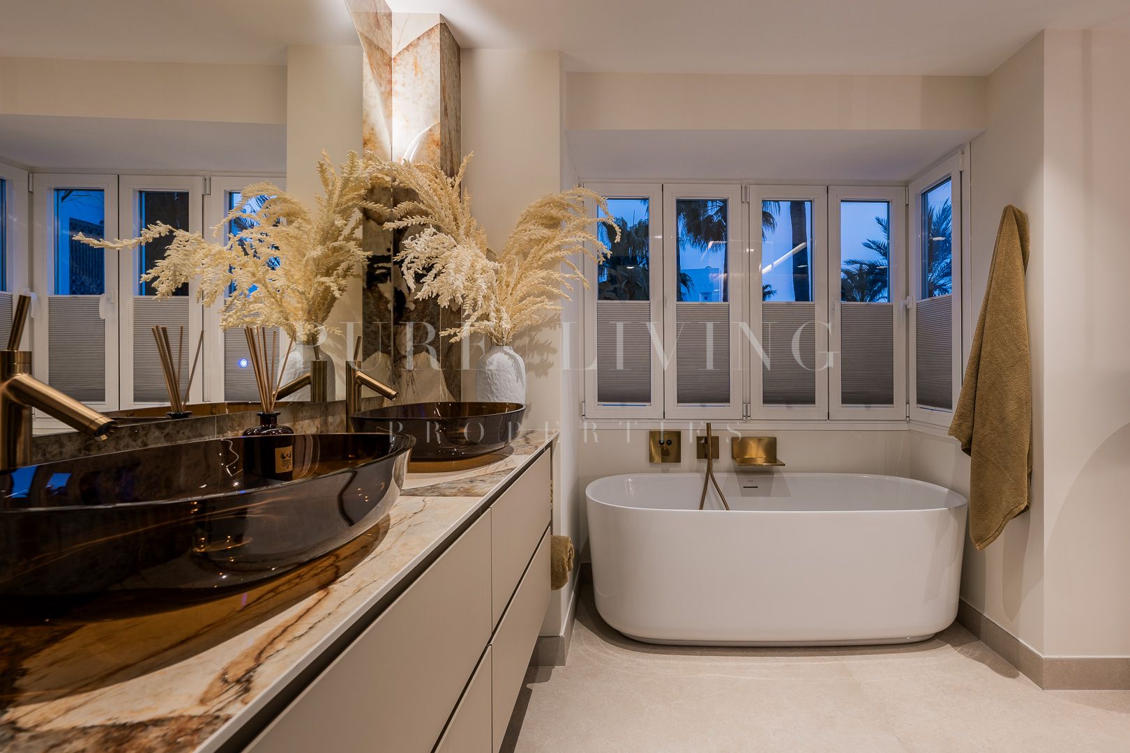 Ervaar een verfijnde levensstijl aan zee in dit prachtig gerenoveerde luxe appartement, gelegen in de prestigieuze Palm Beach-community aan de gewilde oostkust van Marbella. Deze elegante woning combineert modern design met tijdloze klasse en biedt privacy, comfort en moeiteloze stijl – perfect voor wie op zoek is naar een rustige maar exclusieve levensstijl aan de Costa del Sol.