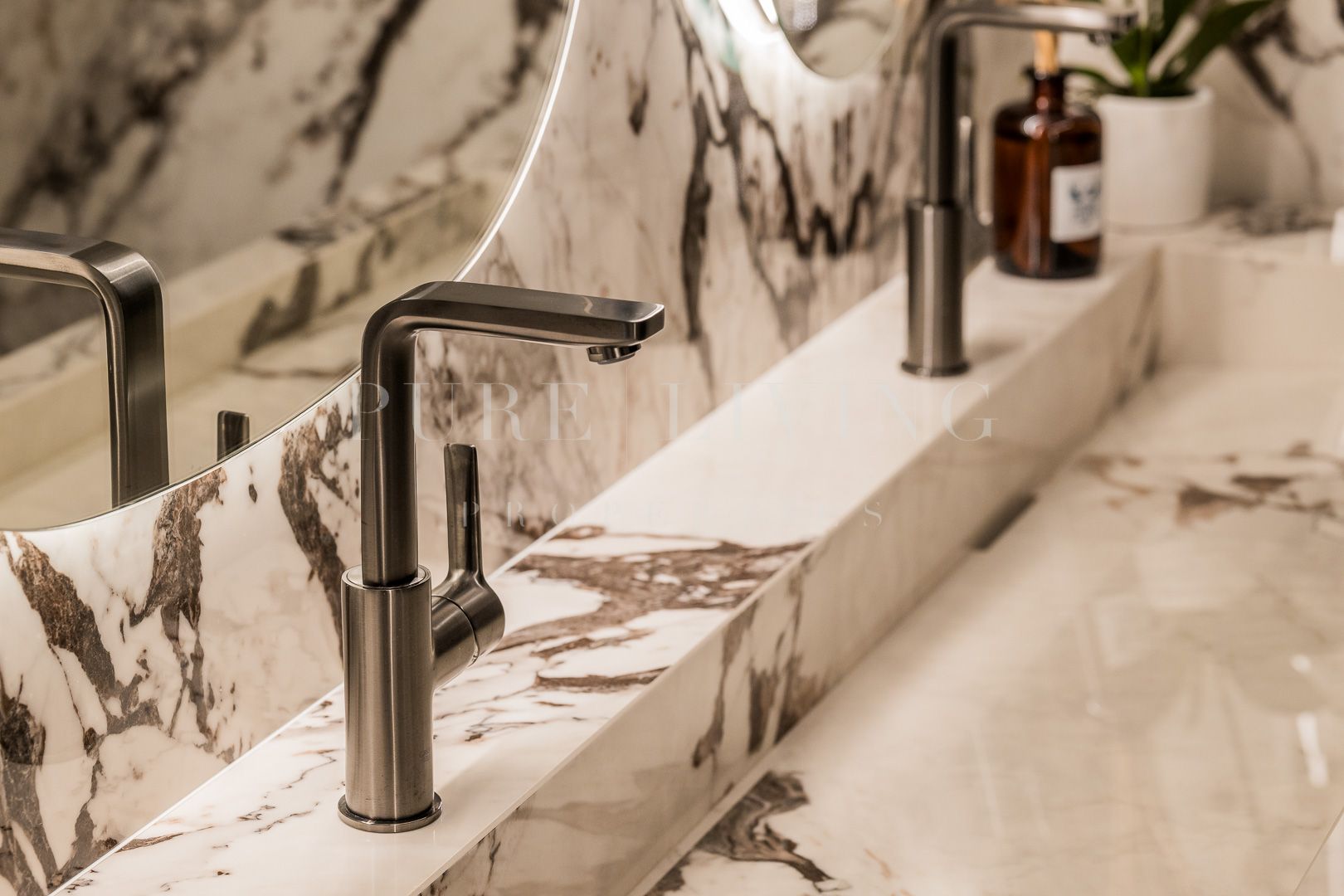 Met drie lichte slaapkamers en twee badkamers in spa-stijl biedt de woning een perfecte balans tussen luxe en comfort. De hoofdslaapkamer beschikt over directe toegang tot het terras en uitzicht op zee, evenals een stijlvolle en-suite badkamer. Ook de gastenkamers zijn uitnodigend, met veel opbergruimte en natuurlijk licht.