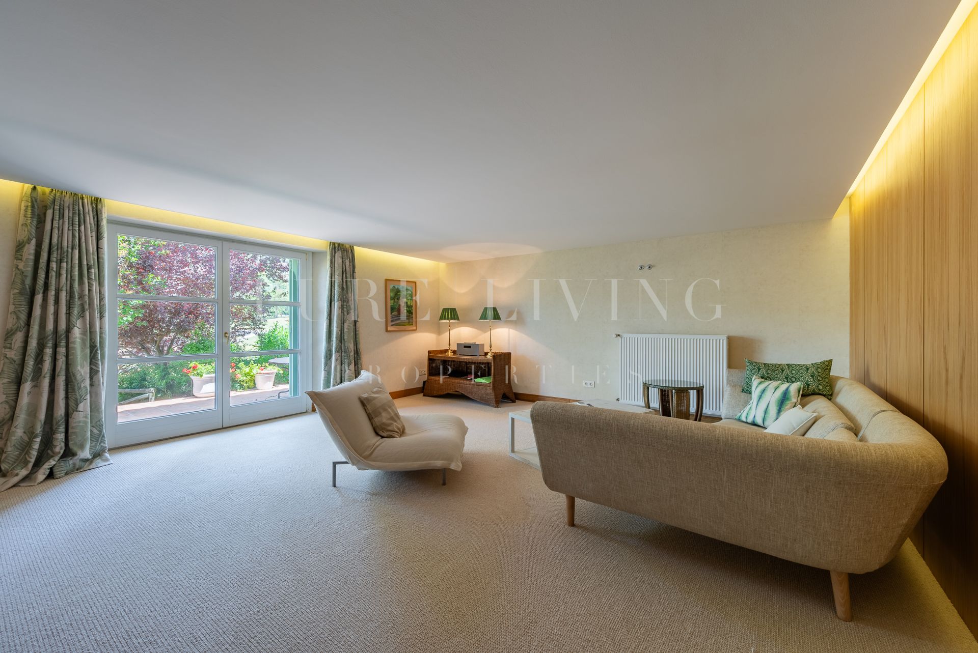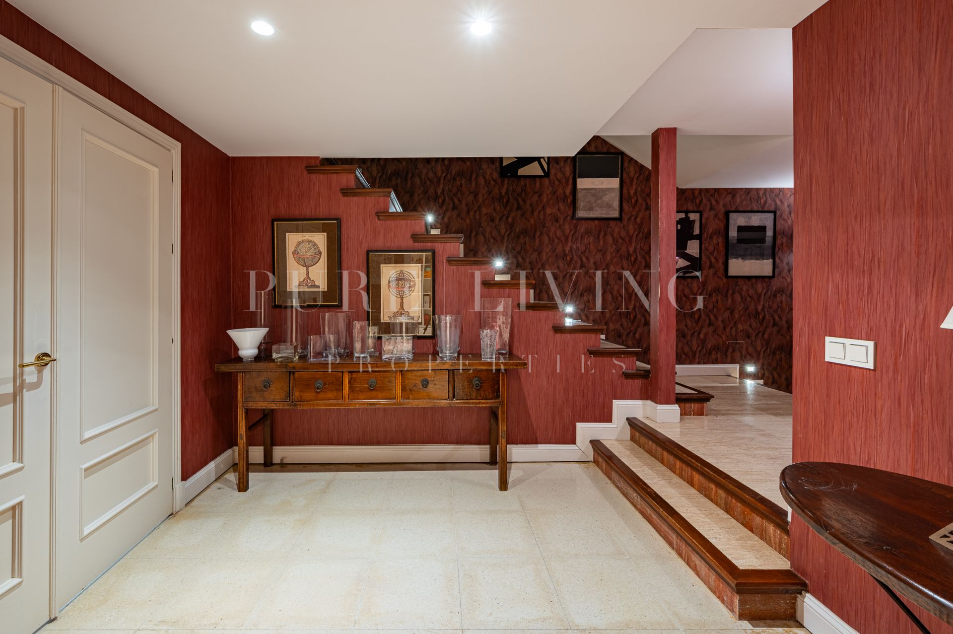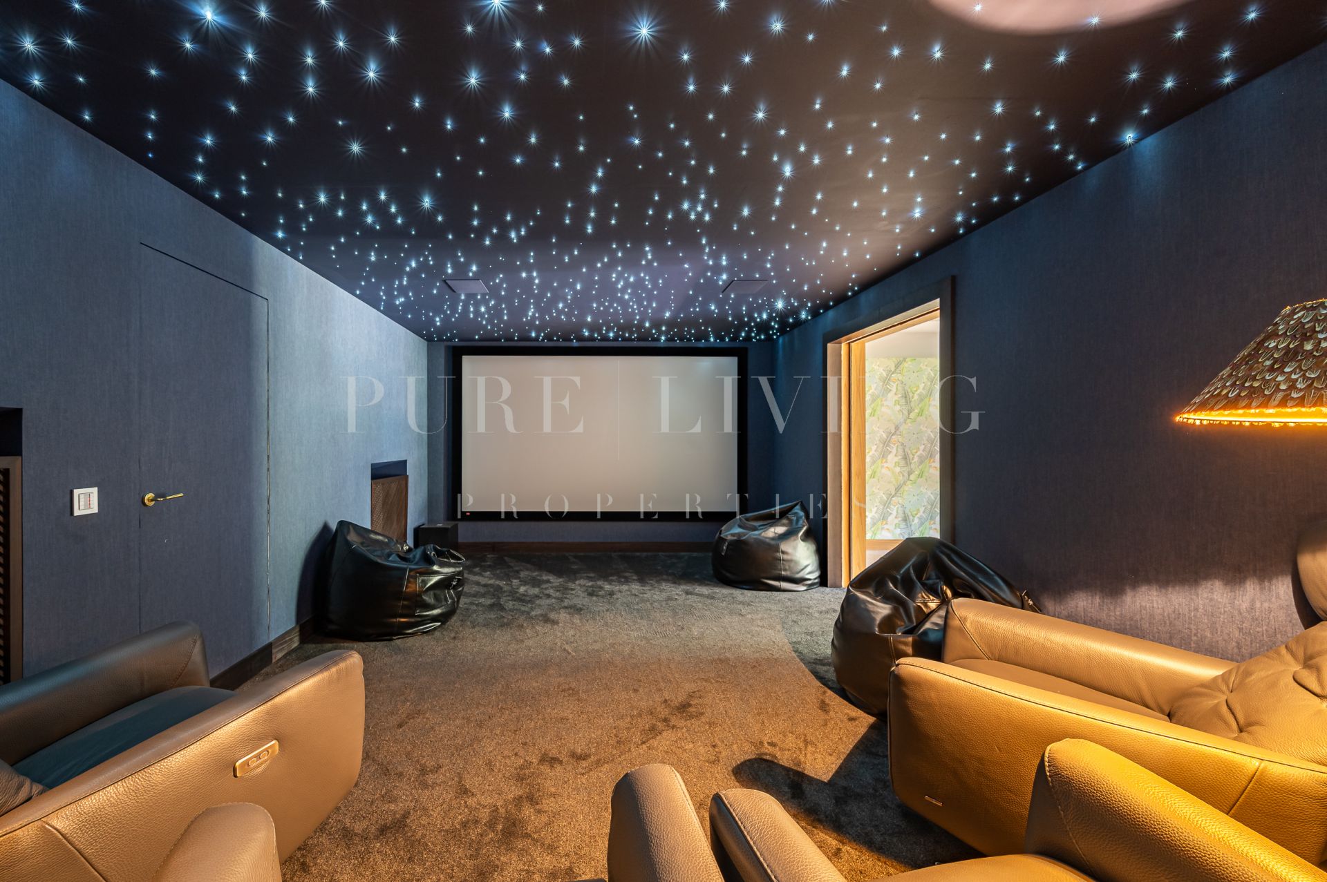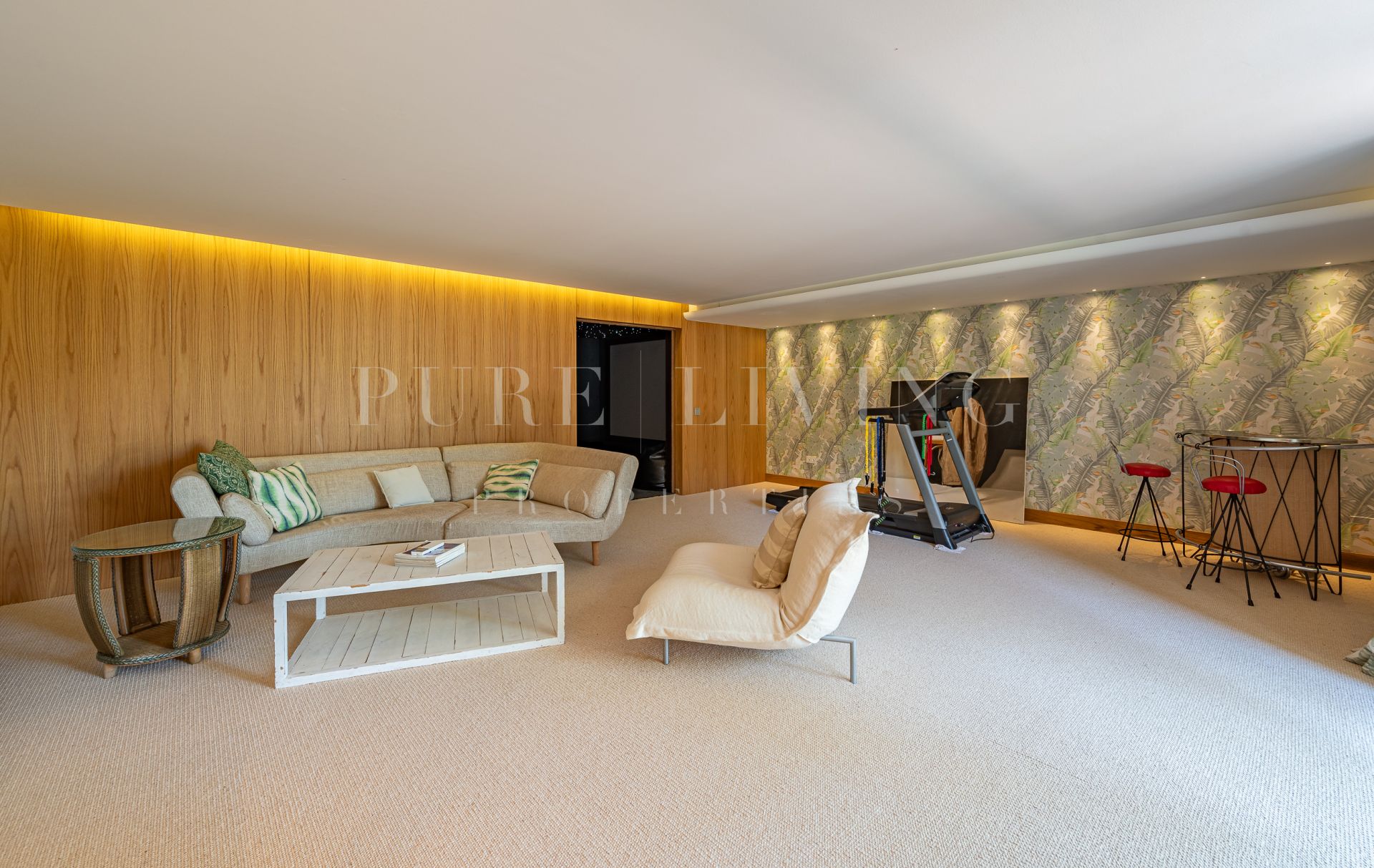 De benedenverdieping van de villa ligt op tuinniveau, waardoor natuurlijk licht de hele verdieping overspoelt. Het is verdeeld in een slaapkamersuite, thuisbioscoop, fitnessruimte met directe toegang tot het zwembad, wasruimte, bijkeuken, technische ruimte, opslagruimtes en een garage voor vier auto’s. Op deze verdieping bevindt zich ook een onafhankelijke flat met twee slaapkamers en een badkamer, voor gasten of personeel. Er is nog een onafhankelijke slaapkamer suite met toegang vanuit de tuin.