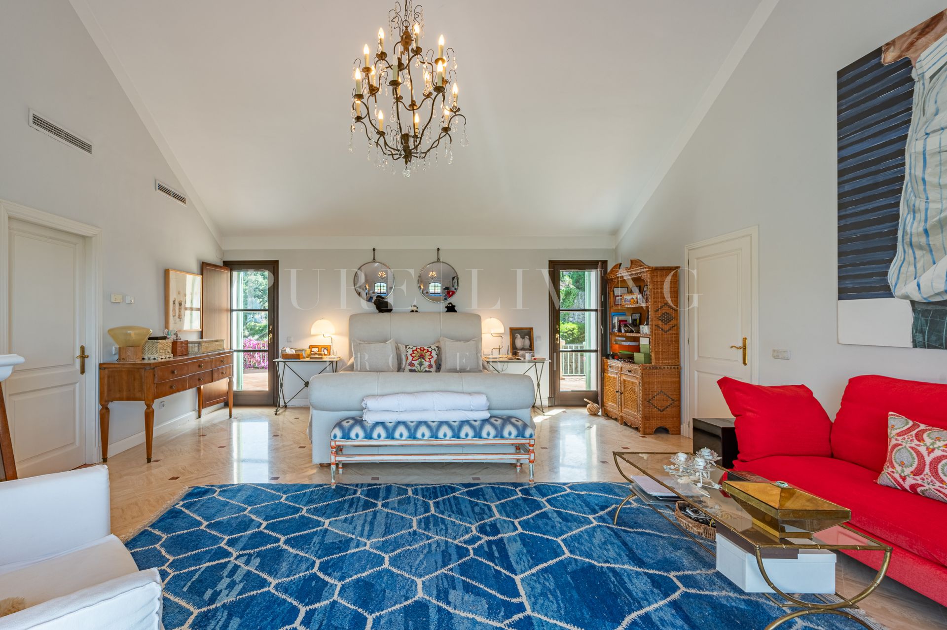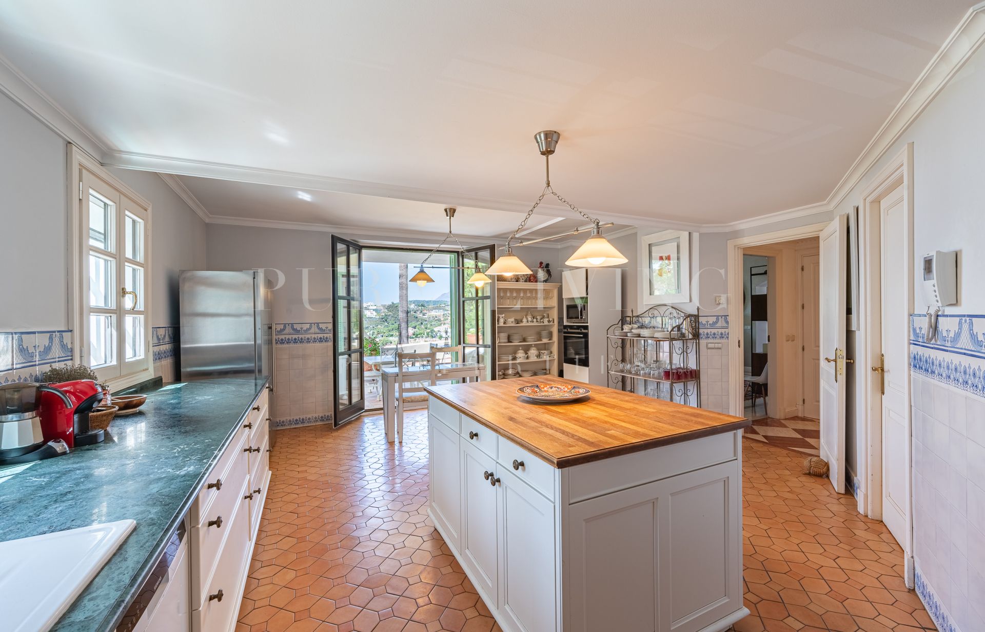 Het huis biedt een eerste gastenslaapkamer, naast de hoofdingang, en suite, buiten en onafhankelijk met uitzicht over de golfbaan. De ruime entreehal, boordevol natuurlijk licht, biedt toegang tot de belangrijkste ruimtes van het huis. Op de hoofdverdieping, een grote woonkamer van 70 m2 met open haard, aparte eetkamer met toegang tot de keuken, woonkamer en TV; De keuken is in klassieke stijl met eiland en alle moderne apparatuur voor een gastronomische keuken met de bijbehorende bijkeuken. Gastentoilet.