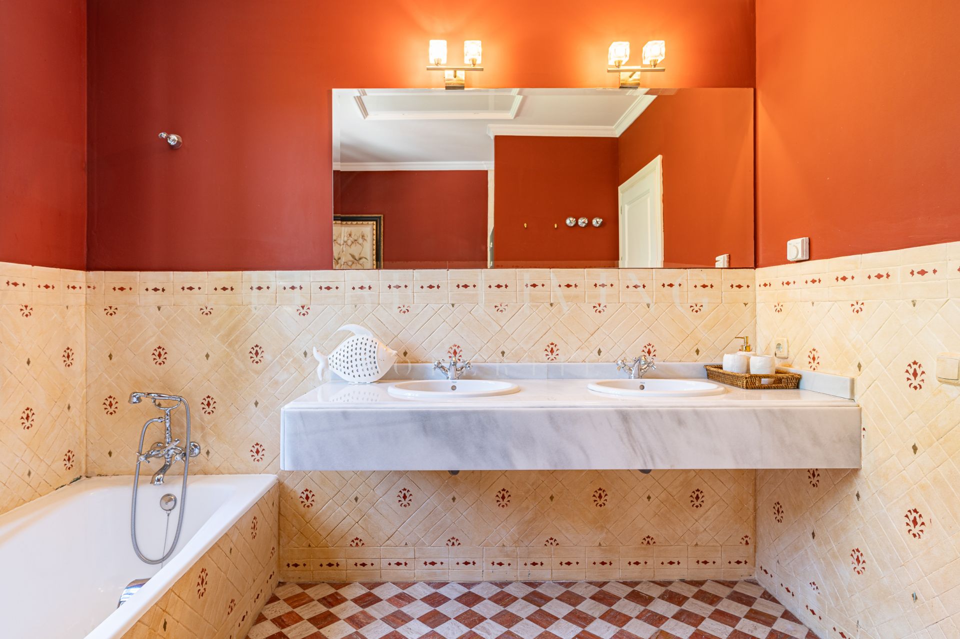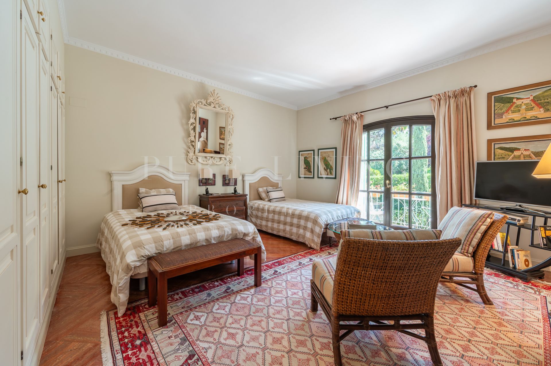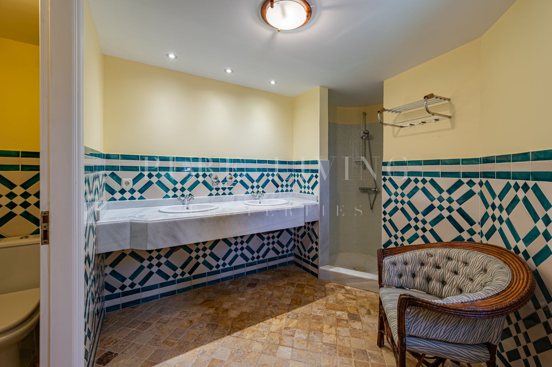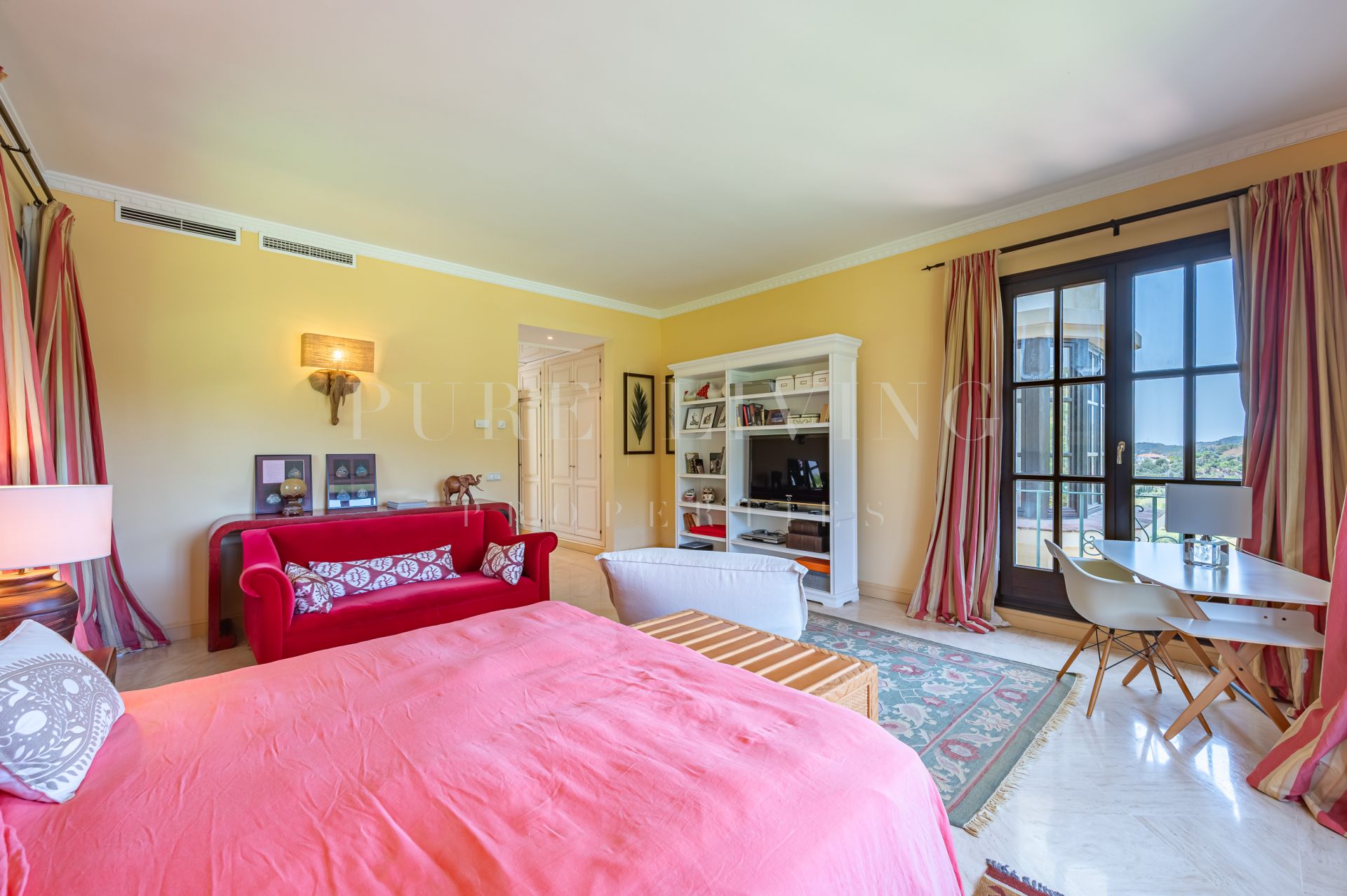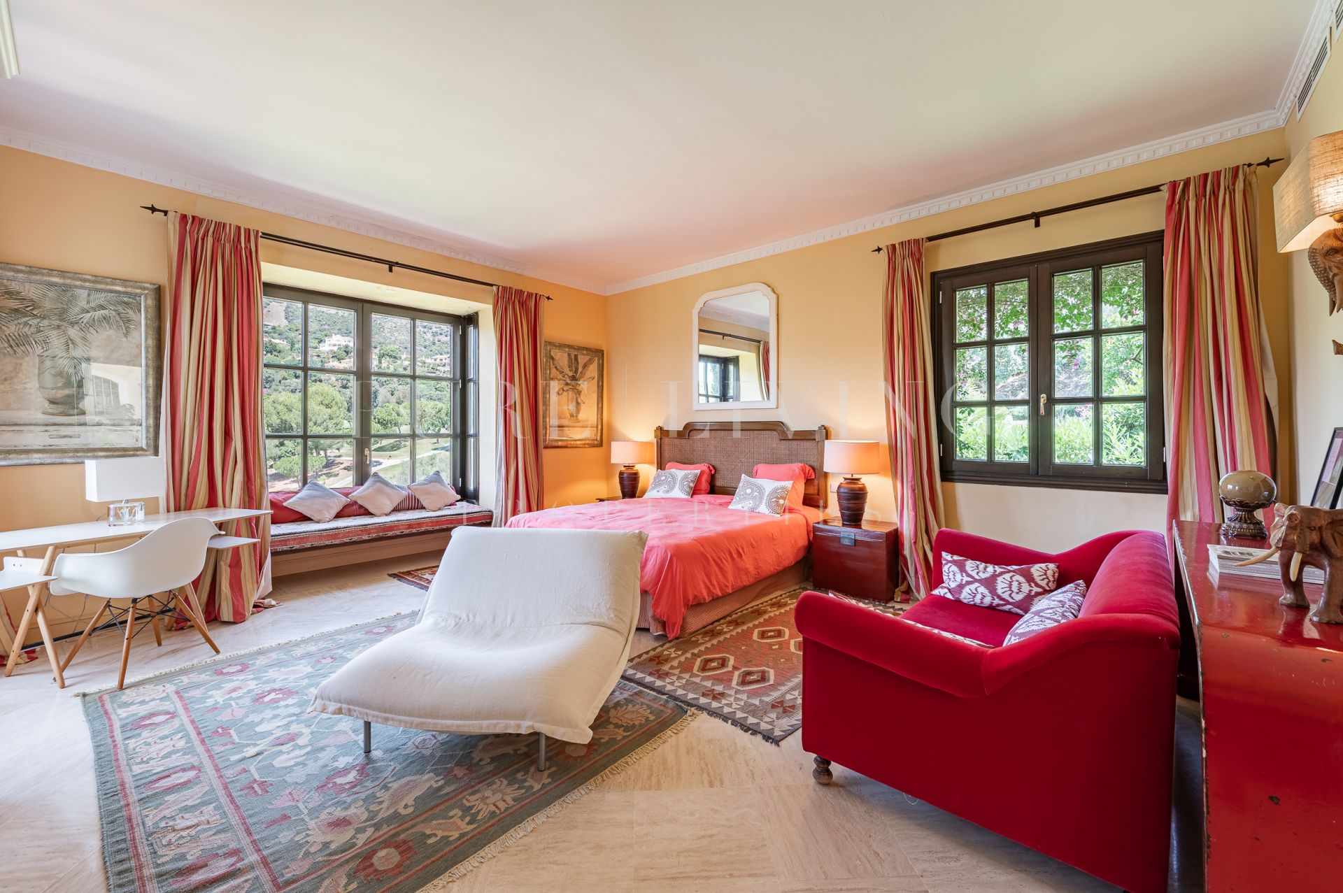 Op de bovenverdieping is de master bedroom suite met open haard, zijn en haar badkamers en kleedkamers, een grote zithoek met open haard en twee terrassen, waarvan een op het zuiden waar het uitzicht echt indrukwekkend is. Op hetzelfde niveau zijn er nog twee tweepersoonsslaapkamers met eigen badkamer, een met een romantisch balkon met uitzicht op de binnenplaats en de andere met toegang tot het grote terras met uitzicht op de tuin.