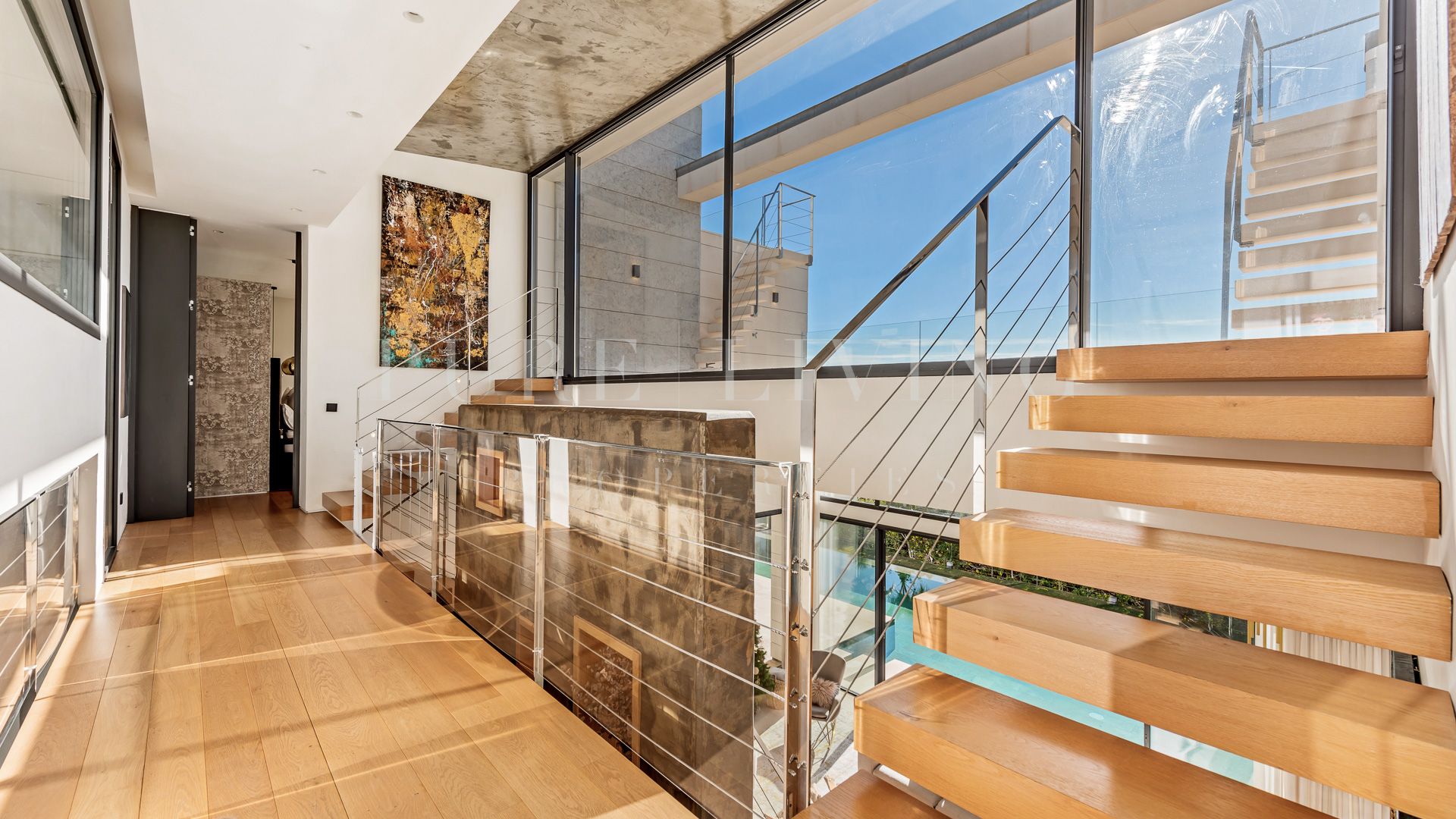Door de zuidelijke oriëntatie baadt de woning in natuurlijk licht, wat de warme en uitnodigende sfeer versterkt. Met een oppervlakte van maar liefst 866 m² is dit huis een toonbeeld van zorgvuldige aandacht voor detail, waarbij moderne architectuur het karakter bepaalt.