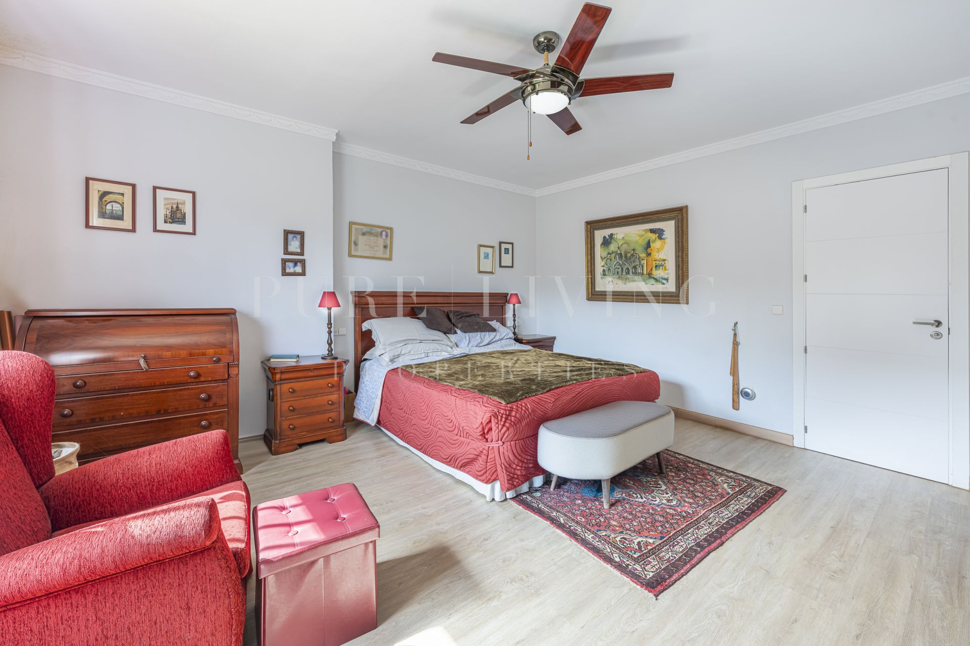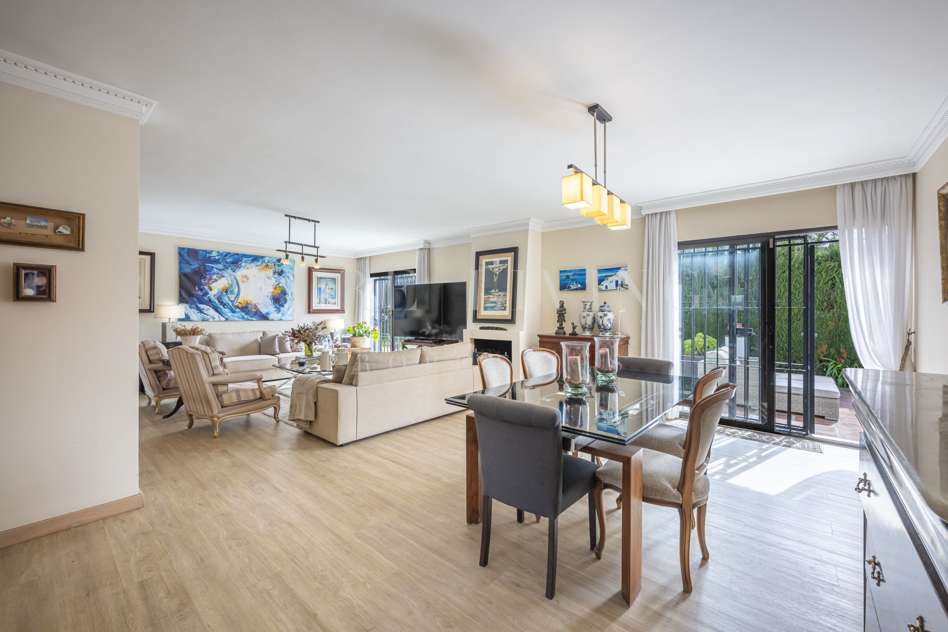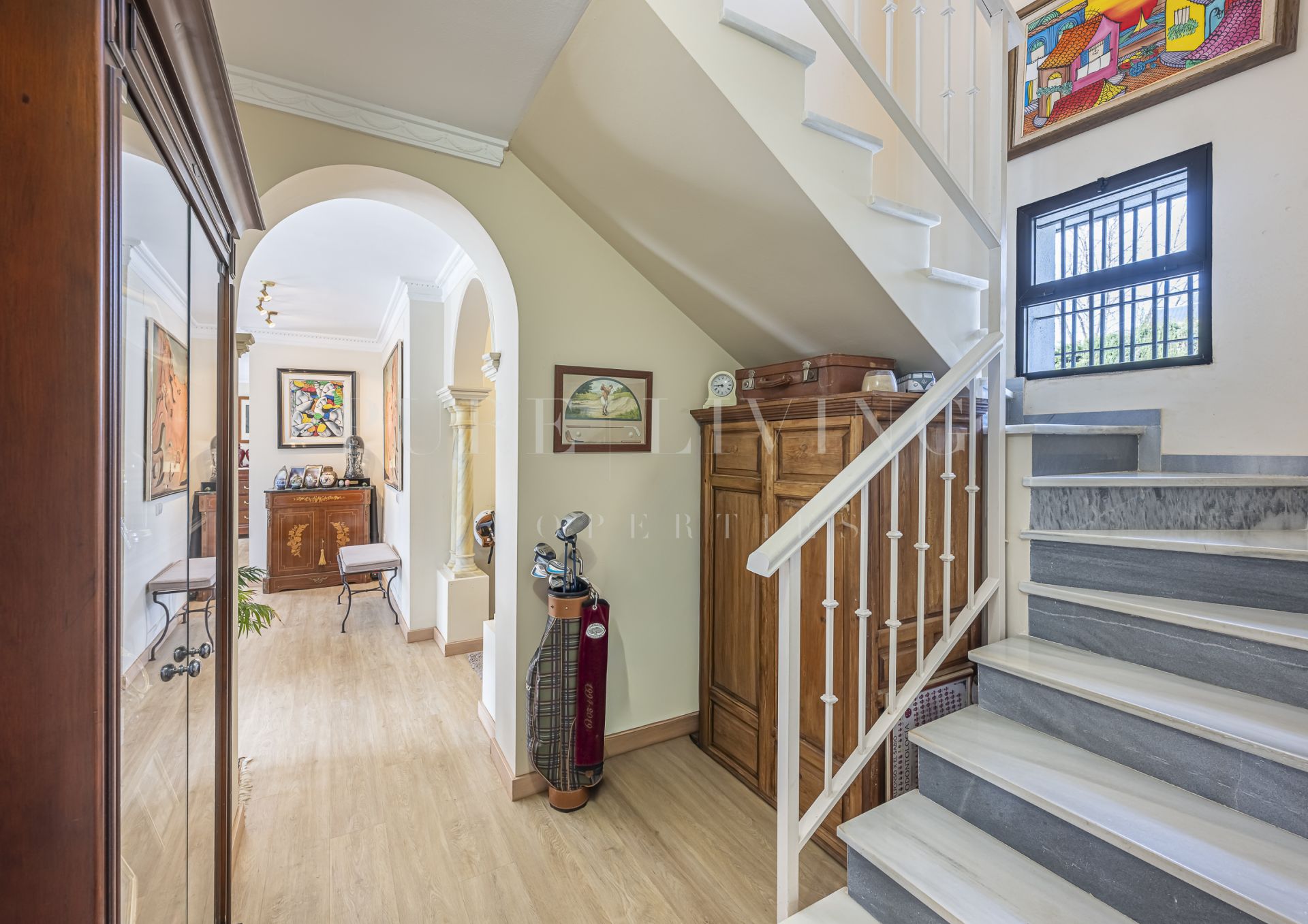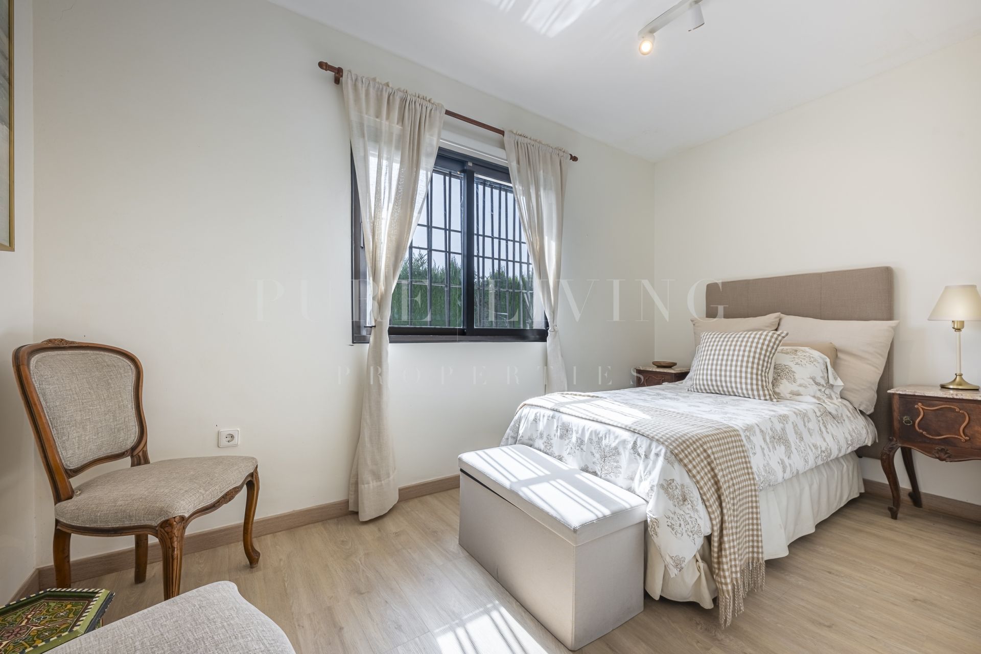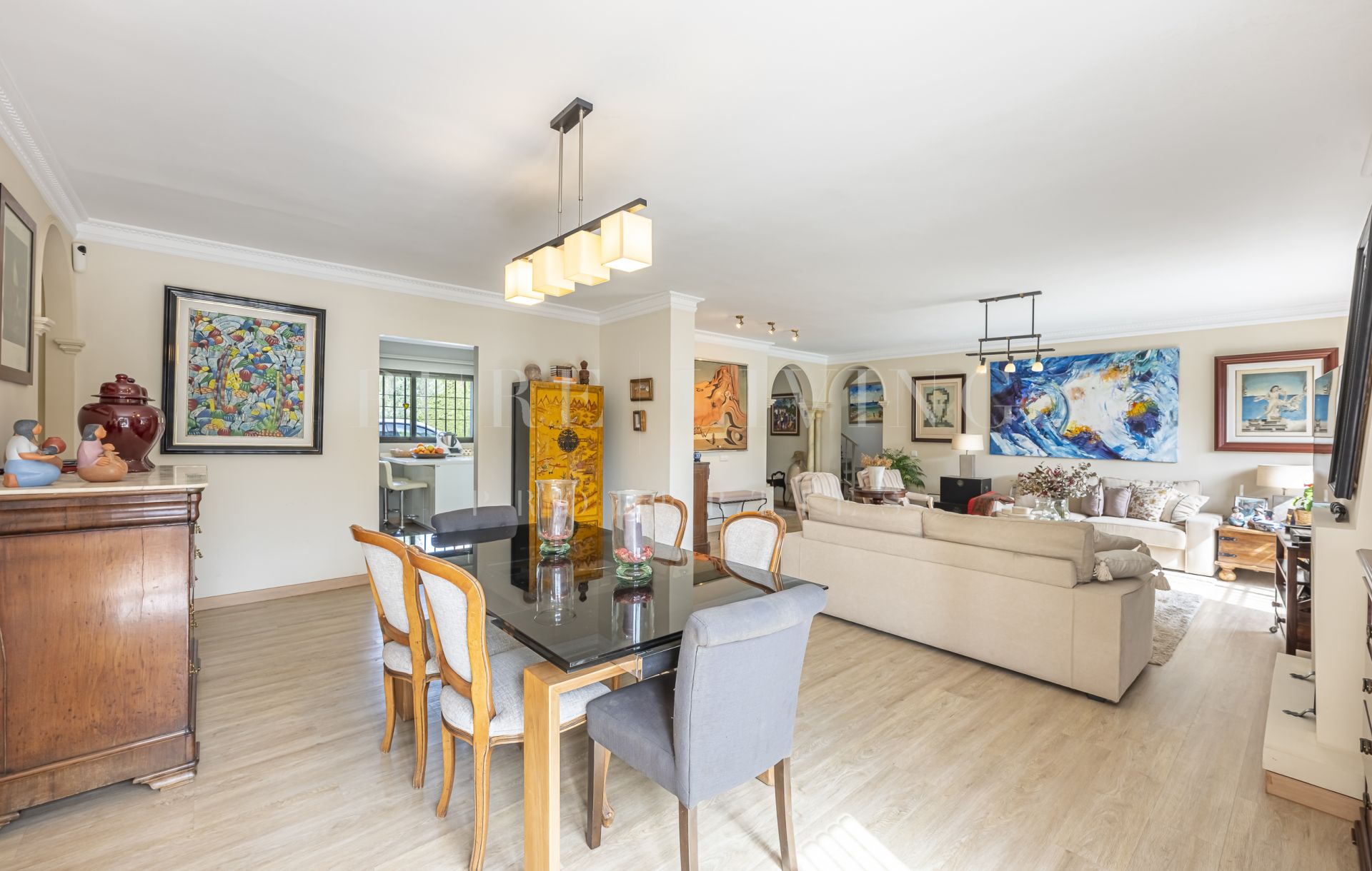 De villa beschikt over een lichte en ruime woonkamer met grote glazen deuren die uitkomen op een privéterras, waardoor een naadloze overgang tussen binnen en buiten ontstaat. Een aparte eetkamer en prachtige parket- en houten vloeren zorgen overal voor warmte en elegantie. Alle slaapkamers zijn royaal bemeten, inclusief een goed ingerichte gastenkamer.