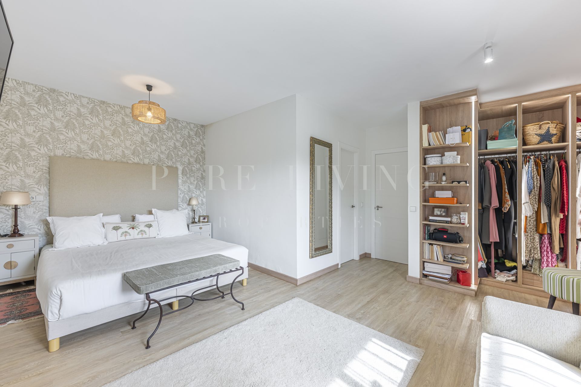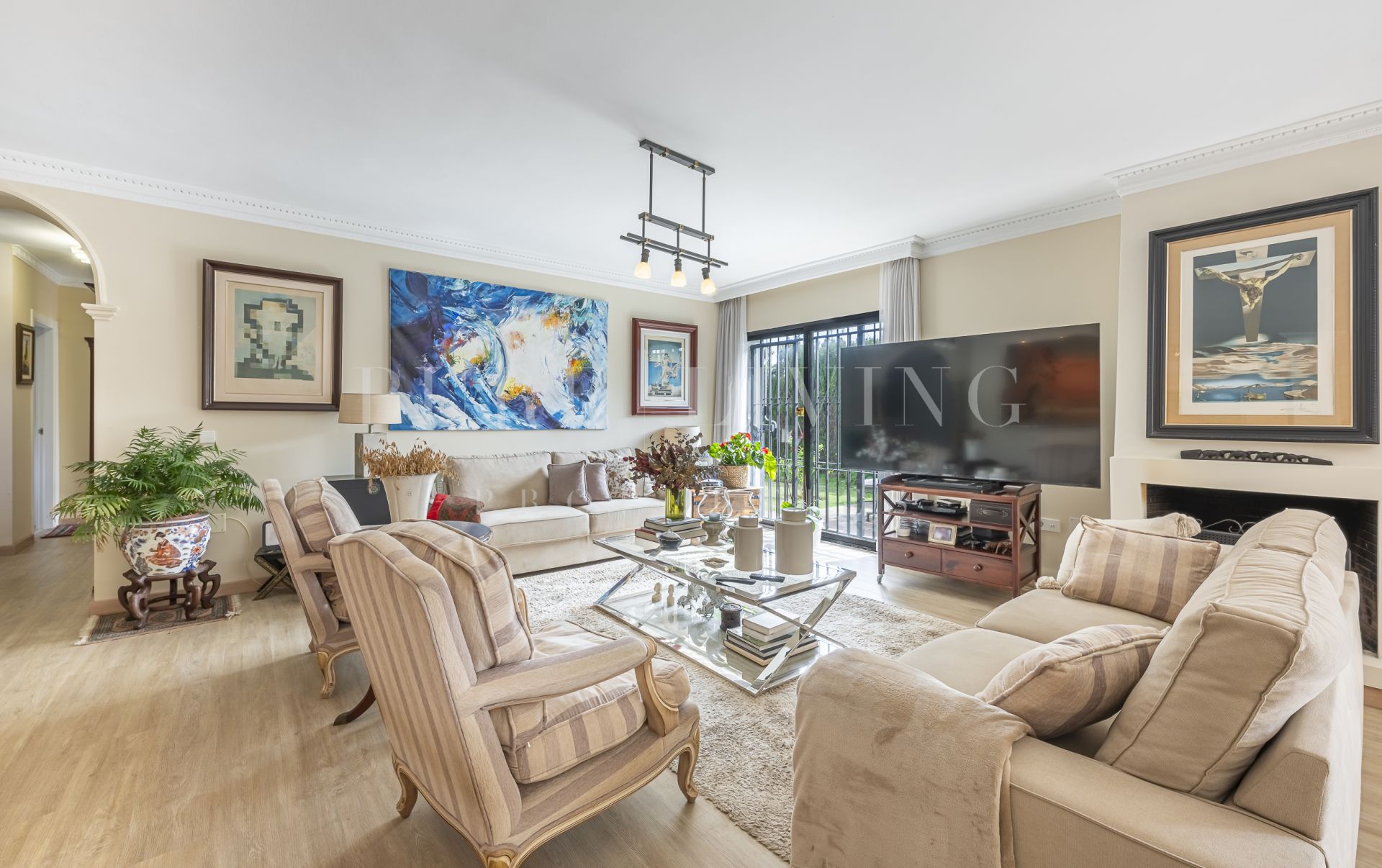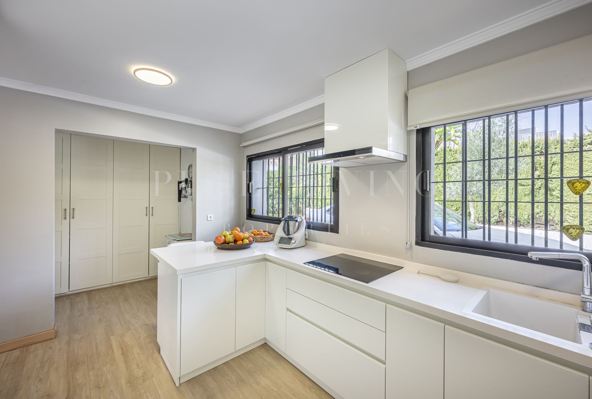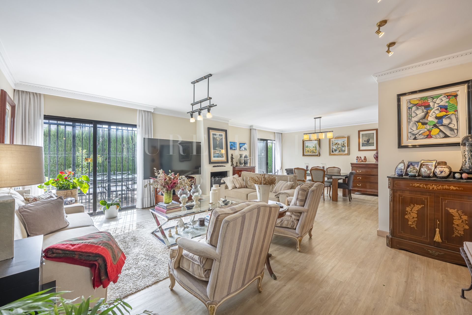 De villa beschikt over een lichte en ruime woonkamer met grote glazen deuren die uitkomen op een privéterras, waardoor een naadloze overgang tussen binnen en buiten ontstaat. Een aparte eetkamer en prachtige parket- en houten vloeren zorgen overal voor warmte en elegantie. Alle slaapkamers zijn royaal bemeten, inclusief een goed ingerichte gastenkamer.