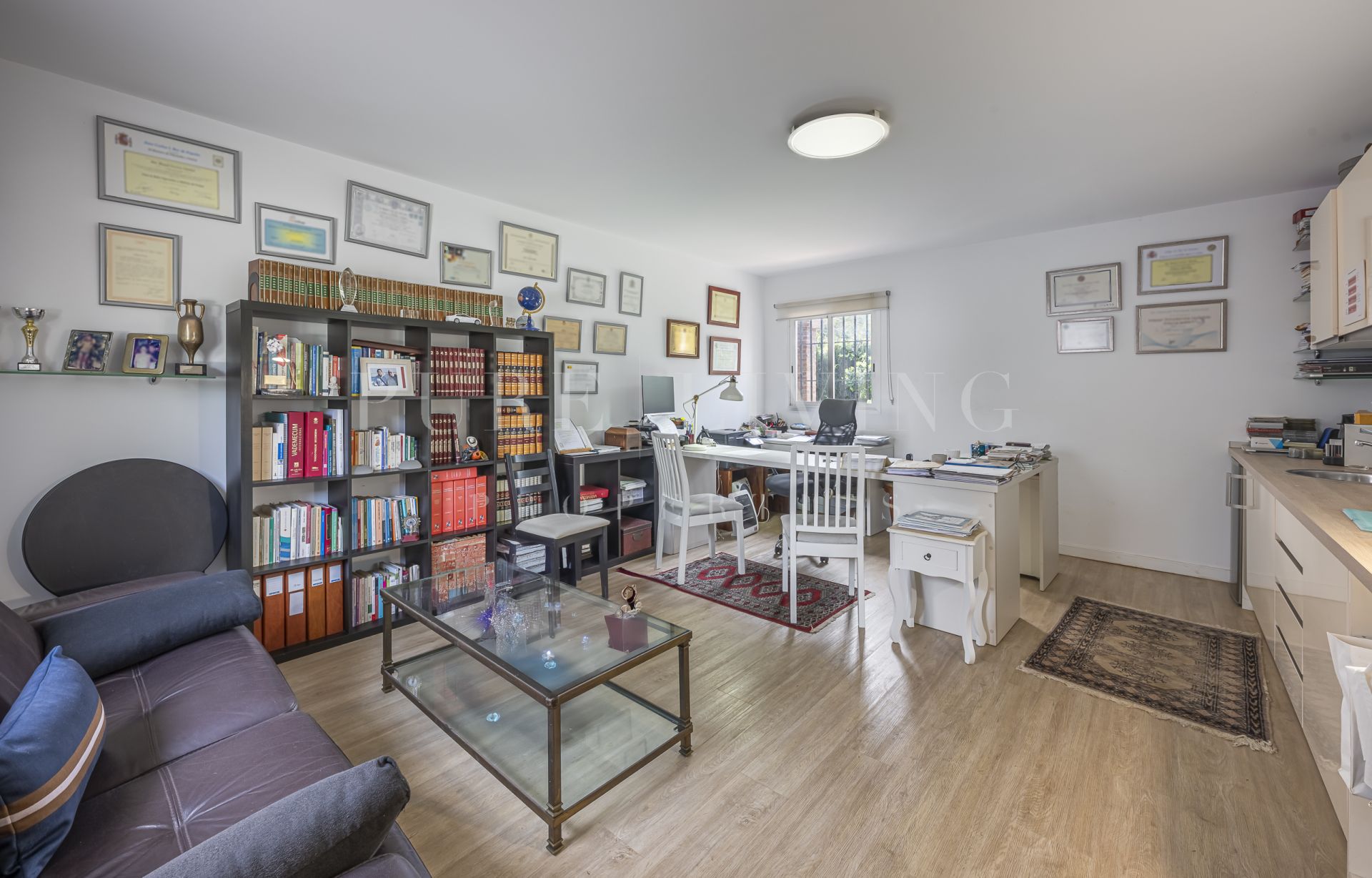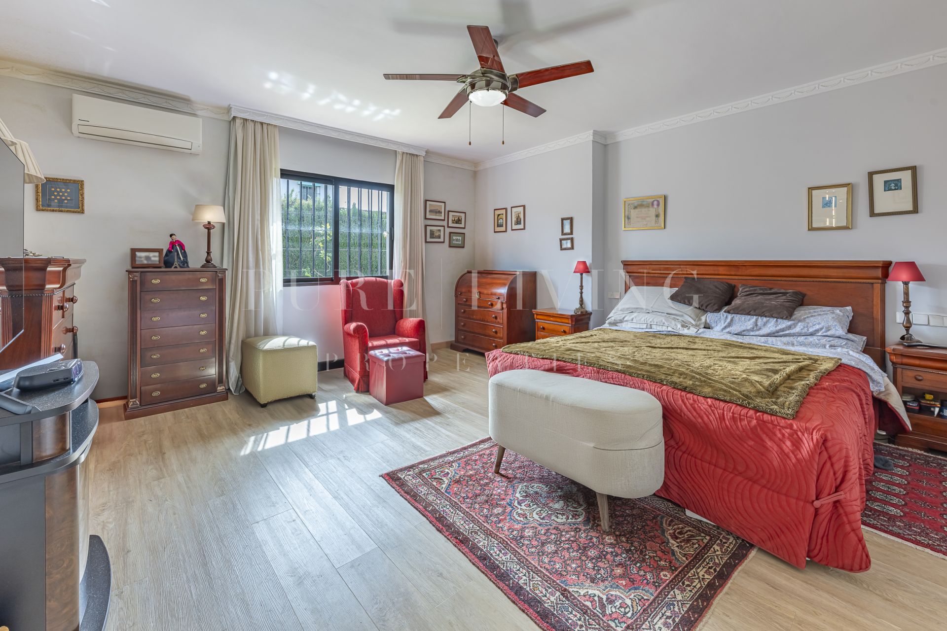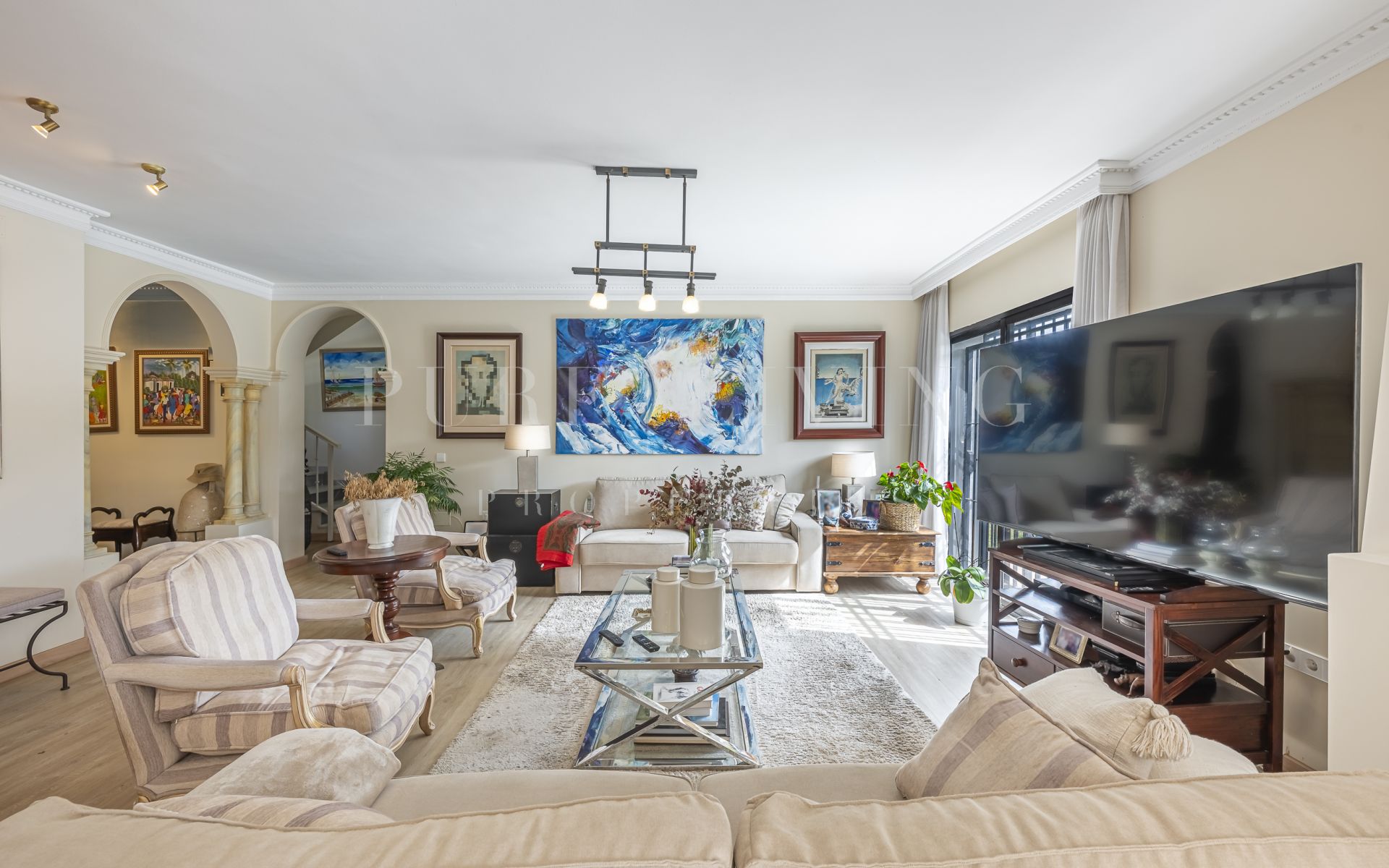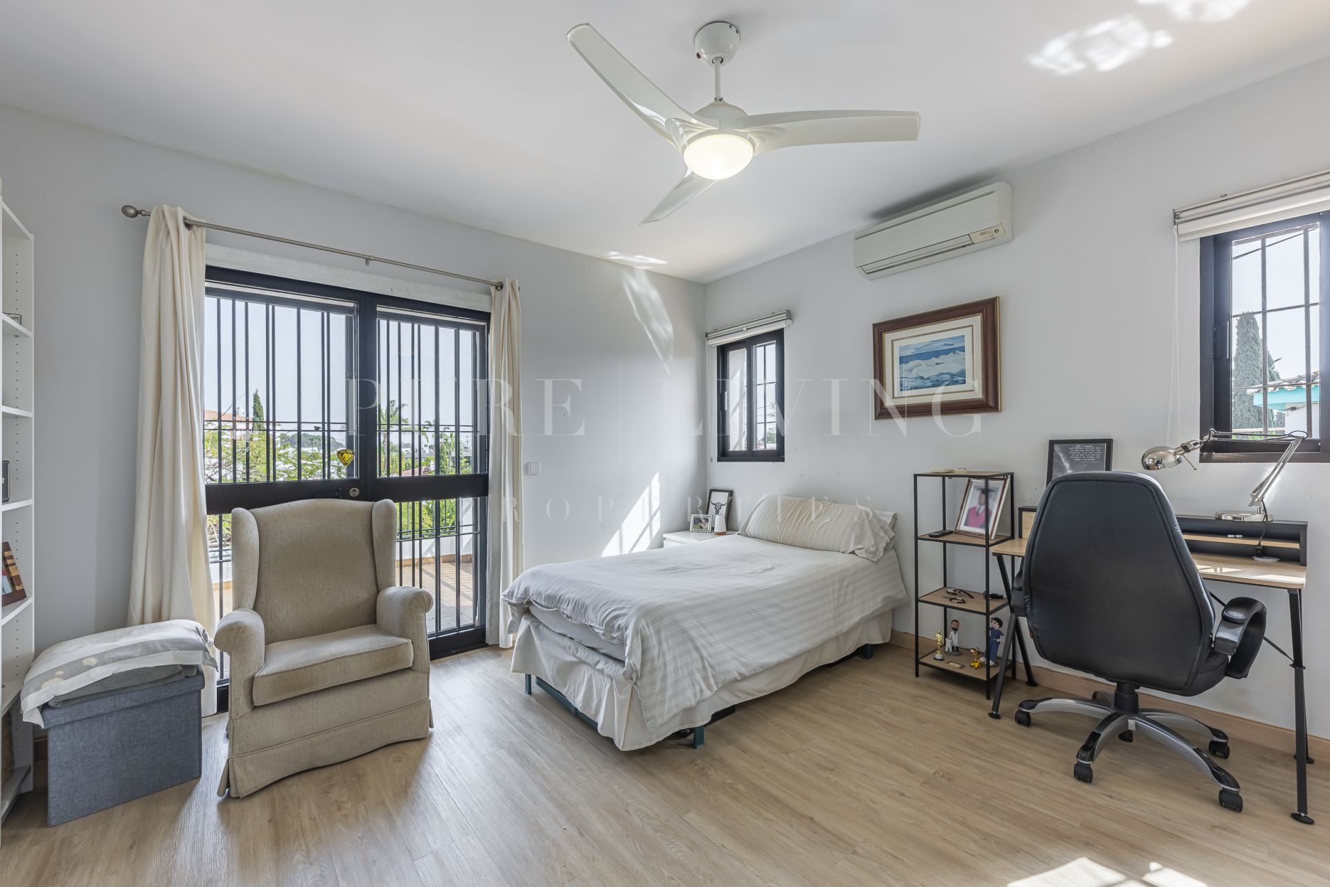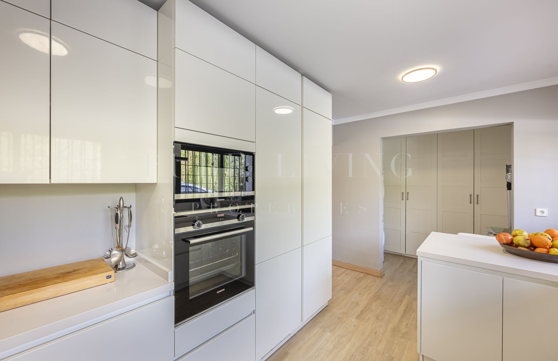 De villa beschikt over een lichte en ruime woonkamer met grote glazen deuren die uitkomen op een privéterras, waardoor een naadloze overgang tussen binnen en buiten ontstaat. Een aparte eetkamer en prachtige parket- en houten vloeren zorgen overal voor warmte en elegantie. Alle slaapkamers zijn royaal bemeten, inclusief een goed ingerichte gastenkamer.