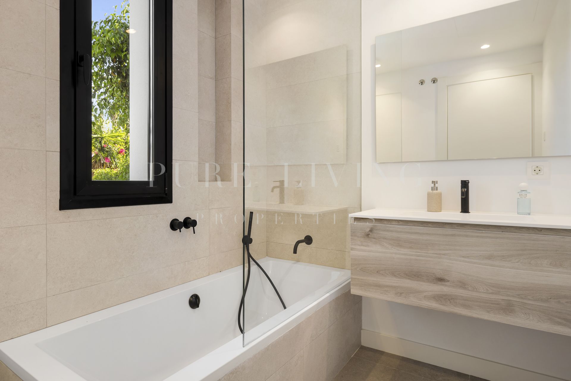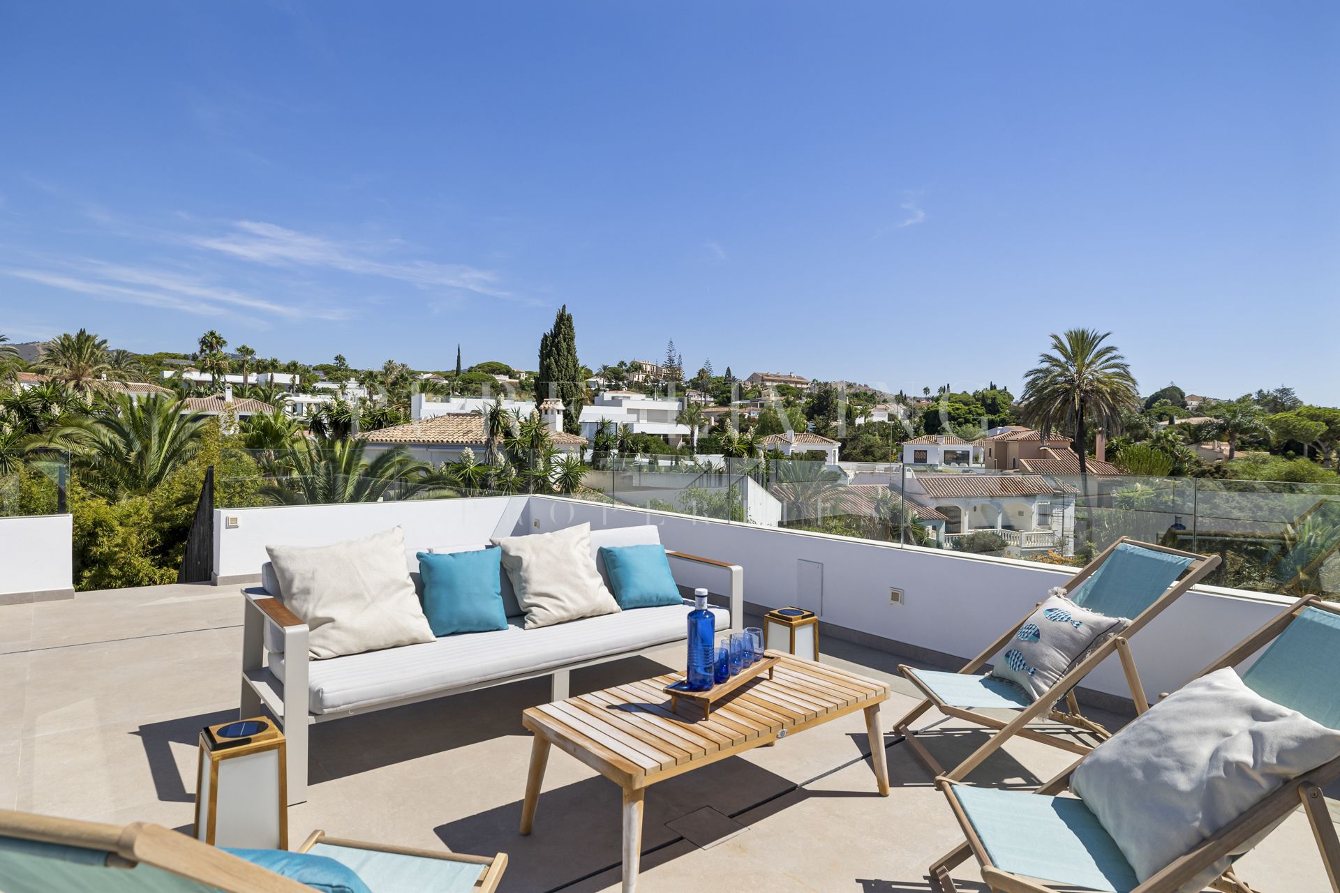 De buitenruimtes van deze villa zijn ontworpen om optimaal te genieten van het uitzonderlijke klimaat van Marbella. De prachtig aangelegde tuin omringt een opvallend infinity pool en biedt een rustige plek om te zwemmen, zonnebaden of stijlvol te loungen. Aangrenzend aan het zwembad bevindt zich een schaduwrijk terras, perfect om buiten te dineren, terwijl het ruime dakterras een adembenemend panoramisch uitzicht op de Middellandse Zee biedt – de ideale plek om te ontspannen met een cocktail bij zonsondergang of om vrienden te vermaken onder de sterrenhemel.