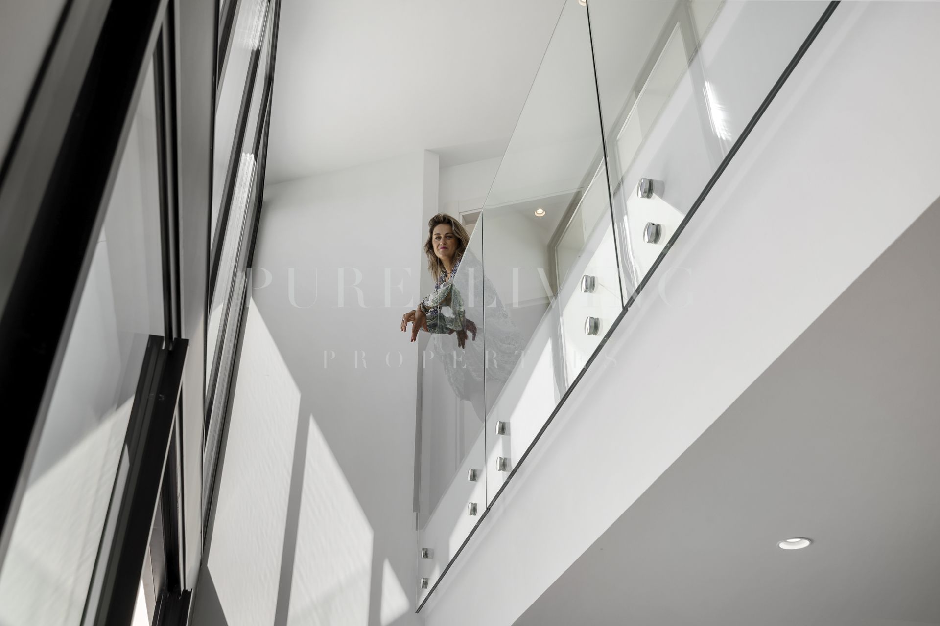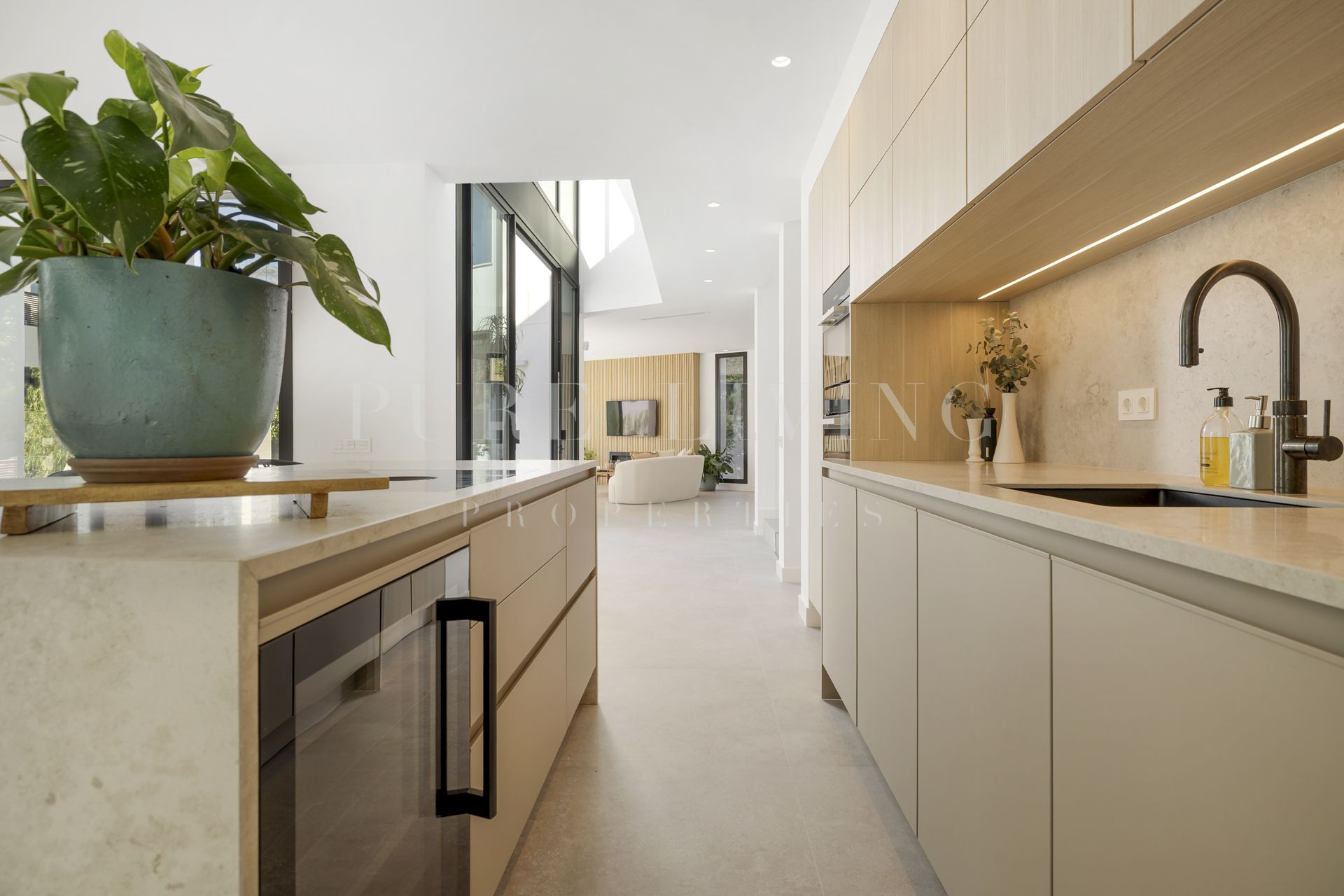 Het hart van de woning is een prachtige open woon- en eetkamer, badend in natuurlijk licht dankzij grote ramen van vloer tot plafond en glazen schuifdeuren die naadloos aansluiten op de buitenruimtes. De ultramoderne keuken is volledig uitgerust met hoogwaardige apparatuur, strakke kasten en een groot kookeiland – ideaal voor zowel dagelijks gebruik als het ontvangen van gasten. Hoge plafonds, neutrale tinten en hoogwaardige afwerkingen in de hele villa creëren een sfeer van ingetogen luxe en ruimtelijkheid.