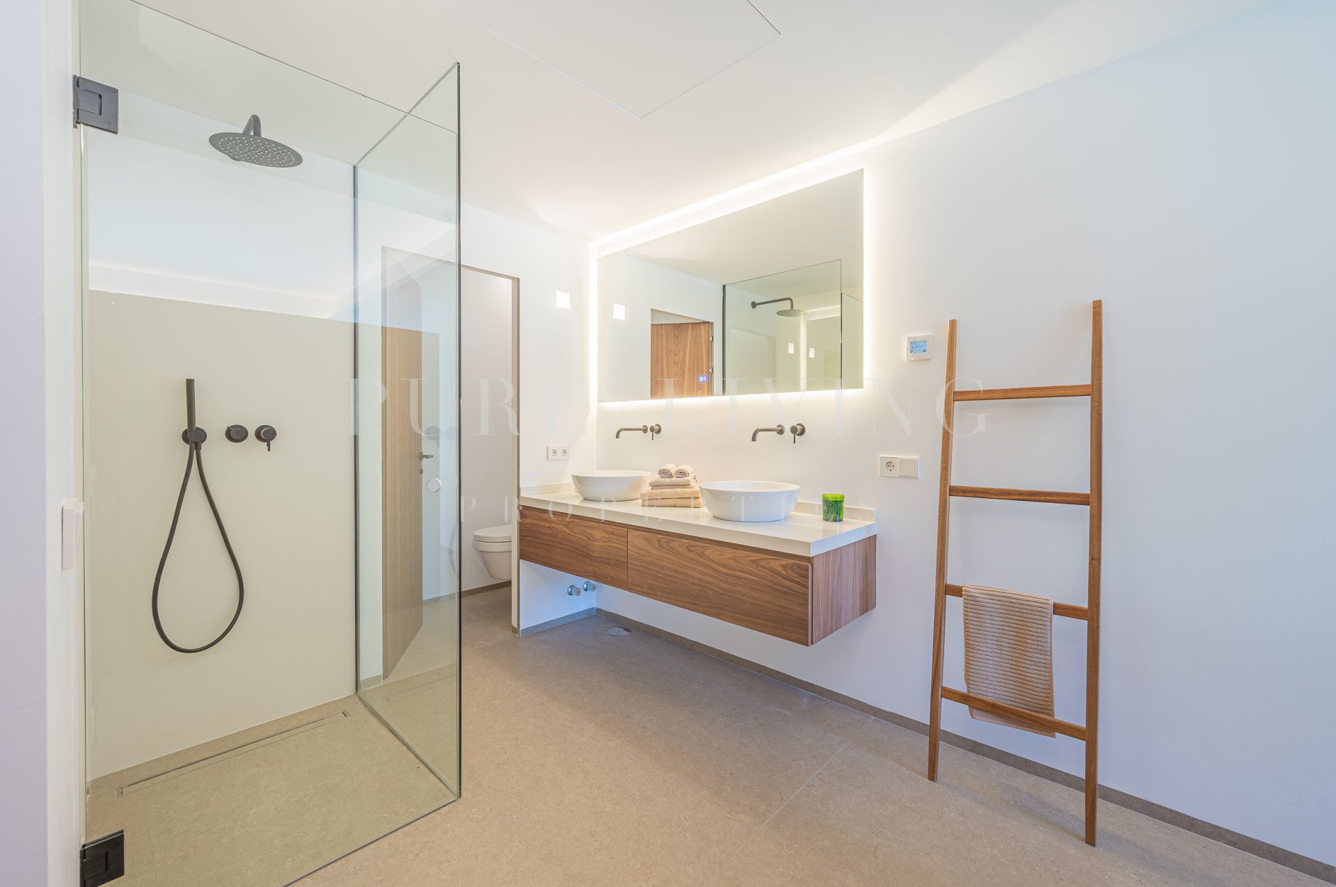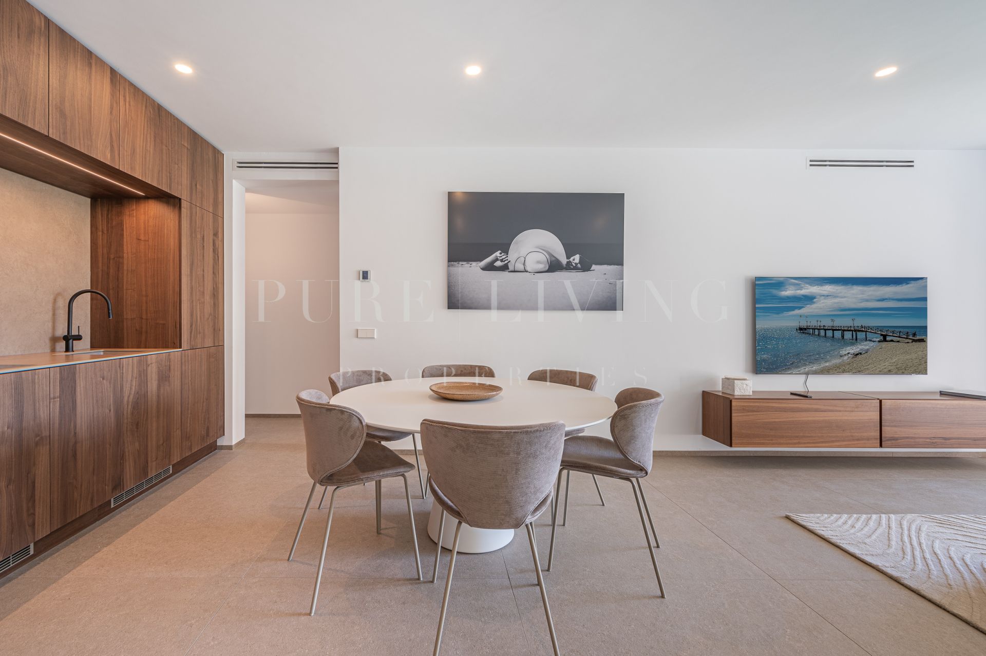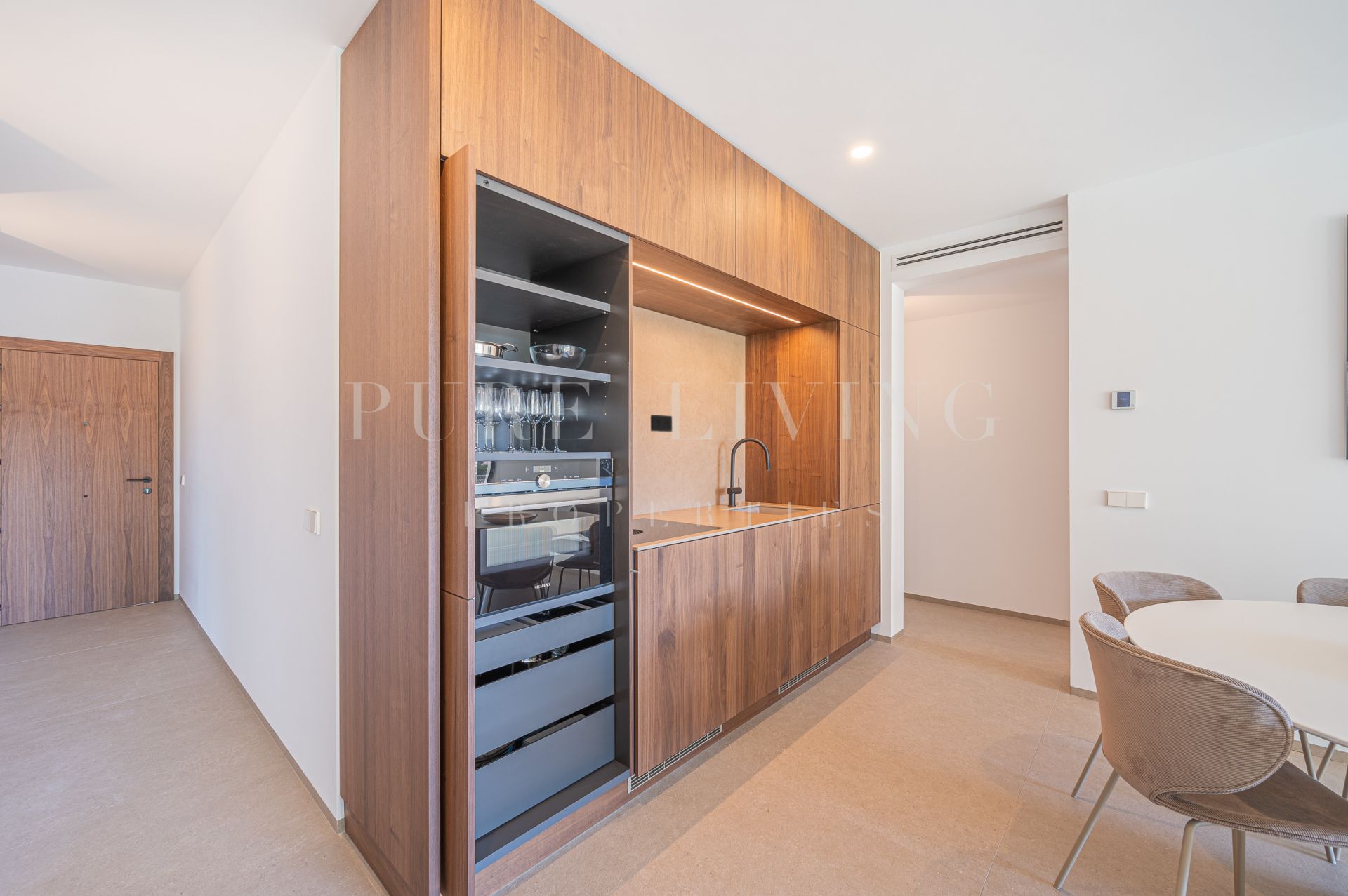 Het open keukenconcept is ontworpen in Duitsland, met natuurlijk houtfineer. De grote 120cm x 120cm vloertegels geven een moderne uitstraling, terwijl het Airzone airconditioning systeem en de vloerverwarming in de badkamers het hele jaar door voor comfort zorgen.
