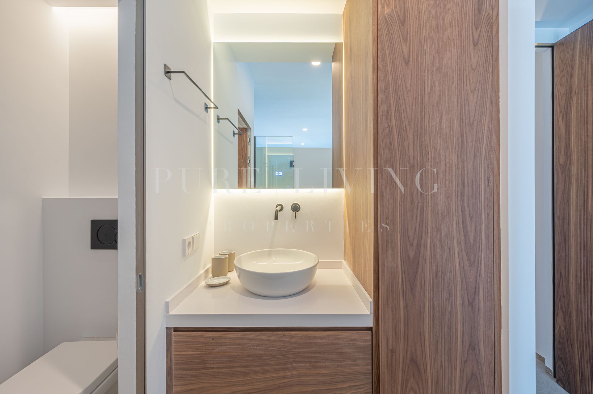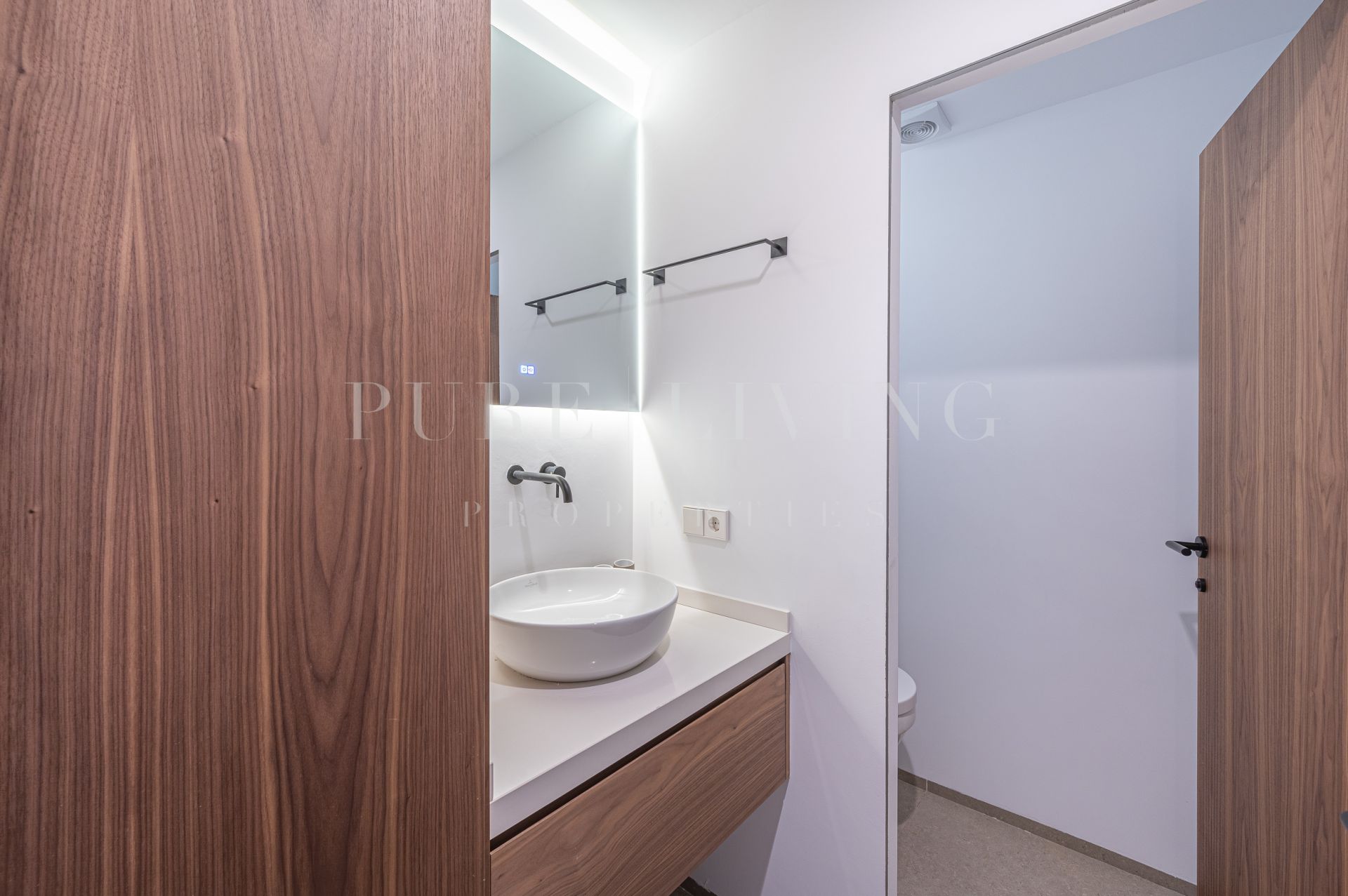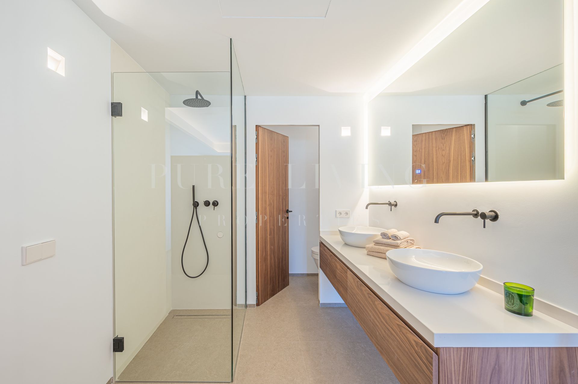 Het open keukenconcept is ontworpen in Duitsland, met natuurlijk houtfineer. De grote 120cm x 120cm vloertegels geven een moderne uitstraling, terwijl het Airzone airconditioning systeem en de vloerverwarming in de badkamers het hele jaar door voor comfort zorgen.